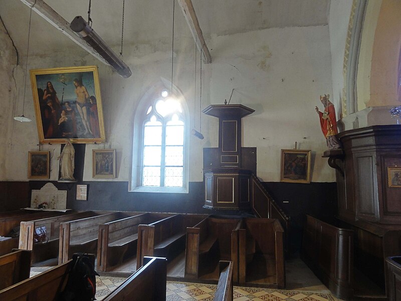 Le mobilier, cohérent et largement issu du XIXe siècle, contribue à l'ambiance chaleureuse de cette petite église rurale ; il comprend des bancs de fidèles avec cloisons, la chaire datée de 1816, un ensemble de poutre de gloire avec un Christ en croix et deux statues probablement antérieures à la Révolution, les fonts baptismaux octogonaux attribués au XVIe siècle, ainsi qu'un maître-autel ancien avec bas-relief de la Cène et un retable de facture mêlant influences renaissantes et baroques. Dans la nef se trouve une copie tardive du retable de Casio attribuée à Giovanni Antonio Boltraffio, et dans la chapelle sud un retable rococo abritant une Vierge réalisée lors d'une modification datée de 1855 ; les vitraux actuels, en grande partie de verre blanc ponctué de losanges bleus et violets, remplacent des verrières brisées en 1940 et illustrent notamment un baptême et un mariage.