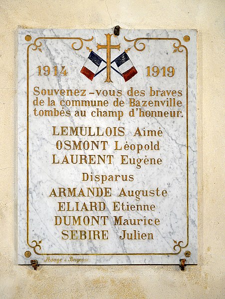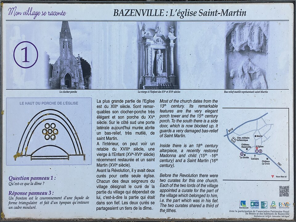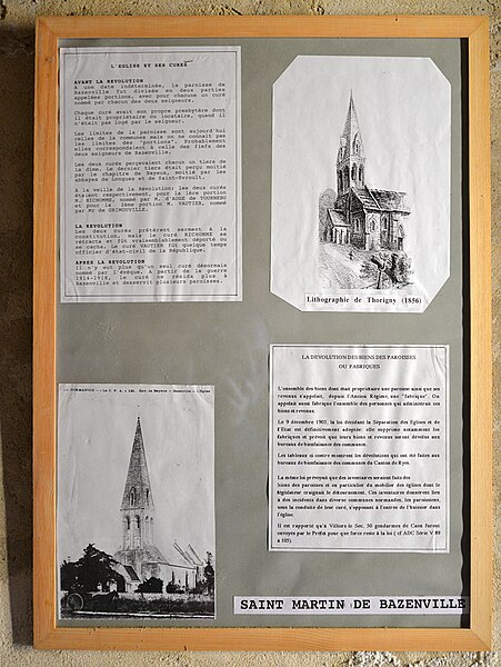 L'église Saint-Martin, église catholique située à Bazenville dans le Calvados, est un édifice du XIIIe siècle représentatif des constructions du Bessin de cette époque. Elle présente un plan en vaisseau unique, flanqué à l'ouest d'une tour-clocher qui jouxte un porche et à l'est d'un chœur voûté d'ogives à chevet plat. Le clocher constitue l'élément majeur de la composition architecturale. La maçonnerie des murs est soignée et la nef conserve une charpente apparente rythmée par de puissants entraits. Des aménagements ont été réalisés aux XVe et XVIe siècles, notamment l'adjonction du porche ouest. En 1886, un carrelage en céramique d'Aumenil a été posé par Cauvin, entrepreneur à Esquay‑sur‑Seulles. L'édifice a été classé au titre des monuments historiques en 1917 et inscrit en 2000.