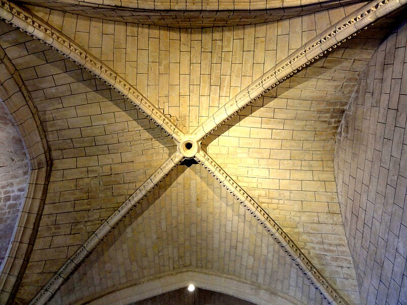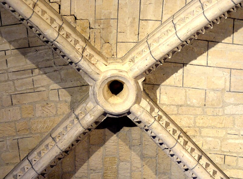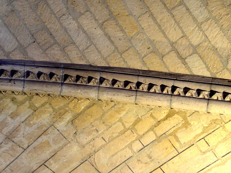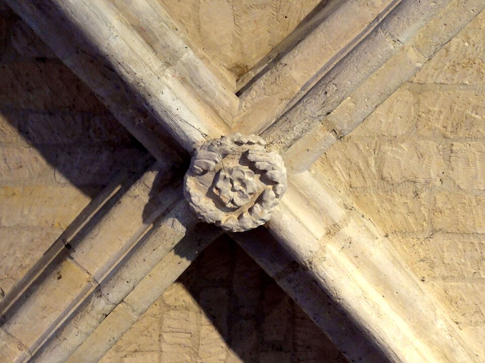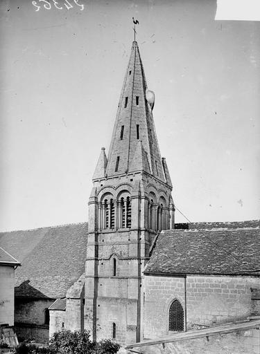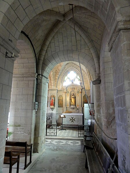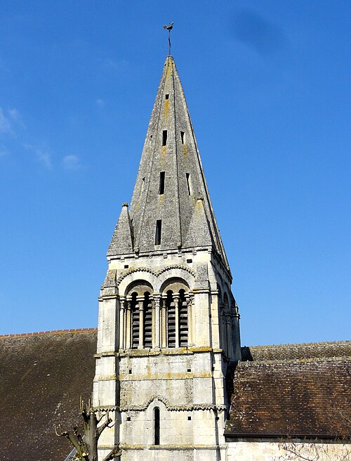 La base du clocher, implantée au sud de la première travée du chœur primitif, se compose d’une courte travée voûtée en berceau vers l’ouest et d’une travée carrée à l’est qui communique avec le chœur par une arcade étroite en plein cintre ; la travée voûtée d’ogives de la base du clocher est considérée comme l’une des plus anciennes du département, avec un bombement caractéristique, des ogives monotoriques reposant sur des culots carrés, dont certains sont sculptés de têtes grimaçantes. La voûte repose désormais, après remaniements, sur des supports et des doubleaux de types divers, illustrant les phases successives de construction.