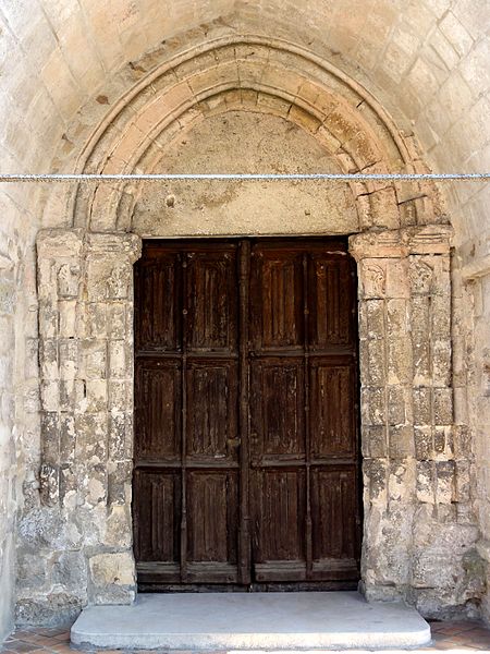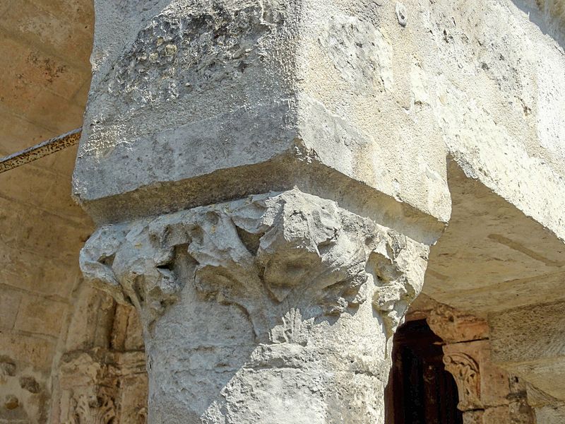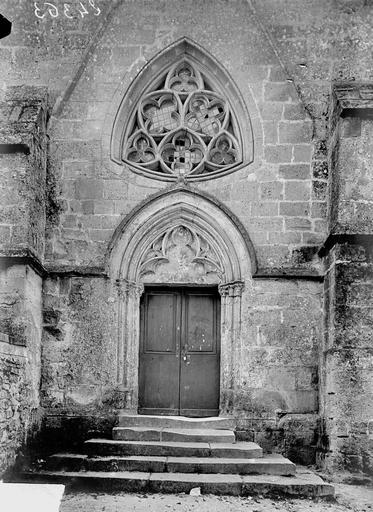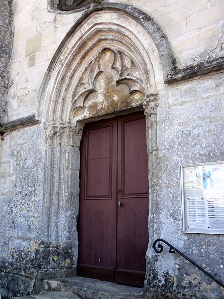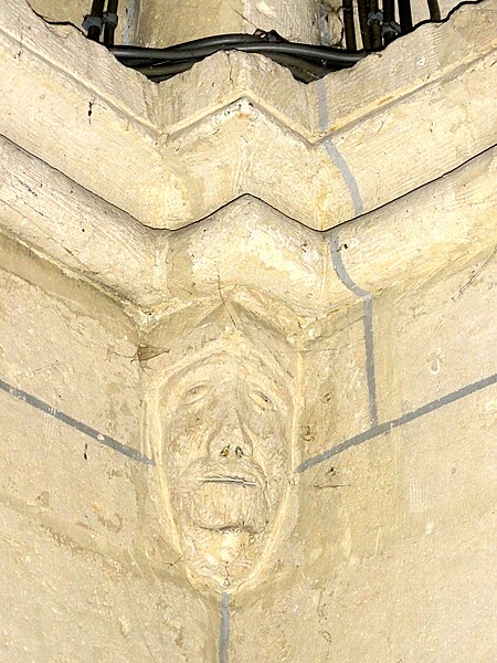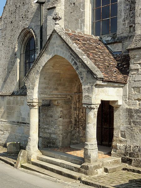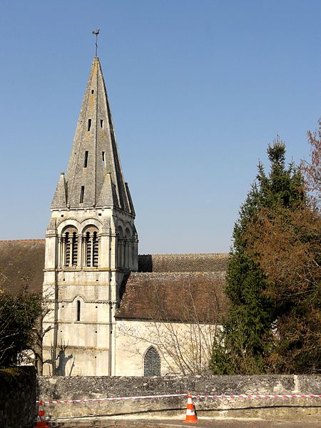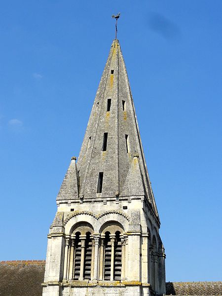 À l’extérieur, le portail occidental d’origine, daté des environs de 1130, est abrité par un porche ouvert du XVe siècle ; le portail conserve des colonnettes appareillées aux chapiteaux à feuilles d’acanthe, un tympan nu servant de linteau et une double archivolte en arc brisé qui figure parmi les premières manifestations de l’arc brisé sur les portails de la région. La façade occidentale comporte trois grandes fenêtres en tiers-point dont le remplage a disparu mais dont la mouluration renvoie au XVe siècle ; la façade nord, animée par des fenêtres du XIVe siècle et un portail latéral soigné, présente une baie au remplage déjà annonciateur du style flamboyant. Le clocher, élément le plus remarquable de l’édifice, présente un rez-de-chaussée sobre, un étage intermédiaire et un beffroi ajouré par des baies gémelées retombant sur colonnettes et chapiteaux sculptés, surmontés d’une corniche à corbeaux moulurés et d’une flèche en pierre cantonnée de pyramidons ; les chapiteaux alternent feuilles d’eau, entrelacs et têtes grimaçantes, et la flèche figure parmi les premières flèches ajourées de la région.