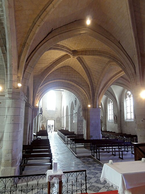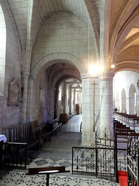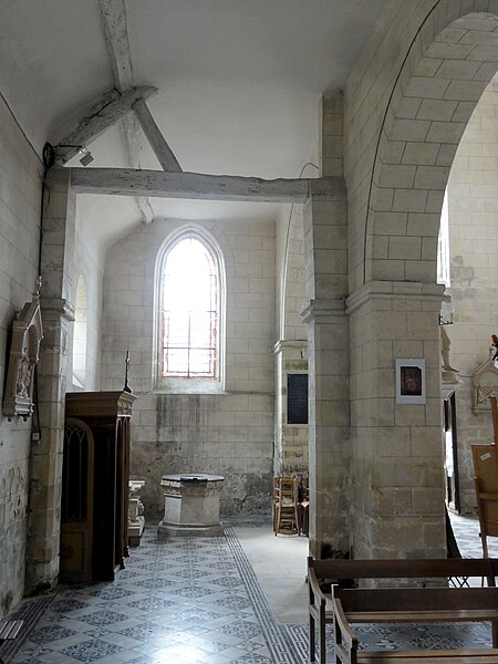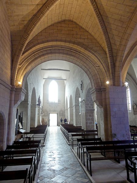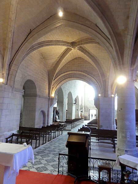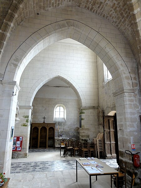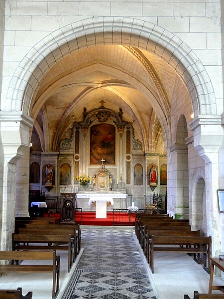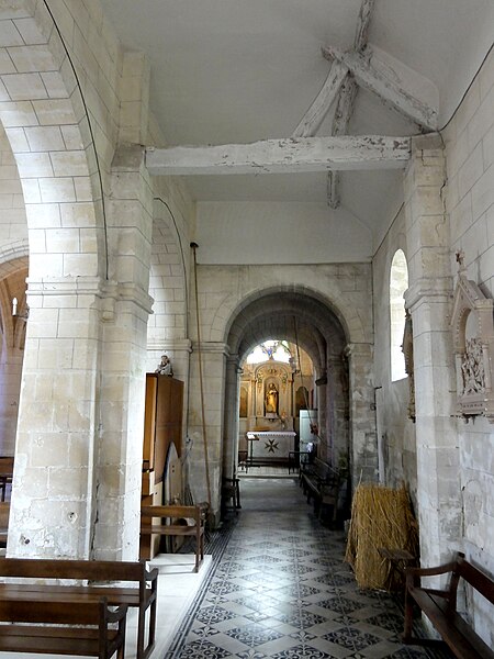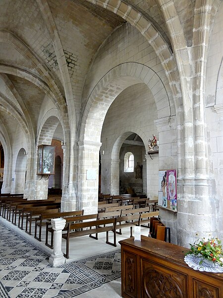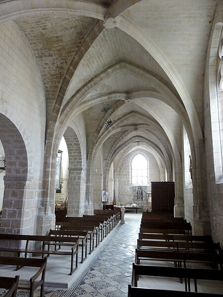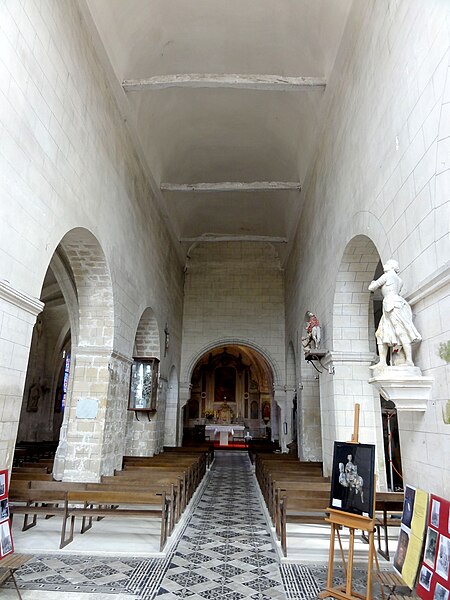 L’intérieur est d’une grande simplicité : la nef, éclairée seulement par une grande fenêtre en tiers-point au pignon occidental, est rythmée par quatre grandes arcades qui ouvrent sur les bas-côtés ; seules les premières arcades nord et sud sont en tiers-point, les autres étant en plein cintre, et les piliers portent des tailloirs moulurés sans chapiteaux. Les murs sont recouverts d’un enduit peint imitant un appareil, et des traces montrent que des fenêtres hautes existaient autrefois au-dessus des piliers, comme dans plusieurs églises voisines. Le bas-côté sud conserve, hors les percements et sans doute le plafond plat, un état proche du milieu du XIIe siècle ; il montre en particulier des pilastres destinés à porter des arcs doubleaux isolés qui n’ont jamais été achevés et servent aujourd’hui d’appui aux fermes de la charpente. Le bas-côté nord a été entièrement reconstruit au XIVe siècle, comme l’atteste le remplage des fenêtres, et son voûtement d’ogives date du dernier tiers du XVe siècle, dans le style flamboyant.