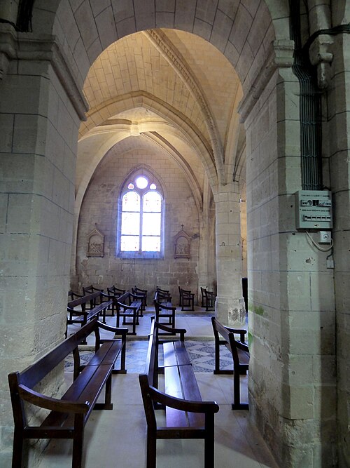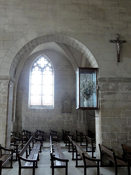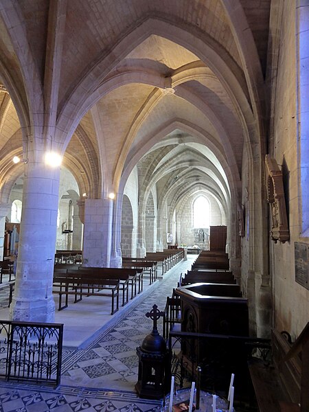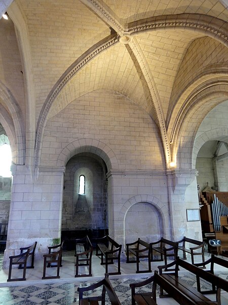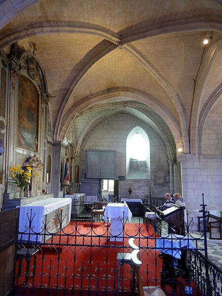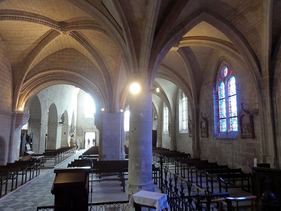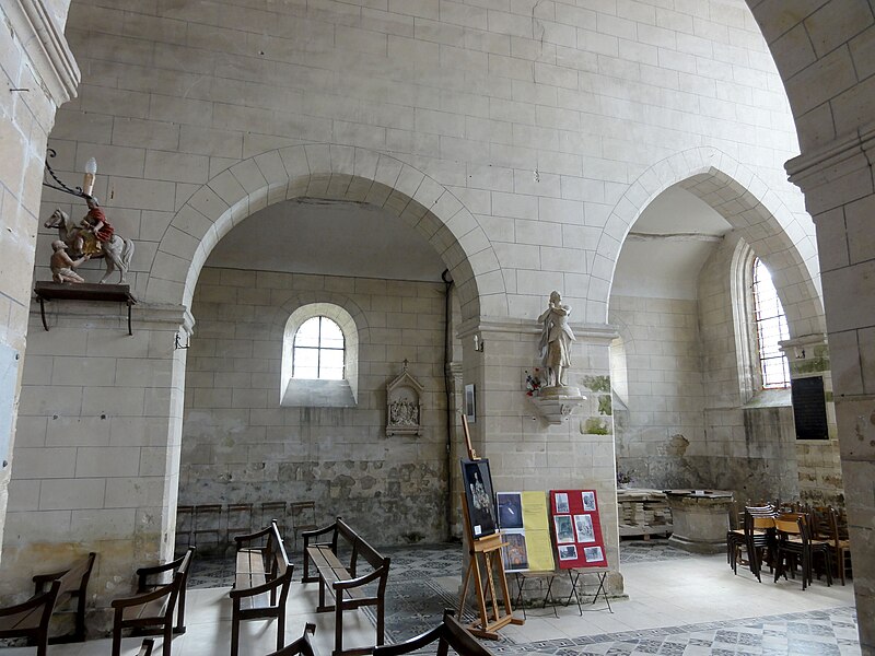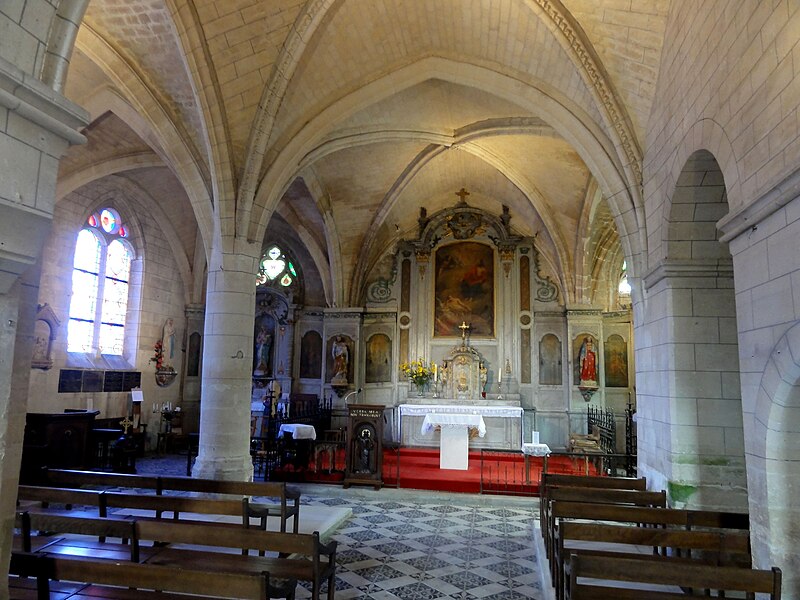 L’intérieur est d’une grande simplicité : la nef, éclairée seulement par une grande fenêtre en tiers-point au pignon occidental, est rythmée par quatre grandes arcades qui ouvrent sur les bas-côtés ; seules les premières arcades nord et sud sont en tiers-point, les autres étant en plein cintre, et les piliers portent des tailloirs moulurés sans chapiteaux. Les murs sont recouverts d’un enduit peint imitant un appareil, et des traces montrent que des fenêtres hautes existaient autrefois au-dessus des piliers, comme dans plusieurs églises voisines. Le bas-côté sud conserve, hors les percements et sans doute le plafond plat, un état proche du milieu du XIIe siècle ; il montre en particulier des pilastres destinés à porter des arcs doubleaux isolés qui n’ont jamais été achevés et servent aujourd’hui d’appui aux fermes de la charpente. Le bas-côté nord a été entièrement reconstruit au XIVe siècle, comme l’atteste le remplage des fenêtres, et son voûtement d’ogives date du dernier tiers du XVe siècle, dans le style flamboyant.