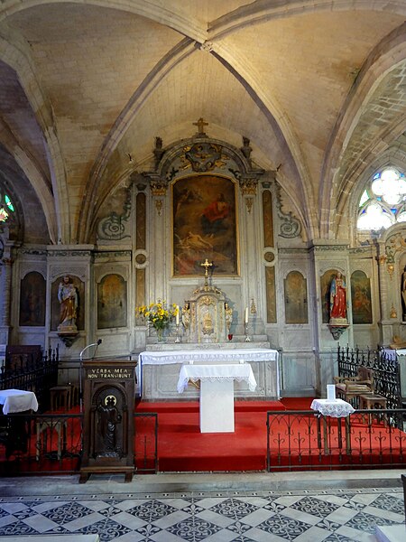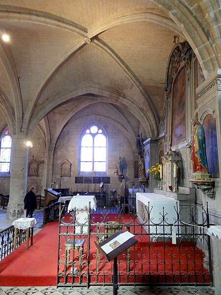 Le chœur et ses chapelles latérales forment un espace unifié voûté à la même hauteur et centré sur une colonne cylindrique isolée, évoquant la formule du chœur-halle. Le chevet primitif, composé d’une travée droite en berceau prolongée par une abside en cul-de-four, a été profondément transformé : la voûte primitive a été remplacée par une voûte d’ogives vers 1150, l’abside romane a été abattue à la fin du XIIIe siècle pour être substituée par une travée rectangulaire et une travée sud communicante avec la base du clocher, et la chapelle nord romane a été démolie pour être prolongée à la fin du XVe siècle par deux travées flamboyantes. Le remaniement a conduit à la suppression de la plupart des chapiteaux du chevet lors de l’installation du grand retable au début du XVIIIe siècle ; un seul chapiteau tardif subsiste au sud de l’arcade vers la base du clocher et la baie orientale du vaisseau central est aujourd’hui murée.