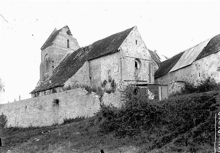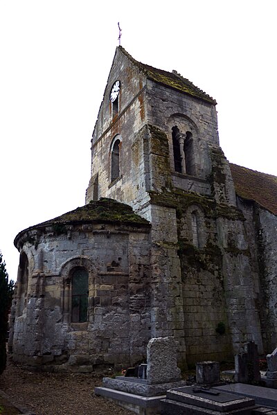 L'église Saint‑Martin de Breny, située à Breny dans l'Aisne, est un édifice roman du XIIe siècle classé au titre des monuments historiques. Elle présente une nef unique orientée est‑ouest, terminée à l'est par une abside semi‑circulaire et, au nord, un appentis formant chapelle latérale. Construite en pierre taillée du Soissonnais, l'église comporte des éléments de réemploi et plusieurs modifications, notamment au sud où l'on distingue l'emplacement d'une ancienne porte voûtée. L'abside, éclairée par trois baies à fenêtres géminées, est couverte de lauzes, un détail de couverture rare dans le département. Le clocher est orné de pignons à redents, caractéristiques du pays soissonnais et fréquentes sur les maisons d'habitation, mais peu répandues sur les édifices religieux de l'Aisne : seize églises axonaises seulement présentent ce particularisme. Saint‑Martin de Breny, qui date du XIIe siècle, est avec Saint‑Pierre de Bitry l'un des plus anciens exemples de ce trait local toutes architectures confondues ; les redents du clocher sont aujourd'hui très érodés, voire presque disparus pour certains. Le dallage intérieur se situe environ quarante centimètres, soit deux marches, en dessous du niveau du terrain extérieur. Deux dalles funéraires scellées au sol, classées au titre des monuments historiques, portent des effigies gravées : l'une renferme les restes de Jehan Mérast, seigneur des Pisserolles, et de sa femme, datée de 1557 malgré une inscription partiellement effacée ; l'autre est consacrée à Anne Thuret et remonte à 1642. L'église repose sur une terrasse qui domine l'Ourcq, perceptible à travers les frondaisons d'un parc privé, et sert aujourd'hui de petit cimetière au village. Selon certains auteurs, cette terrasse correspondrait aux substructures de la villa de Brennacum, attribuée à Clotaire Ier, fils de Clovis. Jusqu'à une date récente, le cimetière présentait de nombreuses tombes anciennes, dont celle d'un "consul de Portugal à Bahia" ; ces monuments funéraires centenaires ont été détruits en 2011 après une procédure de reprise engagée par la commune en 2005. L'historien Bernard Ancien indique qu'une trentaine de crânes néolithiques, découverts fortuitement à la fin des années 1930, auraient été inhumés dans le cimetière, mais l'emplacement de cette inhumation n'a pas été noté et n'est plus connu au village. Immédiatement à l'est de l'église, le presbytère, seule maison ouvrant directement sur la place et propriété privée, est mentionné dès 1766 ; sa façade sud a été remaniée au XIXe siècle puis après la Première Guerre mondiale, et son verger, visible depuis la terrasse, comporte une tonnelle de pommiers antérieure à 1907. L'église a inspiré des artistes : le peintre Fernand Pinal lui a consacré une eau‑forte et l'a choisie pour la simplicité de son roman, tandis que le photographe Jean‑Marie Petit a relevé la beauté de son abside romane couverte de lauzes. L'ensemble de l'édifice bénéficie d'un classement au titre des monuments historiques depuis le 17 mai 1921.