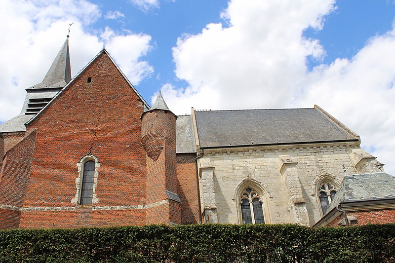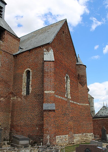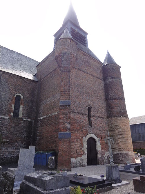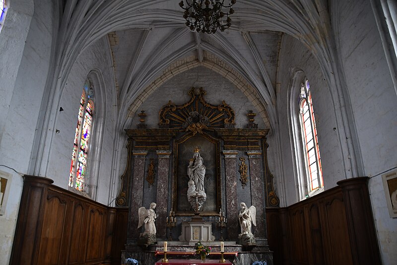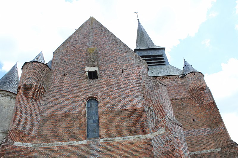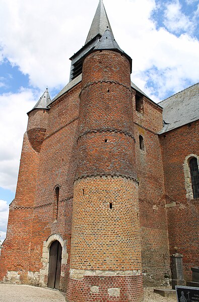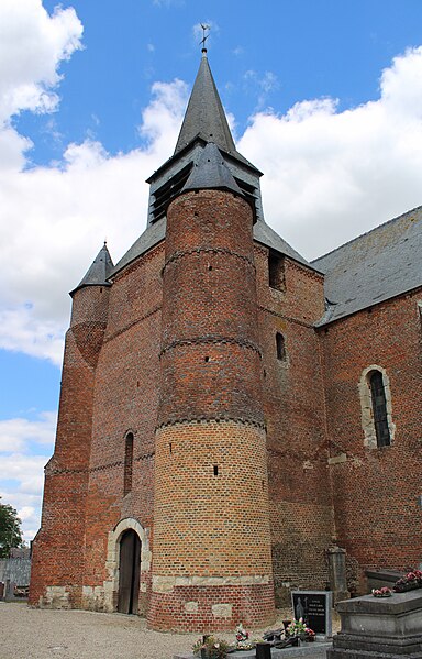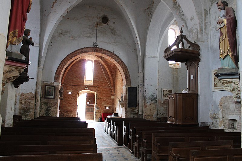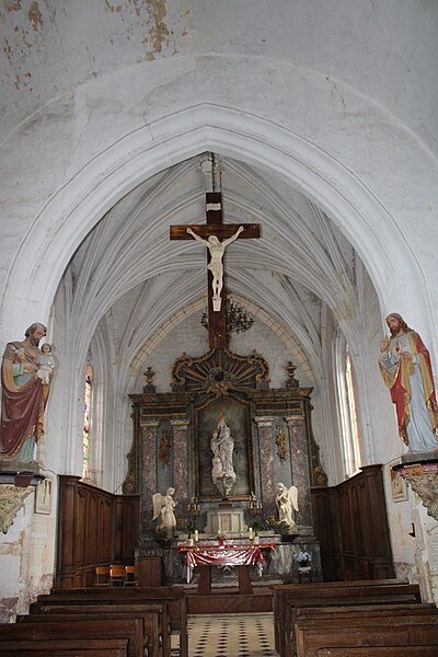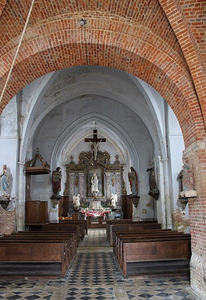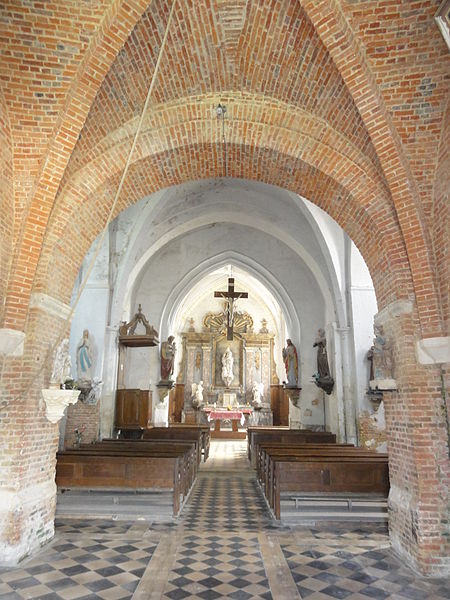L'église présente un plan en croix latine renversée avec trois branches fortifiées aménagées pour des tirs croisés. Le chœur, à chevet plat, est couvert d'une voûte à nervures multiples et d'une voûte d'ogives ; la croisée d'ogives en pierre calcaire porte une clé de voûte aux armes de France, et le transept comporte des voûtes d'ogives en brique. Un escalier hors-œuvre, coiffé d'une flèche conique, dessert le comble, tandis qu'un escalier demi hors-œuvre permet d'accéder au clocher-porche qui s'élève sur trois niveaux, les deux premiers étant voûtés d'ogives ; l'étage de comble communique avec celui du transept.