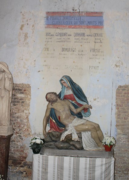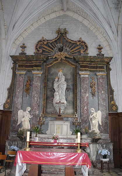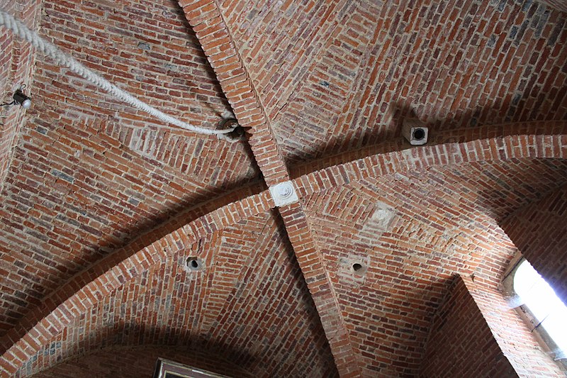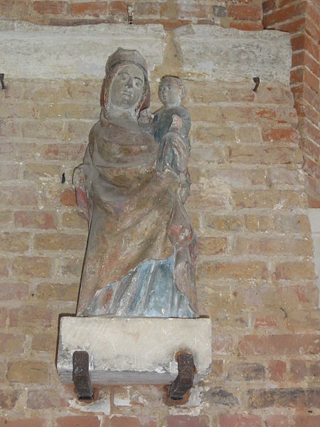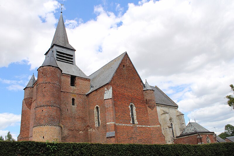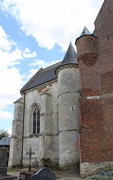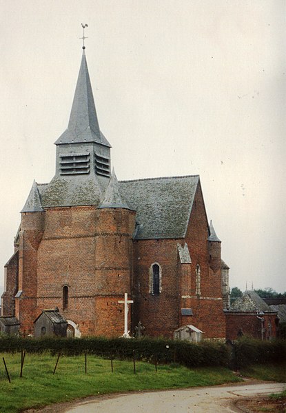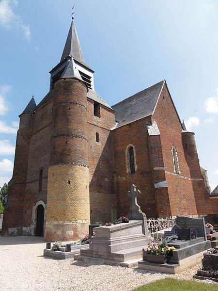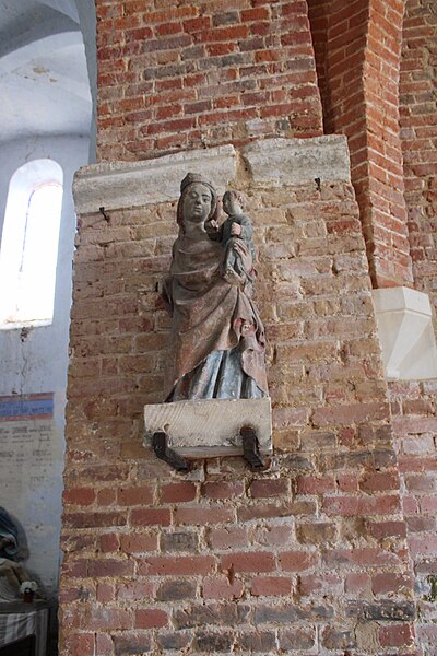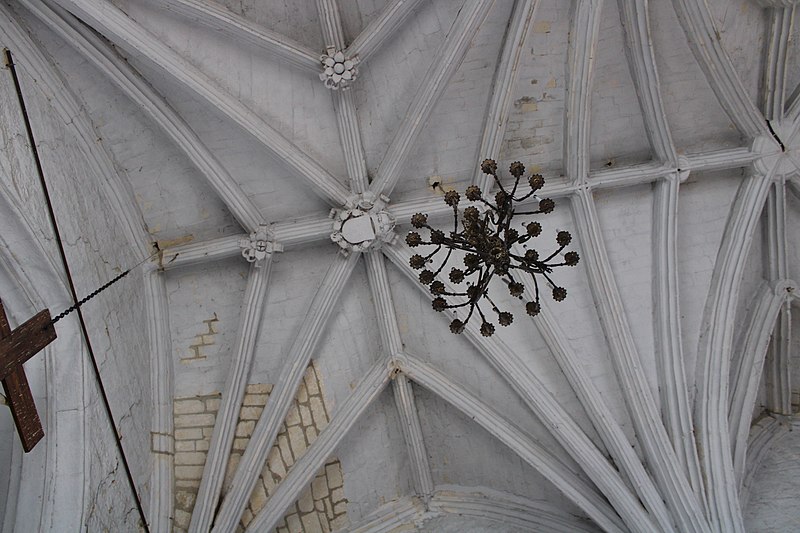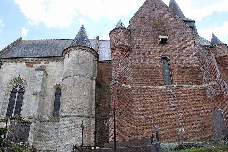 L'église présente un plan en croix latine renversée avec trois branches fortifiées aménagées pour des tirs croisés. Le chœur, à chevet plat, est couvert d'une voûte à nervures multiples et d'une voûte d'ogives ; la croisée d'ogives en pierre calcaire porte une clé de voûte aux armes de France, et le transept comporte des voûtes d'ogives en brique. Un escalier hors-œuvre, coiffé d'une flèche conique, dessert le comble, tandis qu'un escalier demi hors-œuvre permet d'accéder au clocher-porche qui s'élève sur trois niveaux, les deux premiers étant voûtés d'ogives ; l'étage de comble communique avec celui du transept.