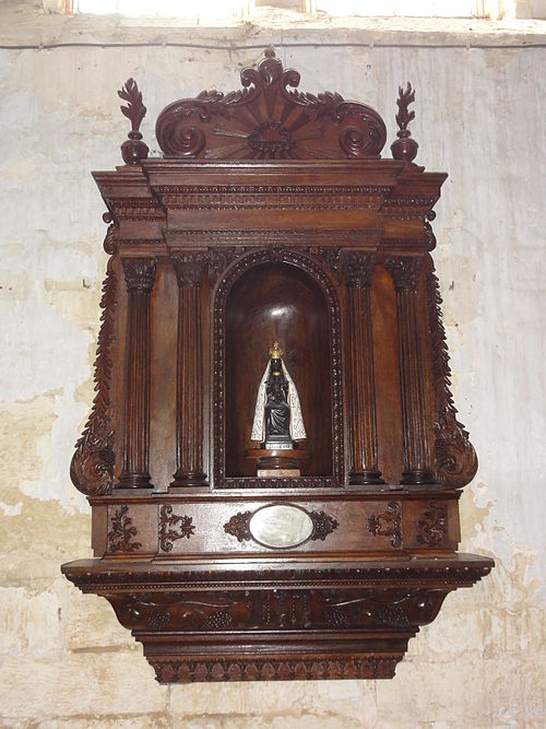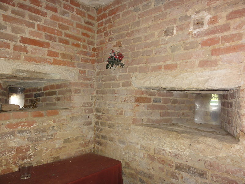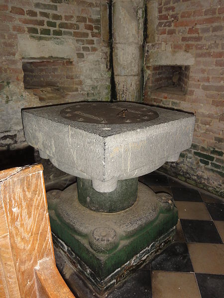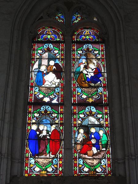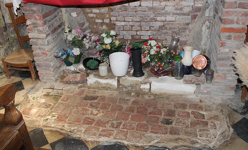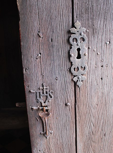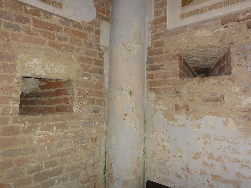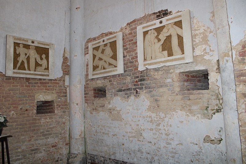 À l'extérieur, la sacristie est ornée de motifs en brique vernissée — cœurs, porteurs de croix, losanges, entrelacs et calice — et une serrure en fer forgé porte le monogramme IHS. À l'intérieur, on observe la nef ouverte sur le transept, des meurtrières d'angle, le maître-autel du chœur, une Vierge à l'Enfant en pierre polychrome et des voûtes d'ogives alternant pierre et brique.