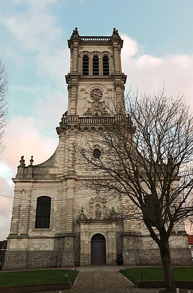 L'église Saint-Martin, surnommée la "Tour carrée couronnée", est une église catholique située dans le quartier de Carvin Nord à Carvin, dans le Pas-de-Calais. Elle est incluse dans la ZPPAUP de Carvin et classée au titre des monuments historiques depuis le 13 juin 1921. L'édifice actuel, rare survivant des monuments baroques du Nord, adopte un style de Renaissance flamande et a été achevé au début du XVIIIe siècle pour remplacer une église romane du XIIIe siècle qui avait brûlé à deux reprises au XVIIe siècle ; cette dernière avait été édifiée sur les fondations d'un oratoire attribué à saint Martin en 380. Après les incendies de 1640 et 1656, seules les trois nefs subsistaient, protégées par une toiture provisoire. En 1666, Louise de Béthune, épouse de Guillaume de Melun, y fut inhumée avec ses descendants ; Guillaume, remarié la même année avec Pélagie Chabot de Rohan, fut enterré auprès de sa première épouse à sa mort en 1679 ; leurs dépouilles furent ensuite exhumées pendant la Révolution pour récupérer les métaux précieux. Pélagie Chabot entreprit la reconstruction de la tour pour honorer le souvenir de son époux. Pendant la Révolution, en 1793, les objets de culte et une grande partie du mobilier furent envoyés à Arras pour y être monnayés, trois des quatre cloches furent également retirées, et la première élection municipale se tint dans l'église ; la maison échevinale voisine servit de mairie jusqu'en 1932, avant de devenir tribunal. En 1794, le premier télégraphe Chappe fut installé sur la plate-forme de la tour pour relier Lille à Paris — il y resta jusqu'en 1846 — et sa première transmission annonça la victoire de Condé-sur-Escaut. Pendant la majeure partie de la Première Guerre mondiale, la tour servit de poste de guet sous l'occupation ; au début de 1917, un incendie provoqué par la chute d'un brûlot depuis le sommet fit chuter les cloches. À la fin de 1918, les Allemands, qui se retiraient, envisagèrent de faire sauter la tour mais y renoncèrent, contrairement à l'église voisine de Seclin. L'édifice, classé monument historique en 1921, a fait l'objet d'une restauration entre 1957 et 1960 ; des travaux portant sur la pierre et les vitraux ont été entrepris depuis 2009. Les orgues furent reconstruites en 1847 par François-Joseph Carlier puis restaurées et harmonisées en 1989 par le facteur Michel Garnier ; elles sont considérées comme l'un des instruments les plus renommés de la région et Franck Berlemont en est titulaire. Parmi les dimensions mentionnées, la hauteur de la tour est de 57 mètres ; les autres mesures intérieures (longueur, hauteur et largeur au transept) sont indiquées sans valeurs numériques dans la source.