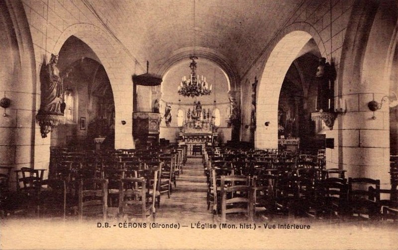 L'église Saint-Martin est une église catholique située dans le bourg de Cérons, en Gironde, entre la Garonne et la route départementale D113. La construction primitive remonte au XIIe siècle ; de cette période subsistent l'abside et le portail, restés sans transformation. Au XVe siècle, deux chapelles latérales ont été ajoutées, formant un transept sur la petite nef romane. En 1712, des bas-côtés ont été aménagés dans le prolongement de ces chapelles. En 1844, la façade a été portée en avant pour ajouter une travée et le clocher néogothique a été reconstruit à cette occasion. L'édifice présente ainsi un noyau roman du XIIe siècle agrandi aux XVe, XVIIIe et XIXe siècles. Le portail et l'abside ont été classés au titre des monuments historiques par arrêté du 22 octobre 1913. Des notices et photographies (Mérimée, Clochers de France, Observatoire du patrimoine religieux) ainsi que des informations sur le site de la commune et celui de l'Église catholique en Gironde documentent le monument.