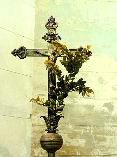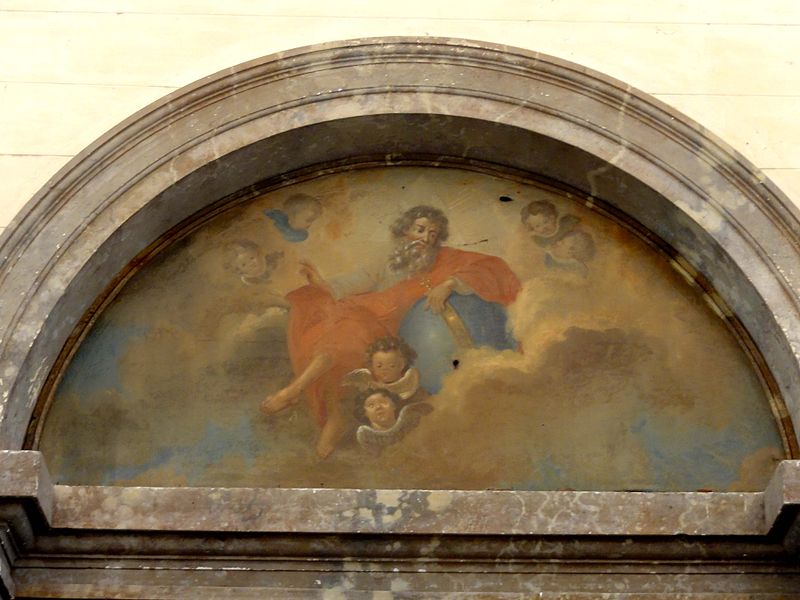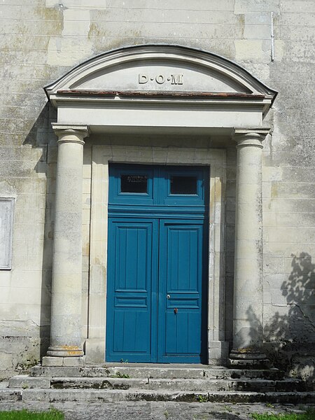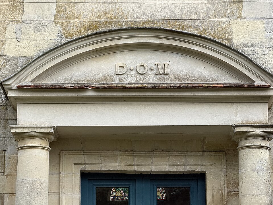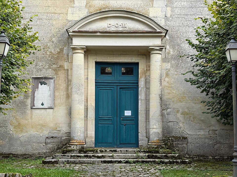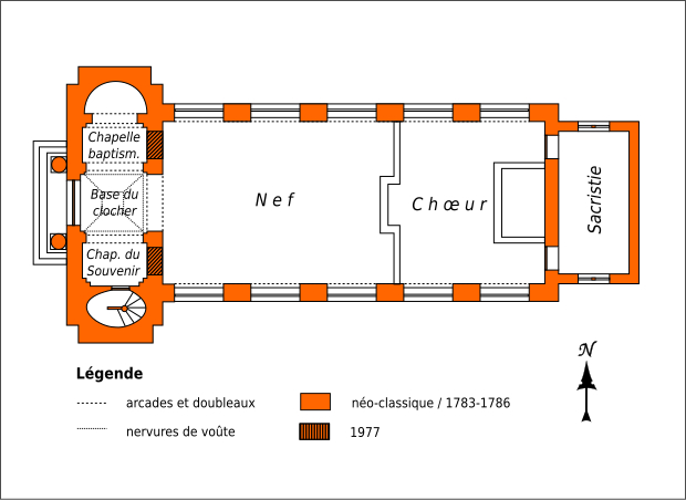 La façade ne comporte qu'une porte rectangulaire à double vantail abritée sous un porche peu saillant formé de deux fortes colonnes doriques supportant un linteau et un fronton en arc de cercle portant l'inscription D.O.M. Le pignon présente des rampants brisés et le clocher carré, assis à cheval sur la toiture, ouvre chaque face par une baie abat‑son en plein cintre inscrite dans un panneau rectangulaire, scandée par deux larmiers et coiffée d'un toit à la hache en ardoise. Sur les murs gouttereaux, les chapelles du narthex en légère saillie sont couvertes d'appentis et l'éclairage est assuré de chaque côté par six oculi en demi‑lune ; les murs affichent un bossage simulé, une ébauche d'entablement et une corniche très sobre sans ornements sculptés. Le chevet est en croupe et la sacristie occupe presque toute sa largeur, éclairée par des fenêtres rectangulaires grillagées.