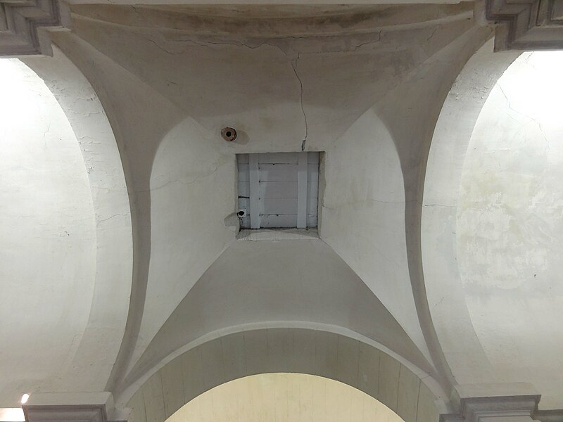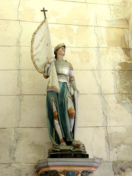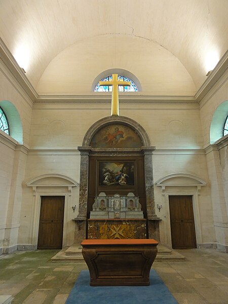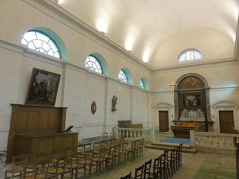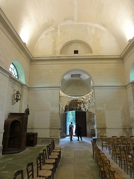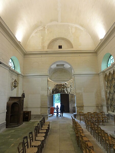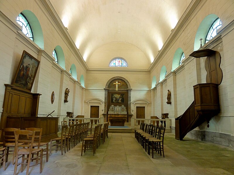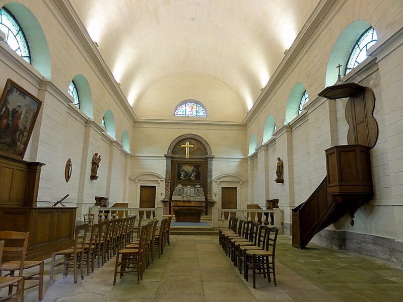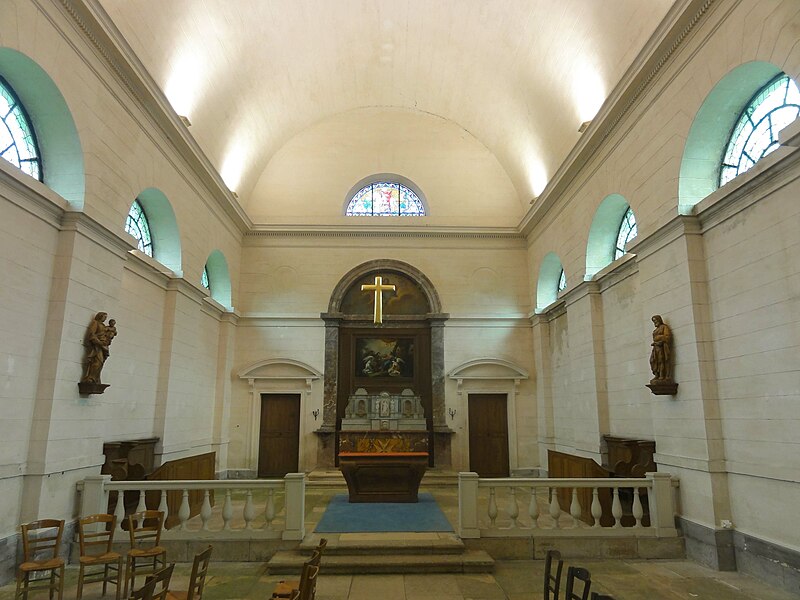 À l'intérieur, le narthex supporte la masse du clocher bâti en maçonnerie ; des piles carrées avec pilastres, reliées par arcades en plein cintre, portent une voûte d'arêtes et la trappe d'accès au clocher remplace toute cage d'escalier. Les chapelles nord et sud, chacune composée d'une travée droite et d'une abside en hémicycle, sont séparées de la nef par des ouvertures rectangulaires qui ont été obturées à la fin du XXe siècle pour compenser l'insuffisance des piles du clocher ; la chapelle nord renferme les fonts baptismaux et la chapelle sud est dédiée au souvenir des morts, avec le monument aux morts et une statue de sainte Jeanne d'Arc. La nef et le chœur forment un vaste espace unique, dominé par une voûte en berceau logée dans le volume du toit, structuré verticalement par des arcades simulées correspondant aux oculi et horizontalement par un bandeau bas et une corniche saillante couronnée d'une seconde corniche dentelée à la naissance de la voûte, ce qui donne aux murs une animation linéaire presque graphique ; la hauteur intérieure dépasse une dizaine de mètres. Le mur occidental est percé de l'arcade orientale de la base du clocher, encadrée de simulations d'oculi bouchés, et la grande arcade factice en faux marbre du chevet sert de cadre au retable du maître‑autel, tandis que la baie du chevet, seule baie vitrée, porte un vitrail polychrome représentant la Charité de Saint‑Martin.