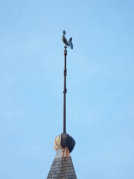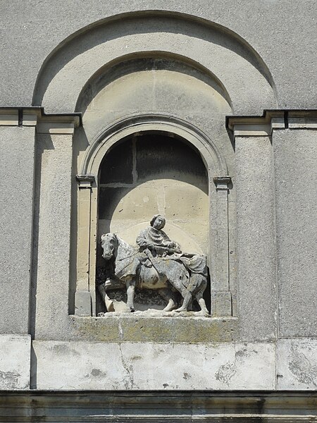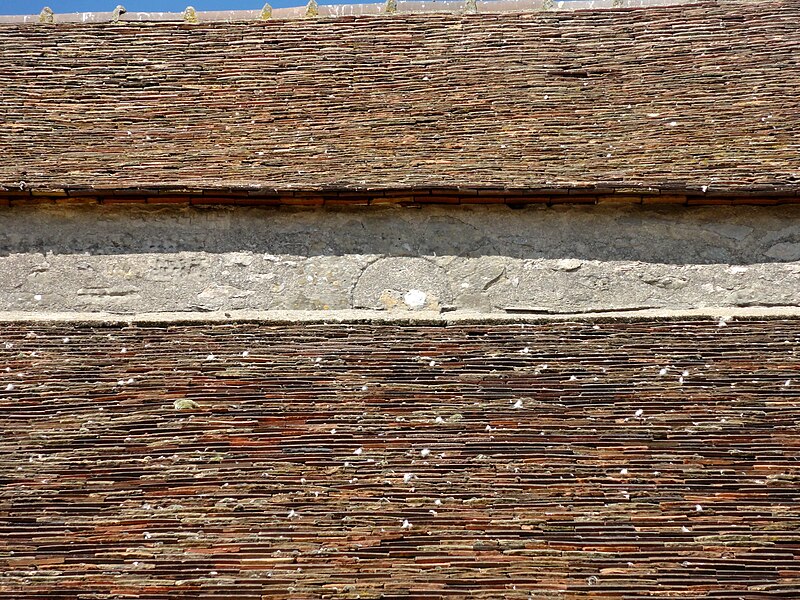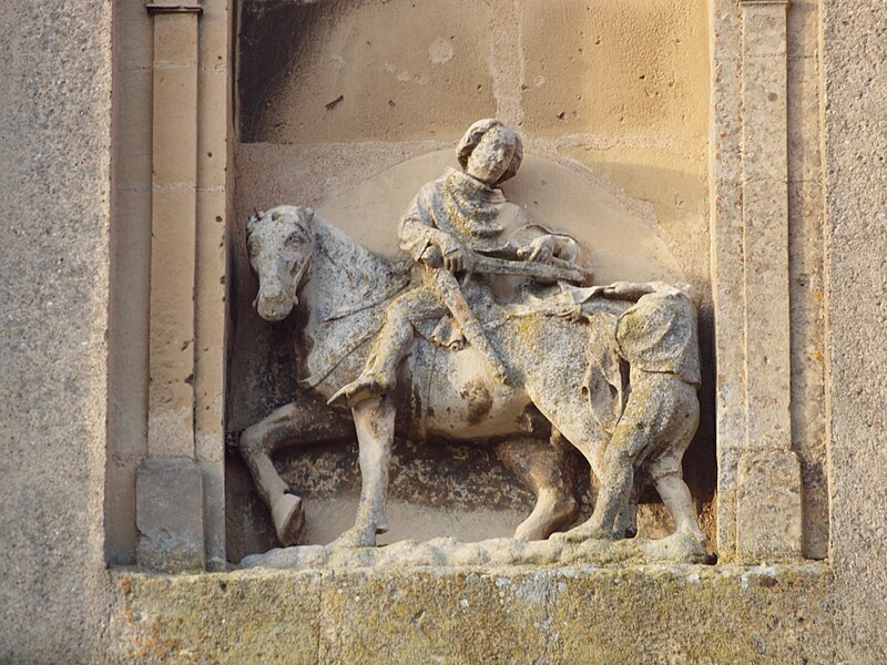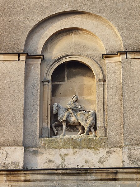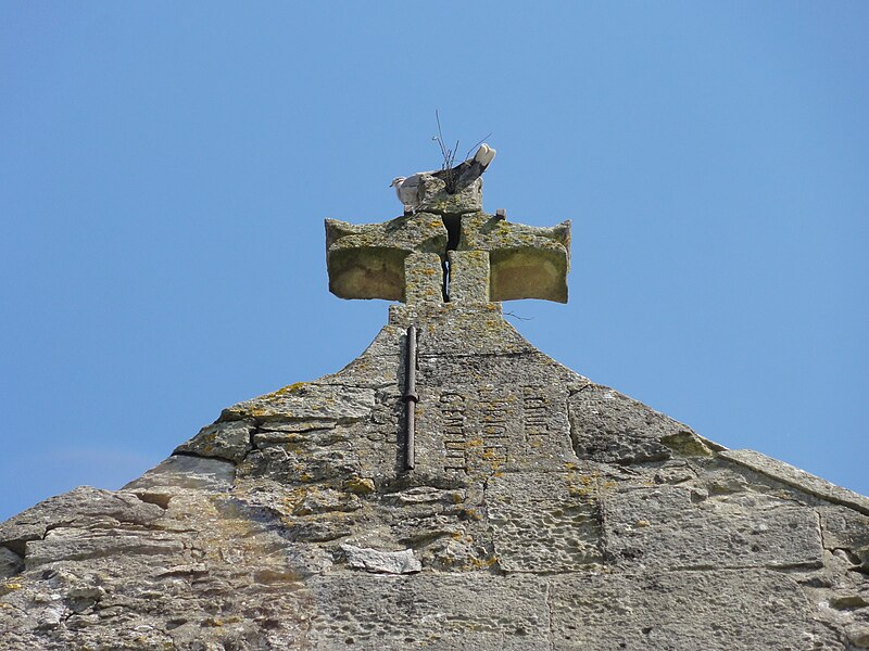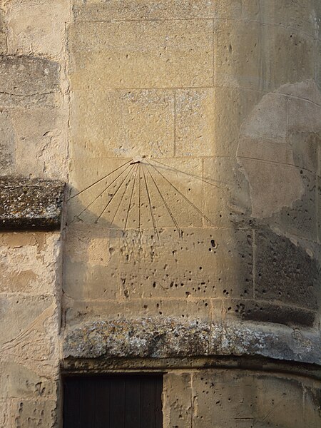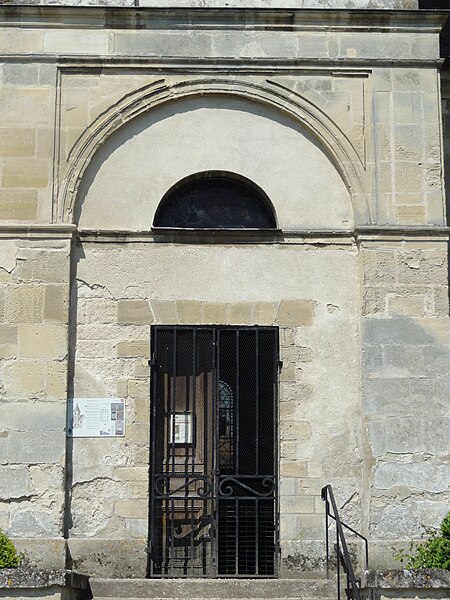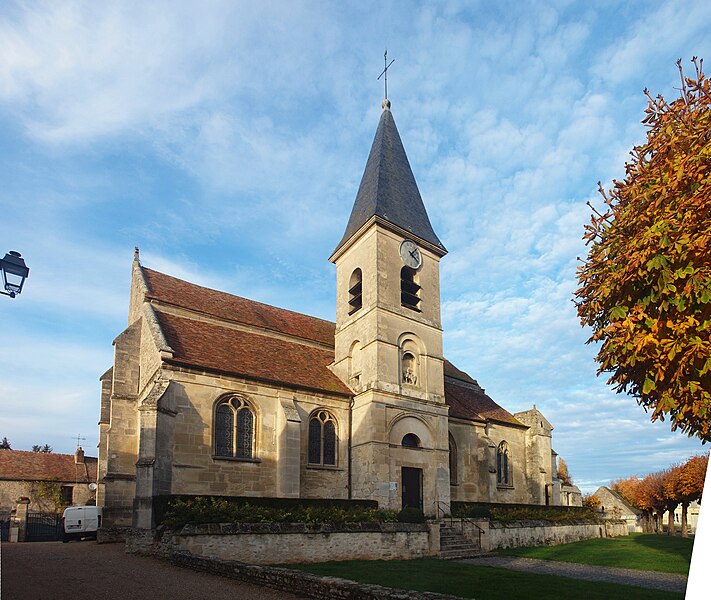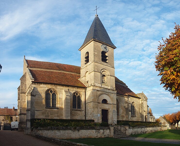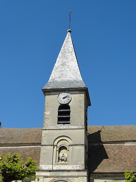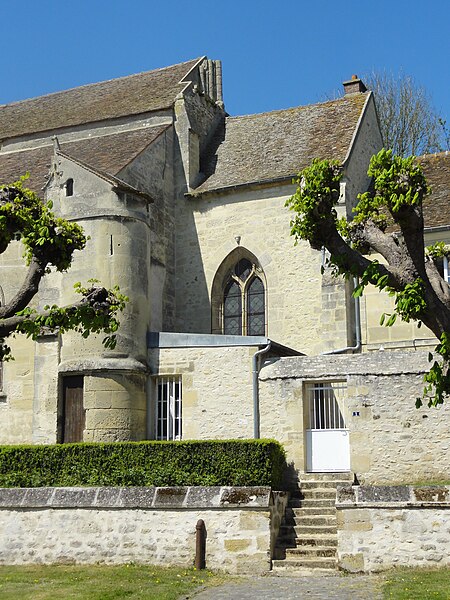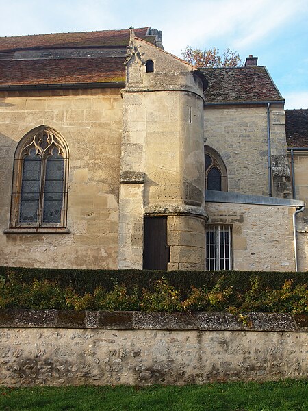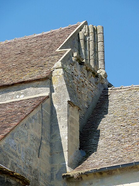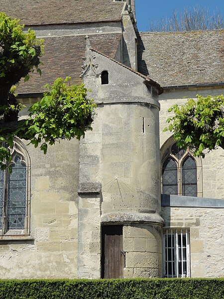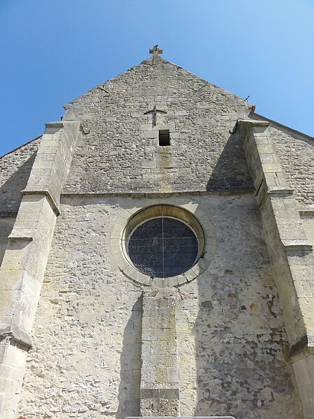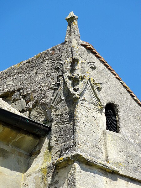 À l’extérieur, le mur occidental, sans véritable façade, est traité de façon sobre avec un larmier et un bandeau sommatif, et le mur méridional a fait l’objet de reprises au XIXe siècle ; la tourelle d’escalier du croisillon sud et son pinacle témoignent des interventions flamboyantes, tandis que le clocher-porche de 1833, de composition plus simple, s’élève en trois niveaux percés de baies en plein cintre et abrite au sud une niche contenant un groupe sculpté ancien représentant la Charité de saint Martin. La sacristie, adossée au chevet, et l’ancienne école qui masque le chevet complètent l’implantation du bâtiment dans son environnement villageois.