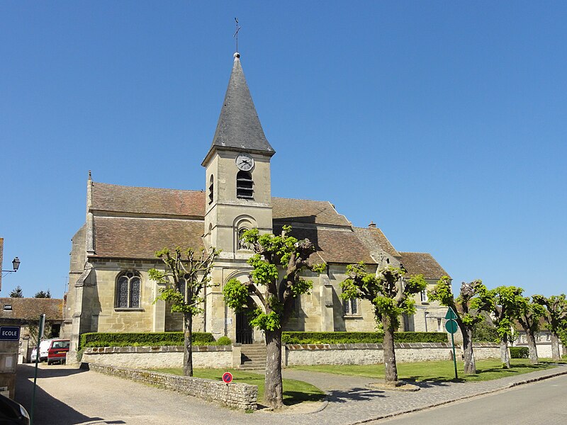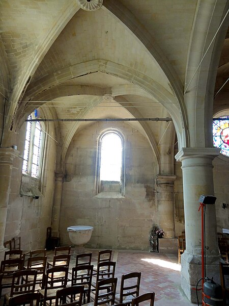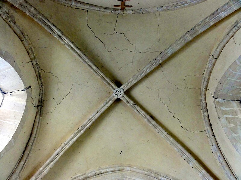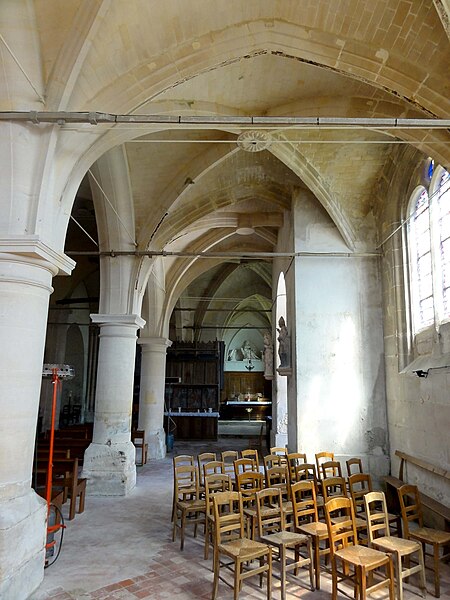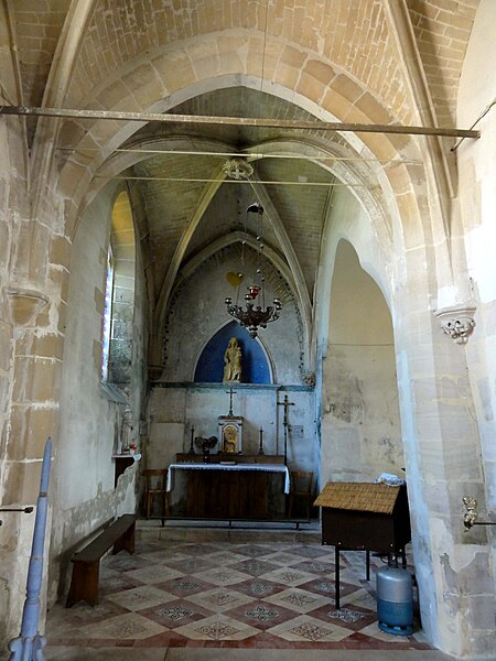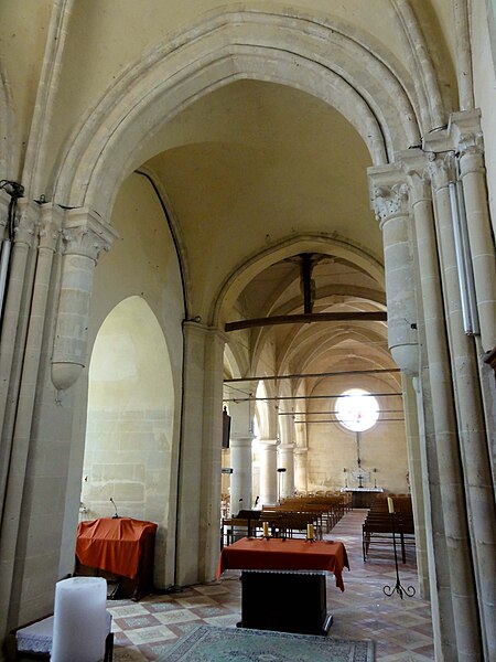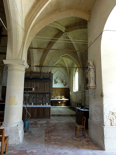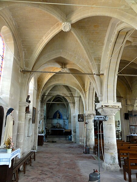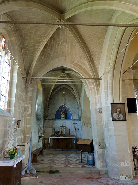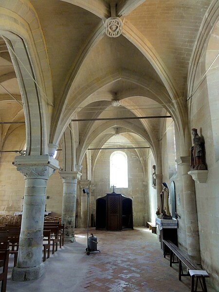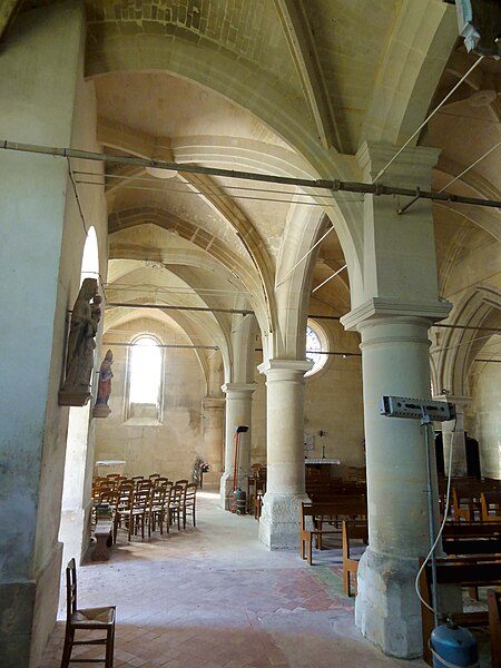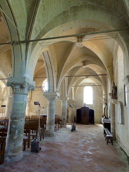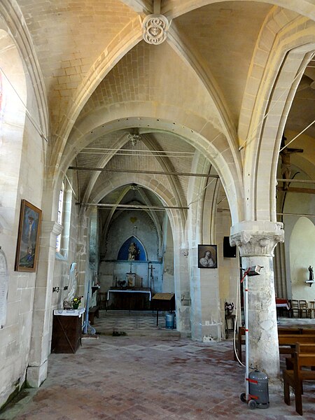 L’édifice présente un plan cruciforme remarquable par sa modestie : une nef de quatre travées avec bas-côtés, un transept peu saillant et un chœur carré à chevet plat ; un clocher-porche saillant devant la troisième travée sud constitue l’unique accès. La croisée du transept, correspondant à la base de l’ancien clocher, est voûtée en arêtes, tandis que le reste des voûtes est d’ogives ; la couverture se compose de tuiles plates pour la plupart des volumes et d’une petite pyramide en charpente recouverte d’ardoise pour le clocher. À l’intérieur, les grandes arcades nord, issues de la phase primitive, sont en tiers-point à double rouleau et conservent une mouluration soignée, tandis que la nef voûtée à la Renaissance présente des nervures simples de section carrée, des colonnes toscanes et des clés de voûte le plus souvent sobres, sauf celle de la troisième travée qui est plus décorée. Les bas-côtés montrent un mélange de remplages de la Renaissance et de réseaux flamboyants dans leurs dernières travées ; les voûtes de la quatrième travée se distinguent par un profil prismatique et des clés ornées. La croisée du transept a perdu ses faisceaux de colonnettes et sa voûte d’origine, ce qui alourdit son aspect ; les arcades vers les croisillons, reconstruites au début du XVIe siècle, sont plus basses, épaisses et peu moulurées, mais conservent quelques cul-de-lampe sculptés et des clefs décorées, dont certaines portent des motifs figurés. Le chœur, d’une seule travée, offre encore un bel exemple de la première période gothique avec son doubleau à double rouleau, des faisceaux de colonnettes disposés dans les ressauts du mur et une clé de voûte ornée d’une couronne de feuillage entourant une chimère ; le chevet est aujourd’hui aveugle en raison de l’installation du retable principal.
