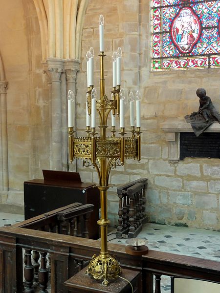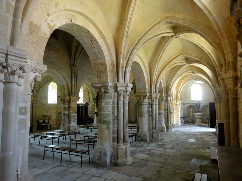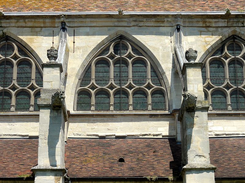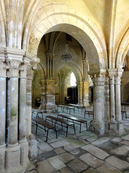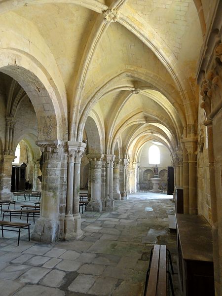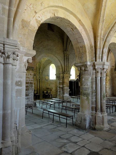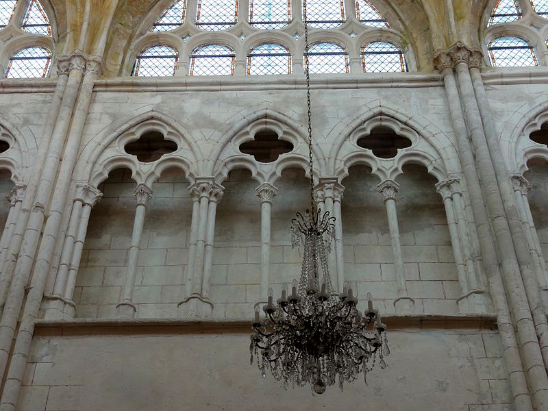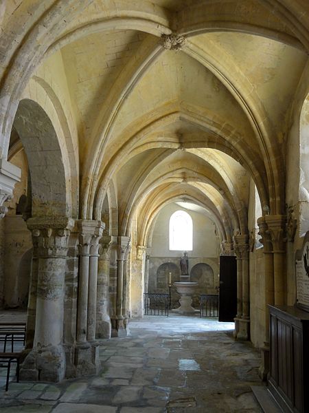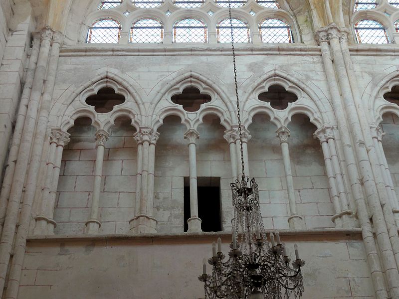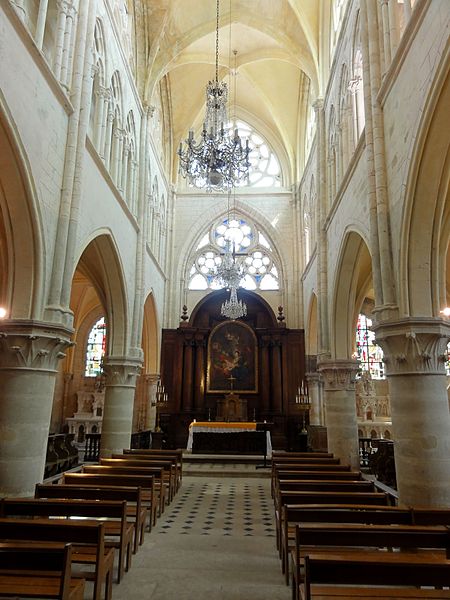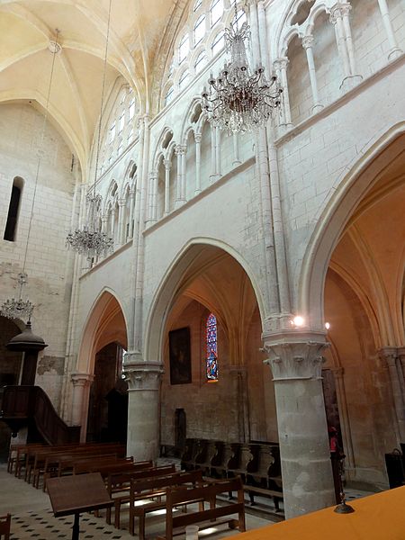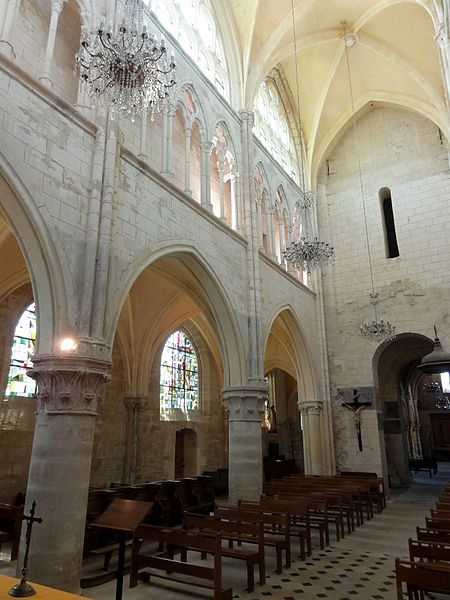 Les bas-côtés, voûtés lors de la même campagne que la nef et probablement élargis à ce moment, présentent des supports adossés et des chapiteaux à crochets variables ; la travée nord contient la chapelle baptismale et la travée sud a été provisoirement séparée par un mur. Le transept conserve sa structure romane bien que remaniée : les croisillons voûtés en berceau et la voûte d'arêtes de la croisée subsistent, et l'ensemble intérieur est orné de peintures murales en faux appareil du XIVe siècle. Le chœur, voûté sur croisées d'ogives, se distingue par son triforium composé de trois arcades en tiers-point par travée, d'une forte parenté avec le modèle de Saint-Denis, et par des voûtes légères dont l'épaisseur de remplissage reste faible.
