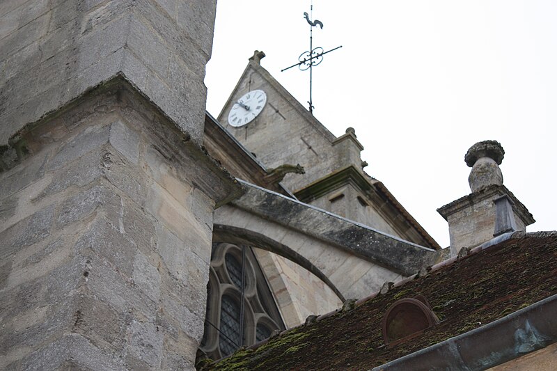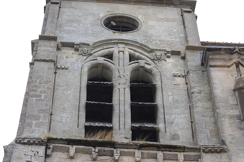Le clocher conserve une assise romane jusqu'à une corniche partiellement conservée, puis des remaniements importants au XVIe siècle qui ont modifié l'ordonnancement des baies et introduit des éléments de style Renaissance ; il est couvert en bâtière et abrite un beffroi en charpente du XVIe siècle et trois cloches refondues en 1865–1866. À l'intérieur, la nef romane communique avec les bas-côtés par de larges arcades en plein cintre à double rouleau reposant sur des piliers carrés flanqués de demi-colonnes, et les chapiteaux, de facture très archaïque, ont fait l'objet de nombreuses analyses sur leur datation. Le voûtement d'ogives de la nef repose sur des colonnettes en délit et des corbeaux intégrés aux murs, et les parties hautes de la nef sont obscurcies par des fenêtres hautes bouchées.