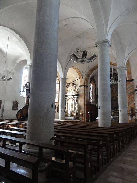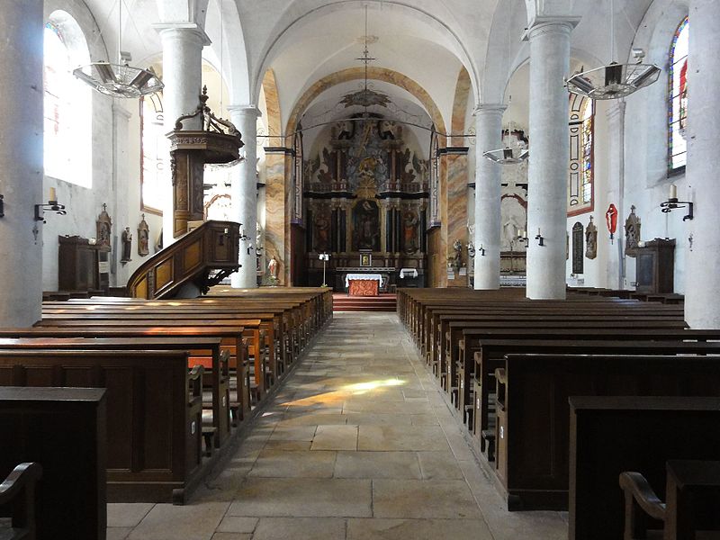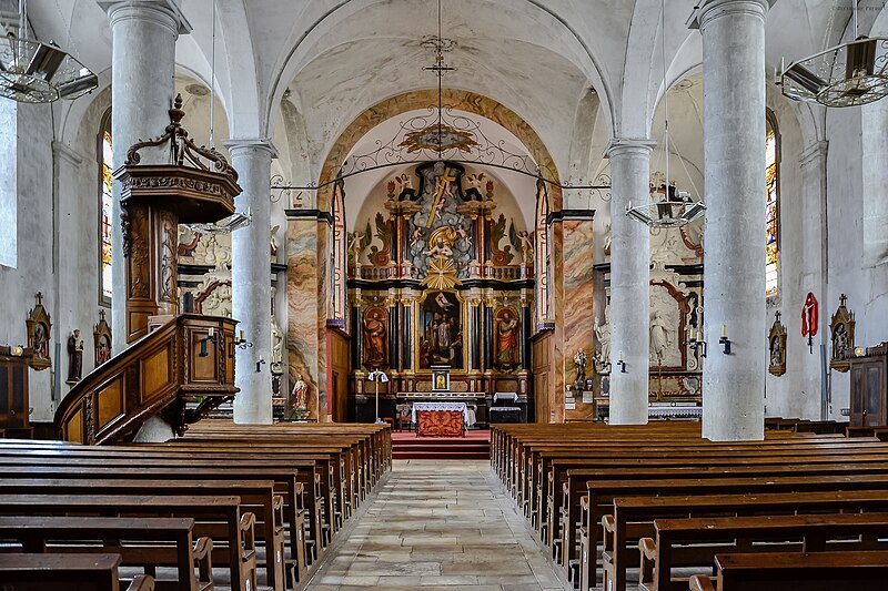 L'édifice est une église-halle composée de trois vaisseaux et de quatre travées, séparés par des piliers qui portent des voûtes d'arêtes. La tour-porche, qui fait face à l'entrée, est surmontée d'un campanile et flanquée à l'extérieur d'une tourelle abritant un escalier en vis ; l'abside est rectangulaire et se termine par un chevet plat.