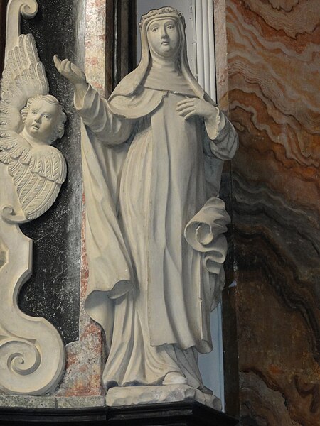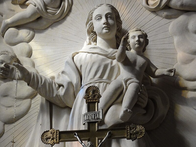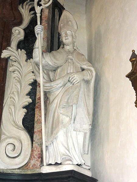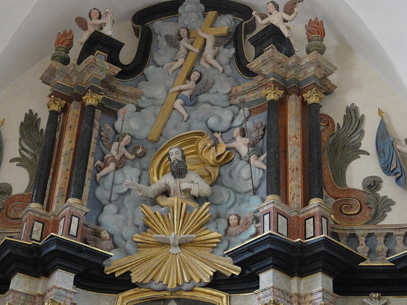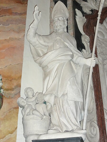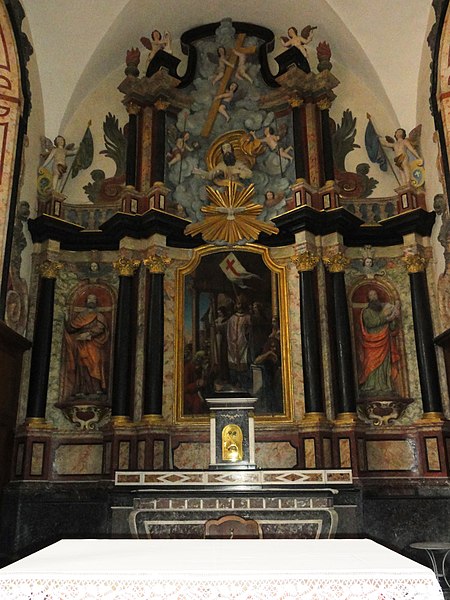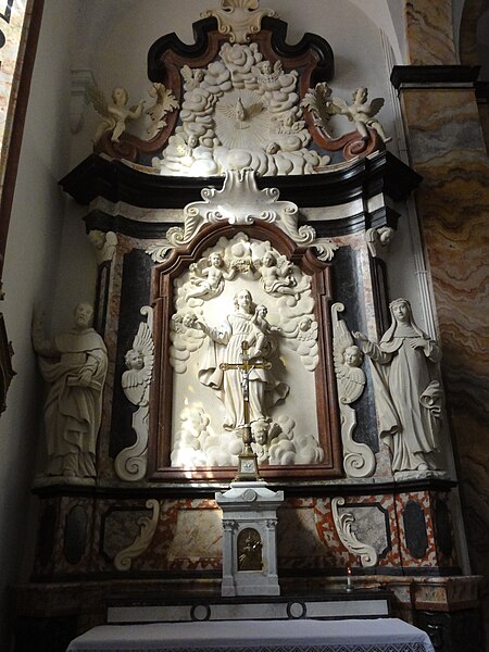 La décoration intérieure comprend plusieurs retables attribués aux frères Marca : le retable du maître-autel présente un bas‑relief de Dieu le Père et la Colombe du Saint‑Esprit entourés d'angelots et un tableau de saint Martin, flanqué des statues de saint Pierre (à gauche) et de saint Paul (à droite) ; le retable de saint Roch montre le saint dans une forêt avec son chien et les attributs du pèlerin, accompagné de statues évoquant un évêque et le miracle des enfants ressuscités par saint Nicolas ; le retable de la Vierge associe un bas‑relief de la Vierge à l'Enfant et deux angelots aux statues de saint Dominique et sainte Catherine de Sienne.