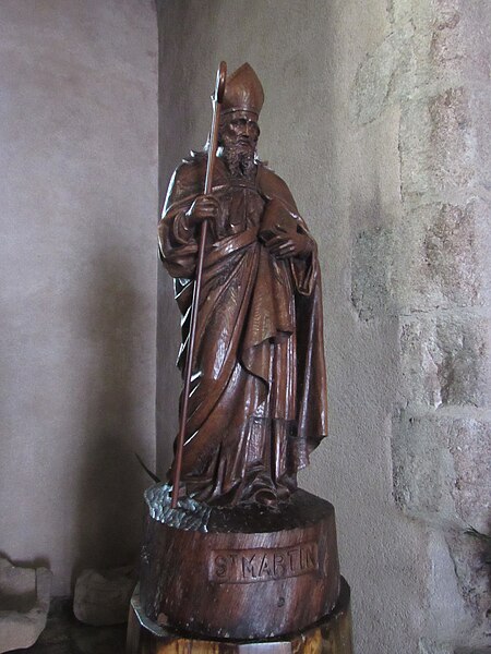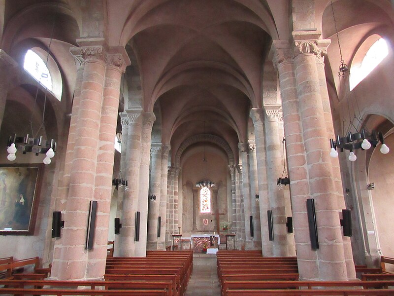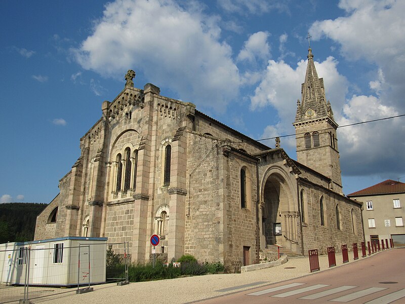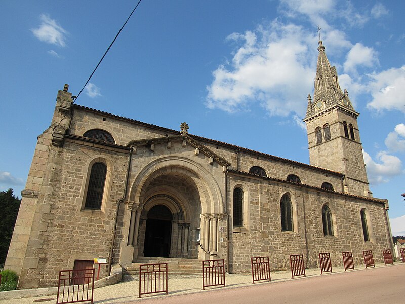Selon la tradition, l'église Saint‑Martin de Dunières (Haute‑Loire) aurait été édifiée par des bénédictins et est mentionnée en 1184 comme bénéfice de La Chaise‑Dieu. L'édifice présente une disposition à trois nefs. Les voûtes primitives ont disparu, sauf dans les travées qui précèdent les absides. Les absides sont voûtées en berceau et communiquent latéralement entre elles ; l'une d'elles présente une voûte en cul‑de‑four. Les piliers de la nef, de forme quadrilobée, évoquent l'art poitevin et sont couronnés de chapiteaux sculptés. Une travée a été ajoutée vers l'ouest à la fin du XIXe siècle. Des traces de polychromie subsistent. L'édifice est classé au titre des monuments historiques depuis 1907.