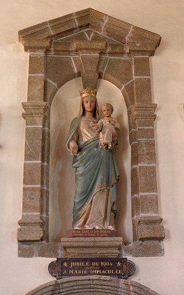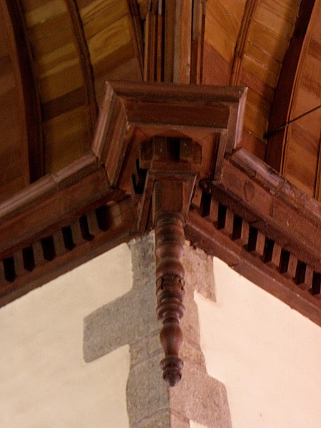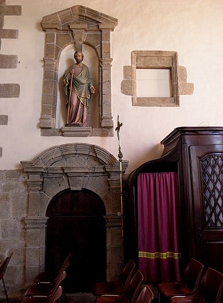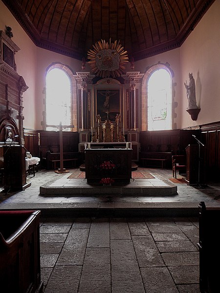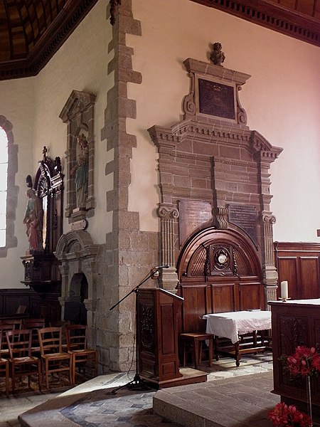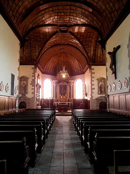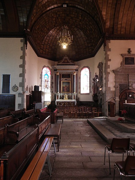 De plan en croix latine, l'église présente des croisillons et un chœur de longueur comparable, terminés en pans coupés, flanqués de deux sacristies de plan presque carré. L'élévation se développe sur un seul niveau ; la construction associe moellons de cornéenne et pierre de taille en granite pour les encadrements et les angles, le chaînage alterné marquant les arêtes. Des joints en ciment appliqués au siècle passé altèrent toutefois l'aspect originel de l'ouvrage. L'ensemble dégage une unité stylistique classique, sobre, mais certains détails révèlent des moyens restreints et une exécution par phases : la corniche à modillons en granite qui couronne le chœur et le transept s'interrompt presque à la jonction avec la nef, remplacée à l'ouest par un couronnement plus simple, et des pierres de taille plus grossières et moins soignées apparaissent dans la nef. Une porte en accolade de style gothique flamboyant a été remployée dans le mur ouest de la chapelle méridionale.