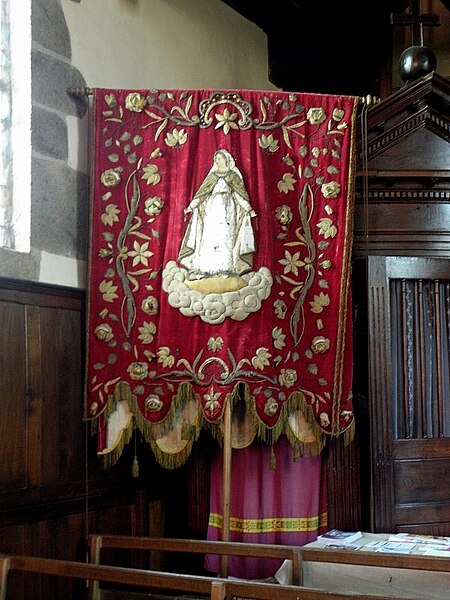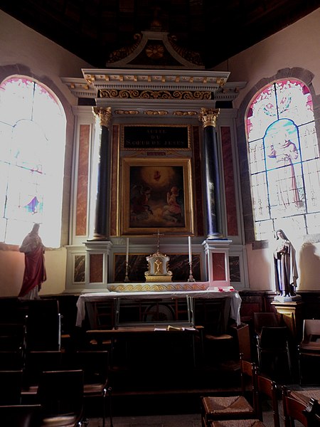 L'église abrite un ensemble homogène de six vitraux historiés, classés au titre d'objet et réalisés par l'atelier rennais Lecomte et Colin en 1879‑1880, situés dans les deux bras du transept et dans le chœur, les costales de la nef étant pourvues de verrières mécaniques. Les vitraux des croisillons, offerts en 1879 par les familles Le Bouteiller et Tréton de Vaujuas‑Langan et ornés de leurs armoiries, présentent sur fond rouge une architecture Renaissance encadrant les saints patrons des donateurs : le Christ et sainte Élisabeth de Hongrie dans la chapelle sud, saint François d'Assise et sainte Thérèse d'Avila dans la chapelle nord. Les verrières du chœur, datées de 1880 et disposées sur fond bleu, offrent respectivement la charité de saint Martin à gauche — don des paroissiens, avec le monogramme du saint et les armes du pape Léon XIII — et la scène de Blanche de Castille éduquant saint Louis à droite, don du curé Louis Tirel, dont les initiales figurent dans le soubassement ; au sommet apparaît les armoiries de Monseigneur Charles‑Philippe Place.