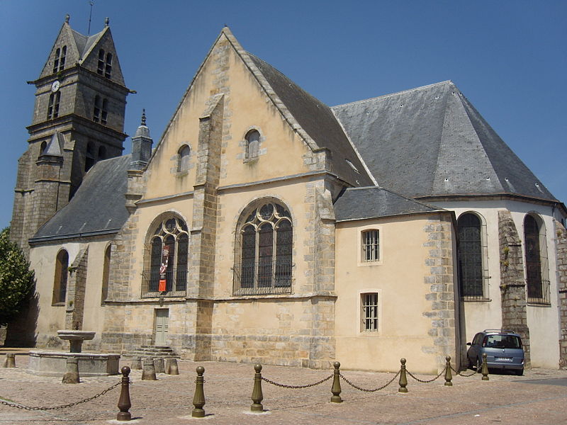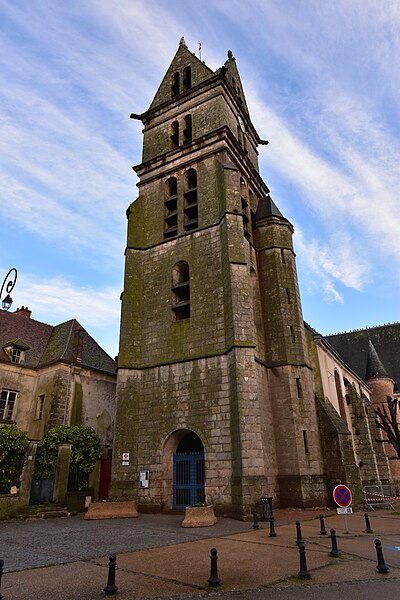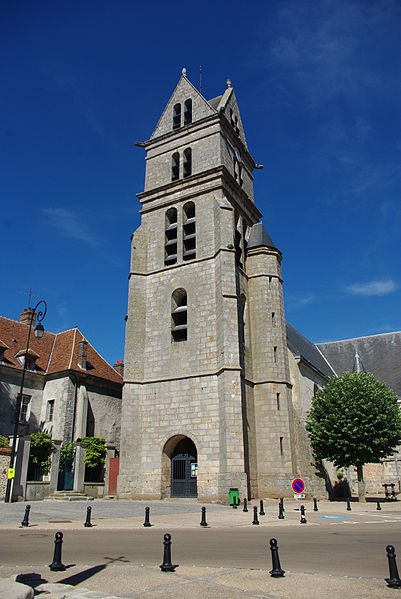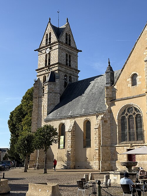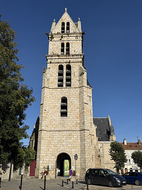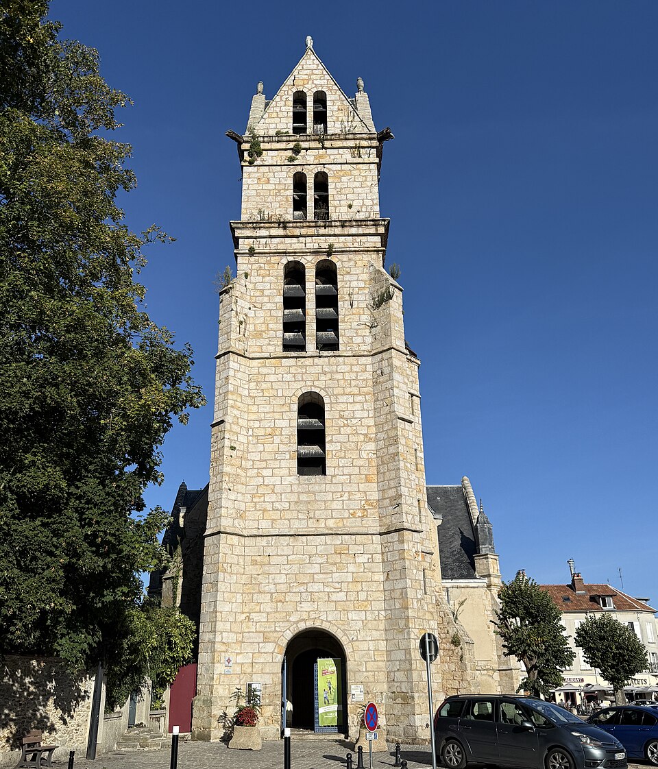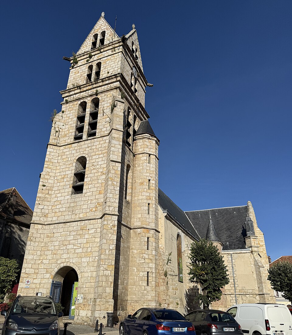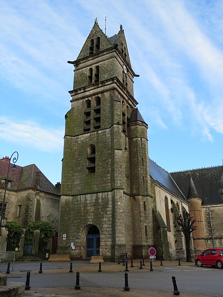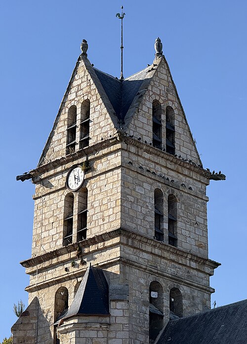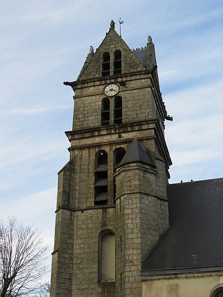 L’entrée se fait sous un clocher-tour à quatre pans, orné de gargouilles à chaque angle. Trois cloches sont en place, nommées Martine (1723), Pierrette-Marie-Louise (1900) et Marguerite-Charlotte (1900) ; la cloche Martine est par ailleurs mentionnée comme datant de 1725 et attribuée aux fondeurs Jacques et Louis Godiveau. Une tourelle en briques à trois étages marque l’angle du transept sud. À l’angle ouest de la façade se trouve une lanterne des morts dont trois faces ont été murées ; elle signalait les défunts de la paroisse. Une porte seigneuriale donnait accès à une chapelle qui leur était réservée ; cette porte reste visible à l’extérieur, mais a été murée de l’intérieur et le meneau, portant autrefois les armes des Tonnelier de Breteuil, a été abîmé pendant la Révolution.