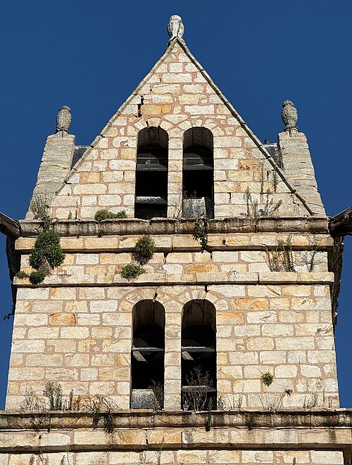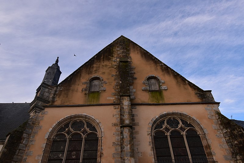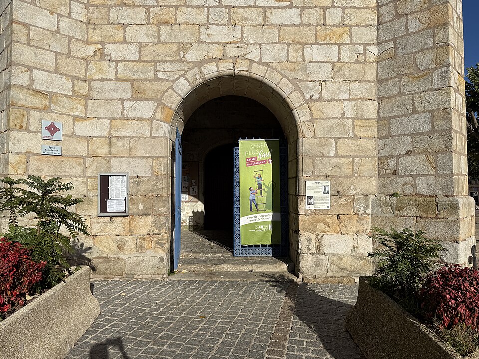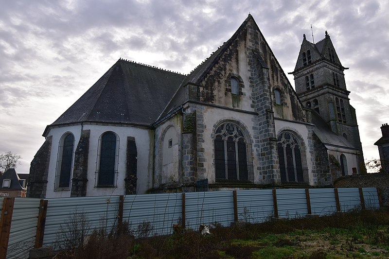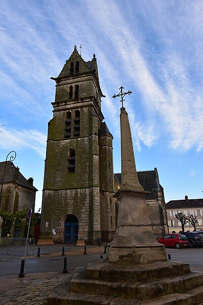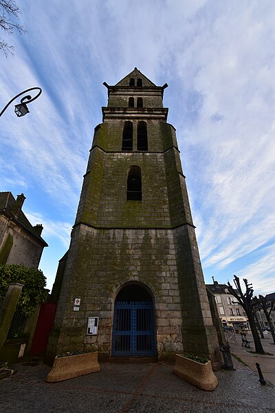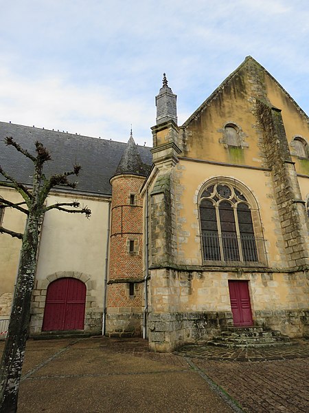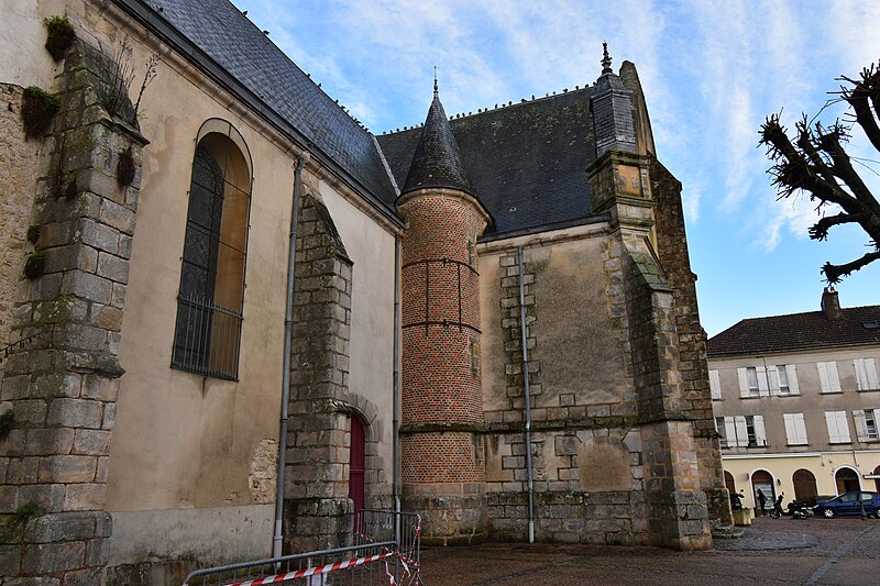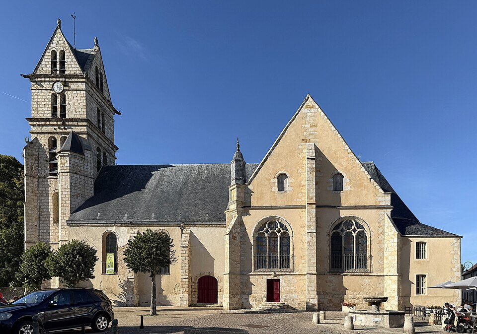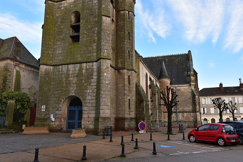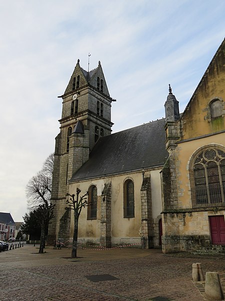 L’entrée se fait sous un clocher-tour à quatre pans, orné de gargouilles à chaque angle. Trois cloches sont en place, nommées Martine (1723), Pierrette-Marie-Louise (1900) et Marguerite-Charlotte (1900) ; la cloche Martine est par ailleurs mentionnée comme datant de 1725 et attribuée aux fondeurs Jacques et Louis Godiveau. Une tourelle en briques à trois étages marque l’angle du transept sud. À l’angle ouest de la façade se trouve une lanterne des morts dont trois faces ont été murées ; elle signalait les défunts de la paroisse. Une porte seigneuriale donnait accès à une chapelle qui leur était réservée ; cette porte reste visible à l’extérieur, mais a été murée de l’intérieur et le meneau, portant autrefois les armes des Tonnelier de Breteuil, a été abîmé pendant la Révolution.