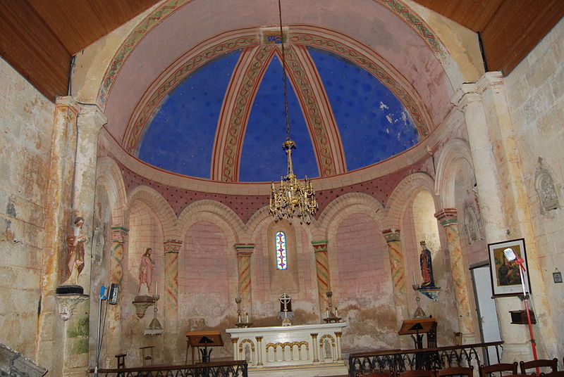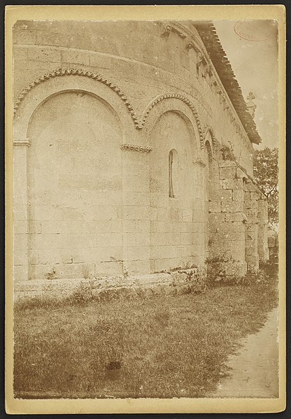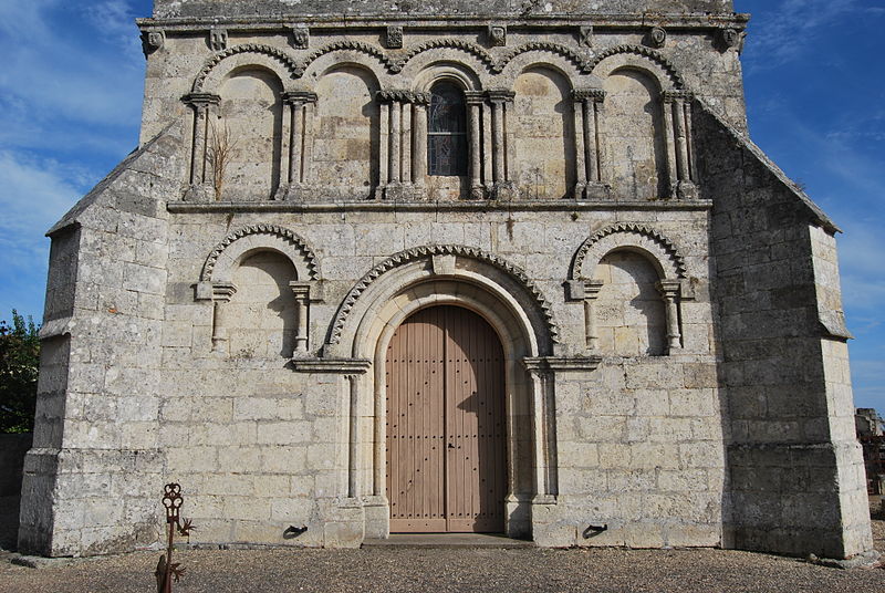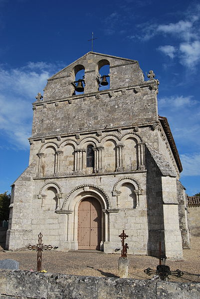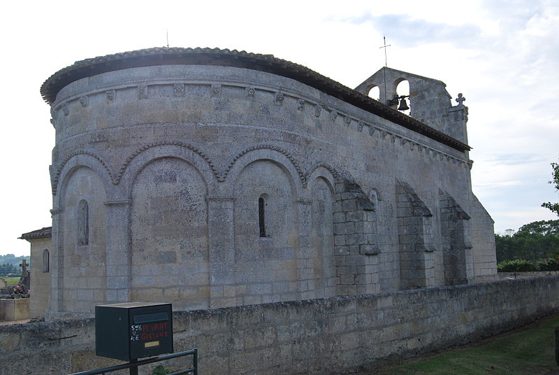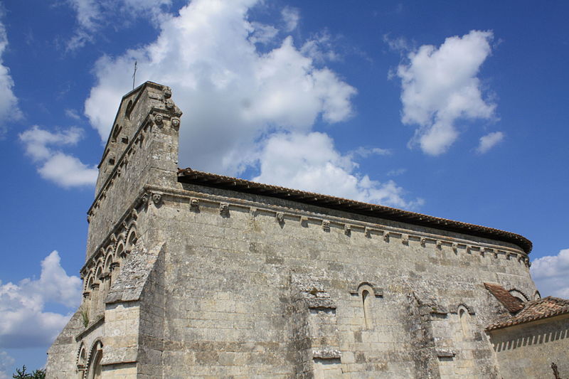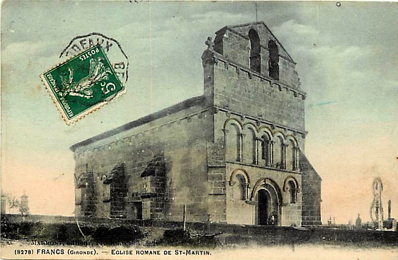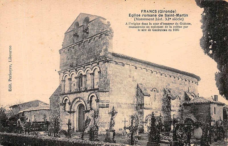 L'église Saint-Martin de Francs, en Gironde, est implantée au sommet d'un tertre dominant des vignobles, le long de la route départementale D32. Elle présente la particularité d'afficher une ordonnance romane tout en ayant été reconstruite en 1605, après la destruction de l'édifice antérieur en 1578 lors des guerres de Religion. Francs figure déjà dans la liste des paroisses du diocèse de 1398. La reconstruction de 1605, effectuée pierre par pierre, a donné naissance à une église de plan simple : une nef unique rectangulaire terminée par une abside semi‑circulaire voûtée en cul‑de‑four, avec une sacristie au sud du chevet et un clocher‑mur sur la façade occidentale ornée d'arcatures. Les archives de visite témoignent des transformations : en 1606 le cardinal de Sourdis la décrit comme « petite et sans sacristie »; en 1617 elle est qualifiée de bâtiment achevé; un procès‑verbal de 1687 note un chœur voûté et une nef lambrissée; en 1728 elle apparaît comme annexe du prieuré‑cure Notre‑Dame de la Fayotte et le même procès‑verbal rappelle la reconstruction du XVIIe siècle. La datation et l'interprétation stylistique de l'édifice ont fait débat entre spécialistes : Auguste Bontemps y voit un ensemble de la première moitié du XIIe siècle, tandis que Jean‑Auguste Brutails considère qu'il s'agit d'une reconstruction du XVIIe siècle reprenant des formes romanes sous l'influence de l'âge classique. Sur le plan architectural, plusieurs éléments relèvent d'une relecture et d'un mélange de styles : le parti d'ensemble et certaines archivoltes sont romans, mais le relief marqué des contreforts et la section des pieds‑droits de la porte occidentale empruntent au gothique, et quelques moulures, la cannelure de colonnes et le style des modillons renvoient à un vocabulaire classique. La nef lambrissée et le niveau des fenêtres montrent que le constructeur n'avait pas prévu une voûte en berceau ; l'ordonnancement des travées et l'absence d'utilité des piles intérieures suggèrent des choix structurels réfléchis, peut‑être en faveur d'arcs transversaux soutenant la charpente. L'appareil de pierre, soigneusement réglé, est considéré comme plus soigné que celui des églises romanes locales. Les modillons qui soutiennent la corniche reprennent les motifs du roman tardif, mais sans la fonction moralisante souvent associée aux originaux. L'édifice est inscrit au titre des monuments historiques par arrêté du 1er décembre 1908 ; sont notamment distingués pour leur protection le chevet et la façade nord, la façade occidentale, le sanctuaire et les modillons.