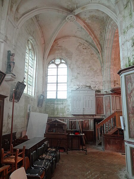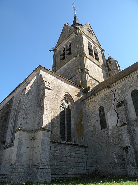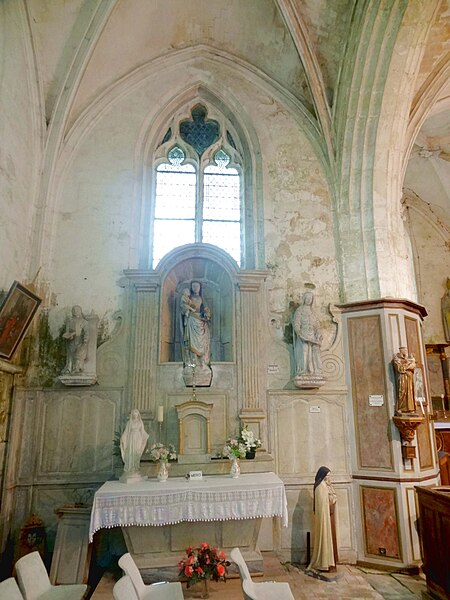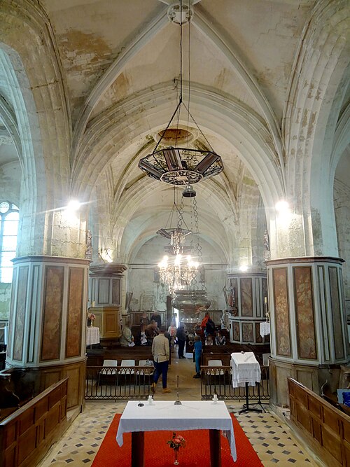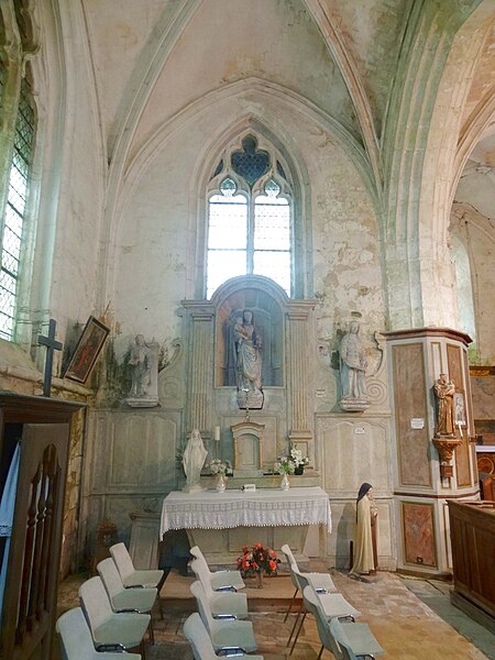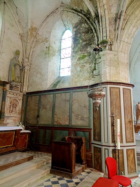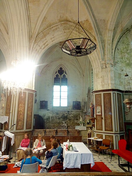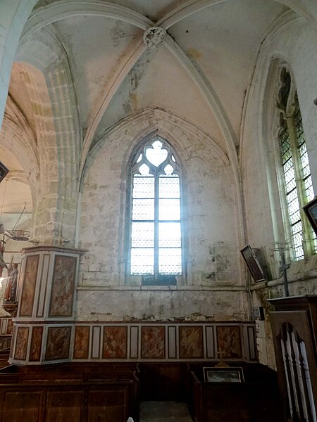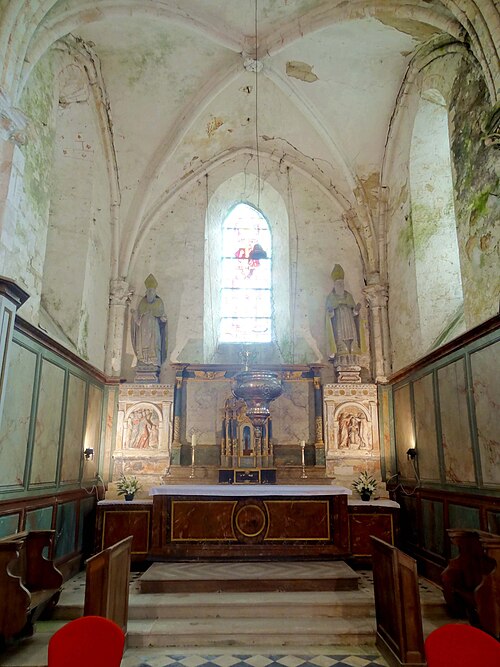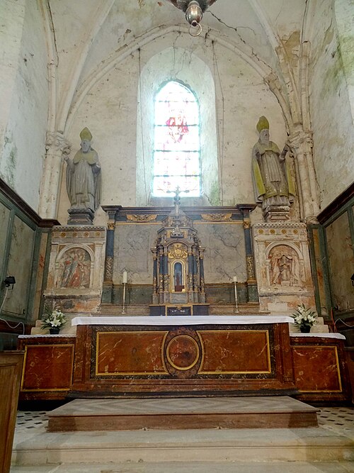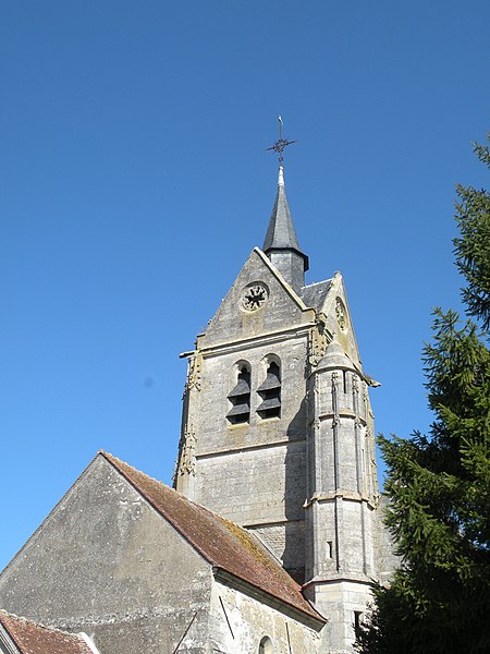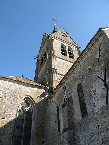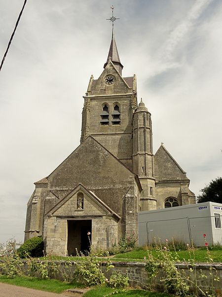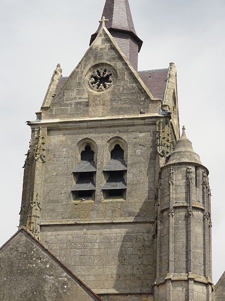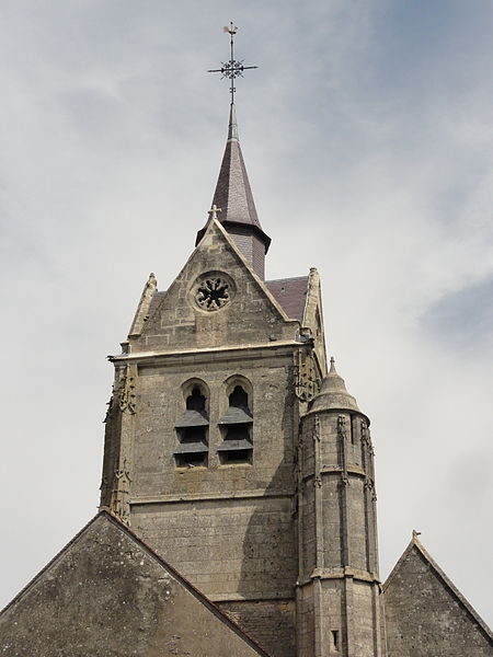 L'église Saint-Martin de Hadancourt-le-Haut-Clocher (Oise) est une paroissiale catholique dont l'essentiel résulte d'une reconstruction d'inspiration flamboyante entreprise après la guerre de Cent Ans, mais dont les maçonneries de la nef remontent au deuxième quart du XIIe siècle et témoignent d'origines romanes. La deuxième travée du chœur, d'aspect gothique, appartient au début du XIIIe siècle, tandis que la partie orientale et la croisée du transept, base du clocher, relèvent du gothique flamboyant du XVIe siècle; le croisillon sud et sa chapelle traduisent une transition vers la Renaissance. L'édifice présente un plan marqué par un net déséquilibre : une nef courte de seulement deux travées sans bas-côtés contraste avec des parties orientales plus développées comprenant transept, chœur et chapelles latérales. Orientée légèrement vers le nord-est au chevet, l'église est voûtée d'ogives sur un unique niveau d'élévation et le portail occidental constitue l'accès principal. Le clocher, remarquable par son étage de beffroi soigné et ses quatre pignons — configuration rare au nord de Paris — est couvert de deux toits en bâtière imbriqués et couronné d'un clocheton octogonal en charpente ; sa hauteur avoisine 33 mètres. Extérieurement, la nef est en moellons tandis que les croisillons et les chapelles sont appareillés en pierre de taille ; la tourelle d'escalier angle sud-est présente des niveaux octogonaux puis circulaires et un dôme en forme de cloche de facture flamboyante. À l'intérieur, la croisée du transept et la première travée du chœur forment un ensemble homogène où l'arc brisé domine; la dernière travée du chœur conserve des proportions et une voûte caractéristiques du début du XIIIe siècle, avec lancettes fortement ébrasées et chapiteaux sculptés à décor de feuilles. Les travées flamboyantes affichent des profils d'arcades et d'ogives sobres, les ogives présentant le type courant dans le Vexin : filet entre deux moulures concaves et larges gorges séparées des voûtains par des filets saillants; la clé de voûte de la première travée du chœur porte une étoile à huit branches. Le croisillon nord et sa chapelle conservent des clés de voûte ajourées et des fenêtres à réseau flamboyant, tandis que le collatéral sud témoigne d'un retour vers l'arc en plein cintre et d'un remplage à influence Renaissance. Parmi le mobilier, plusieurs éléments sont protégés au titre des monuments historiques : les fonts baptismaux en pierre calcaire, peut‑être de la seconde moitié du XIIe siècle et classés depuis 1912, ainsi que des bancs, des bas-reliefs, des statues et le tabernacle inscrits en 1989. Six bas-reliefs de la Renaissance sont encastrés dans les murs de la nef et deux autres dans le mur du chevet, figurant des scènes bibliques ou hagiographiques; d'autres sculptures en pierre ou en bois proviennent notamment de l'ancienne église de Lèvemont, rasée et partiellement transportée, et comprennent un christ en croix polychrome, une Vierge à l'Enfant et un groupe de saints martyrs. Une statue de saint Michel et une statue de saint Éloi (inscrite en 2011) font également partie des pièces signalées, tandis que la Vierge de la chapelle nord, inscrite puis classée, illustre le passage du style médiéval à la Renaissance. Le tabernacle, adossé à l'ancien maître-autel, est une composition en bois traitée en faux-marbre avec colonnettes corinthiennes réduites, entablement et niches; seul le tabernacle est mentionné comme inscrit parmi ces éléments en 1989. L'édifice a été classé monument historique par arrêté du 23 septembre 1922 et une campagne de restauration des élévations extérieures a été lancée en 2012. La commune dépend aujourd'hui de la paroisse Saint‑François‑d'Assise du Vexin (siège à Chaumont‑en‑Vexin) et n'accueille plus de messes dominicales depuis 2018. Les abords offrent une mise en valeur côté ouest depuis la place devant la façade, tandis que le chevet reste partiellement enclavé et l'ancien cimetière au sud limite la visibilité de l'élévation méridionale.