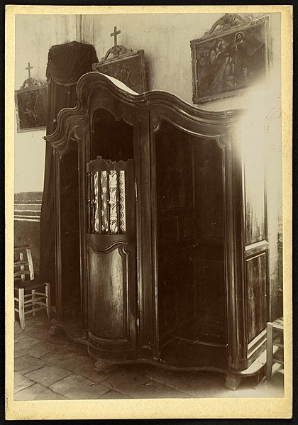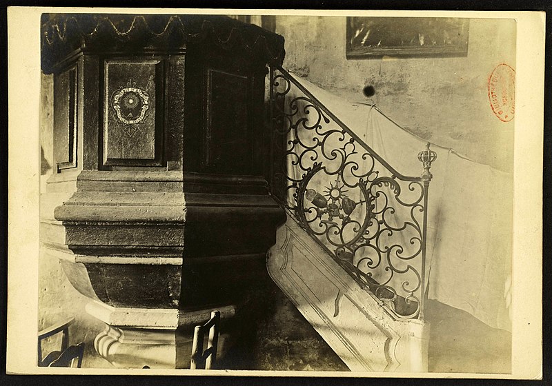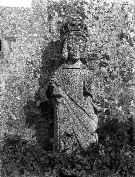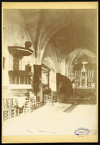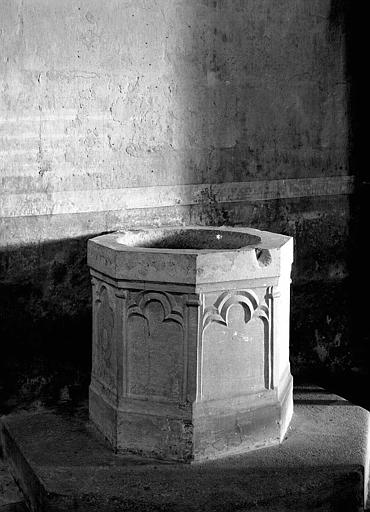 Le portail présente plusieurs voussures et des colonnes avec arcatures ornées de tores ; ses archivoltes sont sculptées de feuilles en éventail et peuplées d'animaux dont la queue en panache fait le tour du cou. Le décor sculpté mêle arabesques et figurations animales ou humaines : oiseaux et poissons encadrant personnages, oiseaux becquetant du raisin, homme assis entre deux chiens portant un cerf, oiseaux au long bec, personnage ailé posant les mains sur un homme accroupi qui mange un os, et un archange saisissant par les cheveux un homme sans doute damné. Les fonts baptismaux, taillés en un seul bloc au XVe siècle, présentent une cuve octogonale à l'extérieur et circulaire à l'intérieur, chaque face étant ornée d'une arcature aveugle trilobée ; ces fonts sont inscrits à l'inventaire des monuments historiques. L'intérieur conserve également un confessionnal du XVIIIe siècle, un ancien lutrin en bois finement sculpté représentant un aigle aux ailes déployées perché sur un cube reposant sur une colonne renflée et cannelée, ainsi que la chaire.