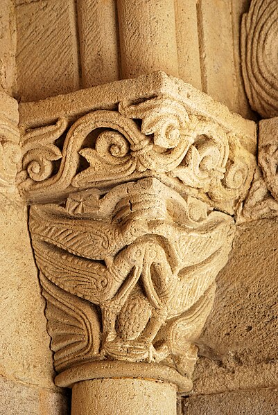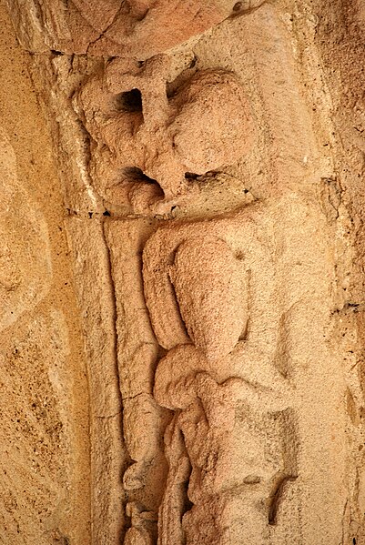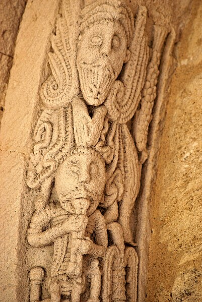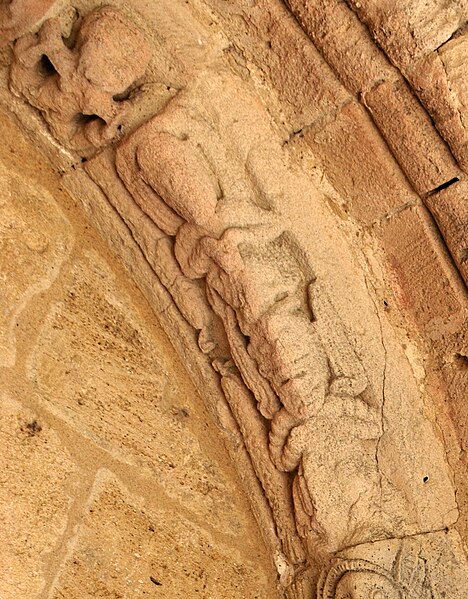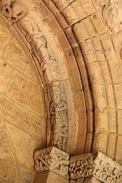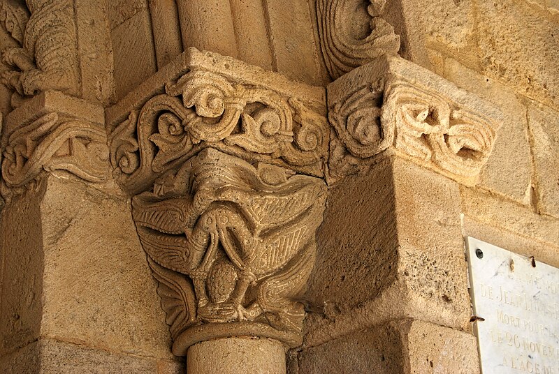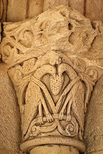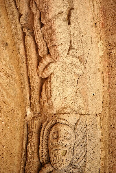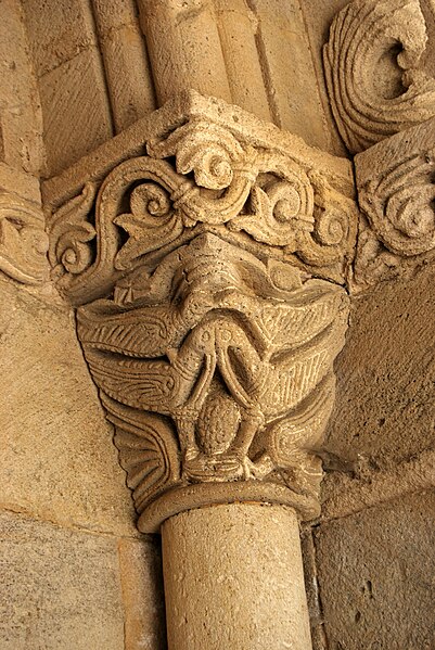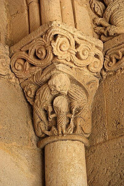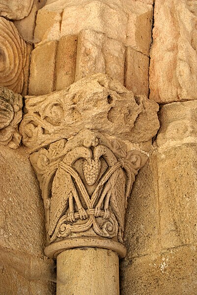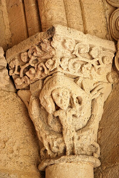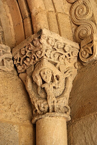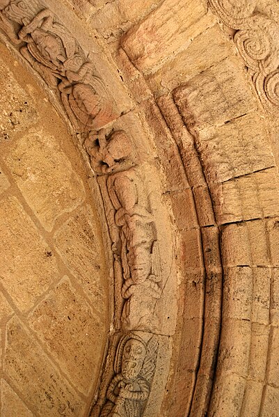 Sur l'ébrasement nord, les deux premiers chapiteaux sont des restaurations du XIXe siècle à feuilles d'eau ; le troisième montre deux oiseaux tenant un fruit suspendu aux volutes d'un sarment. Plusieurs interprétations ont été proposées pour ce motif : certains y voient une allusion eucharistique, d'autres y voient plutôt l'Upsilon majuscule symbolisant le choix entre vice et vertu, la pigne de pin ayant aussi été lue comme représentation du fruit défendu. Sur l'ébrasement sud, un chapiteau représente l'homme maîtrisant la bête, un autre la bête maîtrisant l'homme, et un troisième montre cinq oiseaux autour d'un fruit, lecture contre‑exemplaire du chapiteau nord où des oiseaux dérobent le fruit. Les voussures figurées comprennent deux files de musiciens convergeant vers une clef d'arc décalée, ornée d'une femme nue en position impudique, et composent un avertissement sur les périls moraux de la danse et de la musique. La procession animale se compose de deux files d'animaux montantes qui convergent vers une clé excentrée ; bien que nombre de sculptures soient abîmées et que l'identification des espèces soit parfois incertaine, les bêtes, souvent montrées avec un double collier et une longue queue se dédoublant en lianes foliacées, ont été considérées comme des figures maléfiques.