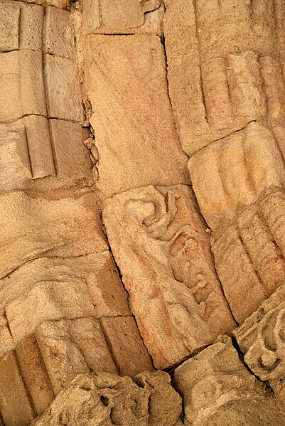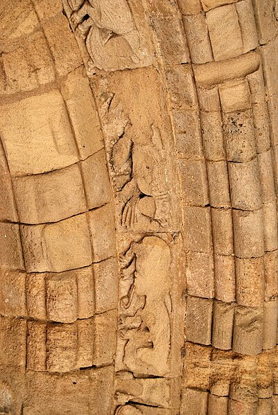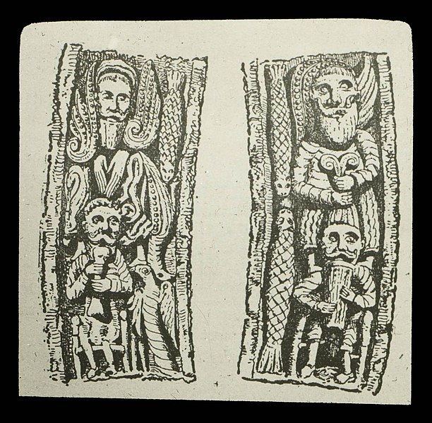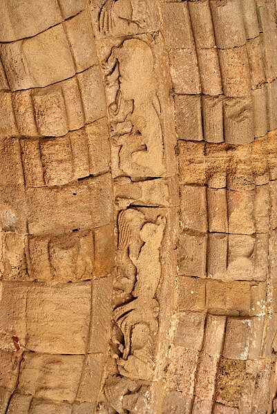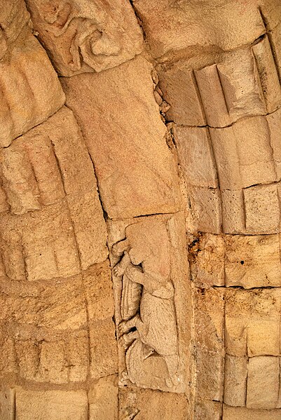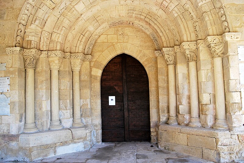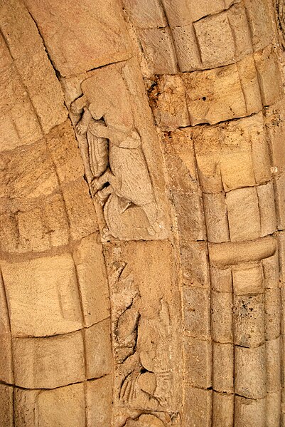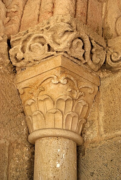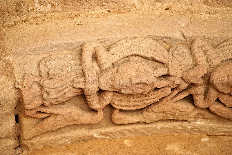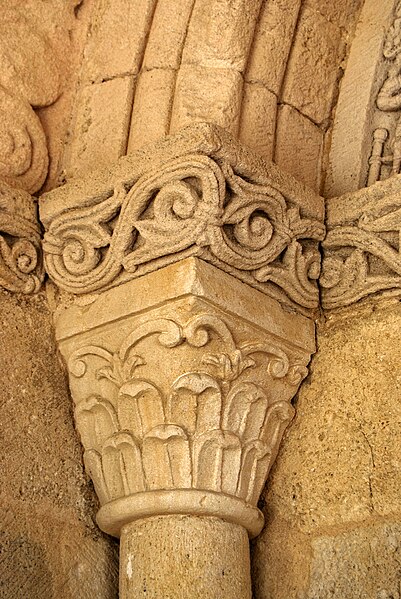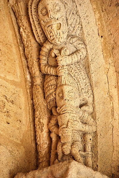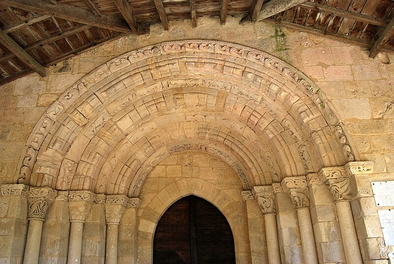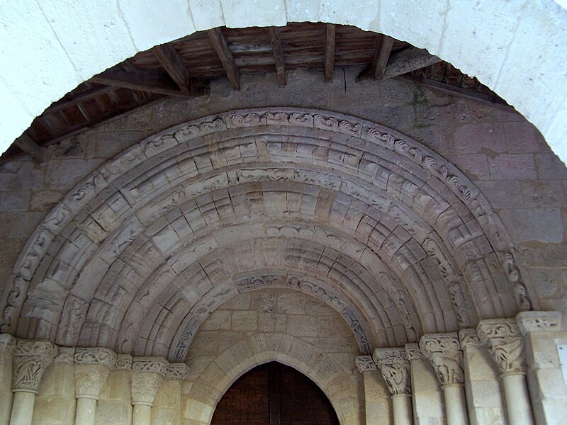 Sur l'ébrasement nord, les deux premiers chapiteaux sont des restaurations du XIXe siècle à feuilles d'eau ; le troisième montre deux oiseaux tenant un fruit suspendu aux volutes d'un sarment. Plusieurs interprétations ont été proposées pour ce motif : certains y voient une allusion eucharistique, d'autres y voient plutôt l'Upsilon majuscule symbolisant le choix entre vice et vertu, la pigne de pin ayant aussi été lue comme représentation du fruit défendu. Sur l'ébrasement sud, un chapiteau représente l'homme maîtrisant la bête, un autre la bête maîtrisant l'homme, et un troisième montre cinq oiseaux autour d'un fruit, lecture contre‑exemplaire du chapiteau nord où des oiseaux dérobent le fruit. Les voussures figurées comprennent deux files de musiciens convergeant vers une clef d'arc décalée, ornée d'une femme nue en position impudique, et composent un avertissement sur les périls moraux de la danse et de la musique. La procession animale se compose de deux files d'animaux montantes qui convergent vers une clé excentrée ; bien que nombre de sculptures soient abîmées et que l'identification des espèces soit parfois incertaine, les bêtes, souvent montrées avec un double collier et une longue queue se dédoublant en lianes foliacées, ont été considérées comme des figures maléfiques.