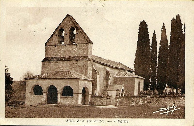 L'église Saint‑Martin est édifiée dans la commune de Jugazan, en Gironde. Elle se situe dans la partie sud du bourg, au sud de la route départementale D128 qui mène à Rauzan et à Naujan‑et‑Postiac. À l'origine prieuré du milieu du XIIe siècle et construit en style roman, elle dépendait des chanoines réguliers de Bellefond puis, à partir de 1186, de l'abbaye de La Sauve‑Majeure ; elle est restée liée à cette abbaye jusqu'en 1742. L'édifice est très composite : les quatre travées voûtées sur croisées d'ogives et le chevet plat datent du XVIe siècle. Des chapelles latérales ont été ajoutées et voûtées en arêtes aux XVIIe et XVIIIe siècles ; deux d'entre elles, créées au XVIIIe siècle, donnent à l'église une forme de croix latine. Une restauration partielle a été réalisée au XIXe siècle. De l'ancien édifice roman subsistent quatre chapiteaux et les voussures du portail. L'édifice se termine par un chevet plat et, au fond de la nef, une tour ronde abrite l'escalier à vis menant au clocher. Le chœur est voûté sur croisées d'ogives et des fenêtres flamboyantes ont remplacé les baies romanes lors de la reprise des voûtes. La pierre du portail a été peinte en rouge.