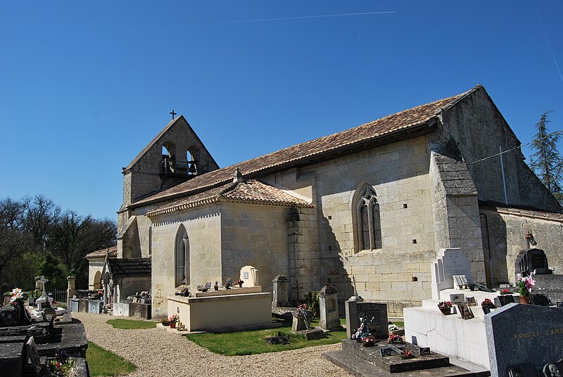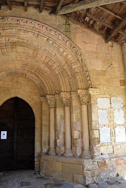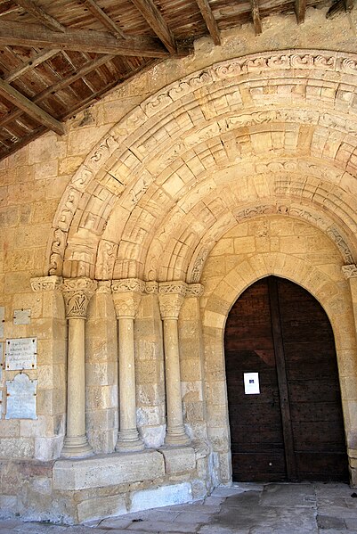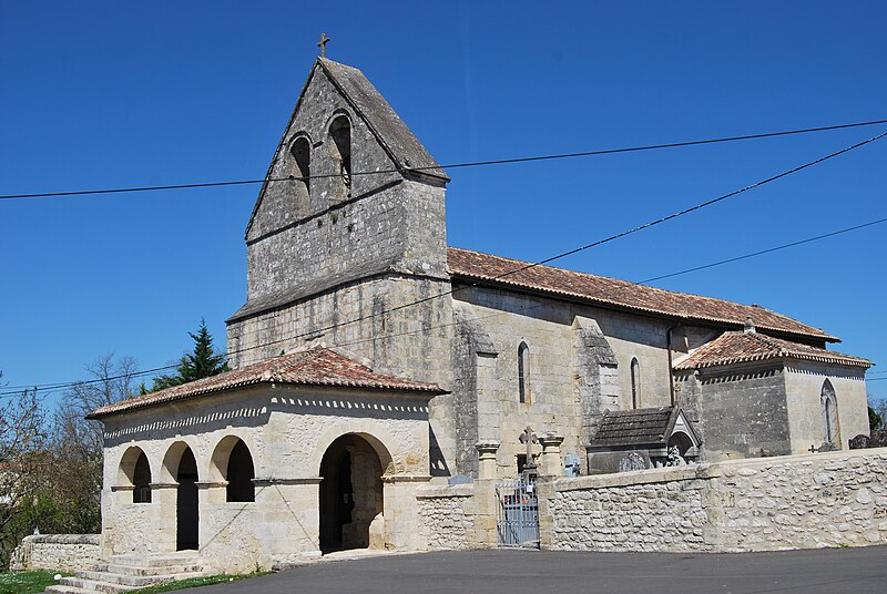 L'église est inscrite au titre des monuments historiques par arrêté en date du 23 septembre 1966. L'iconographie du portail a fait l'objet d'une lecture détaillée : trois grandes voussures s'appuient sur six chapiteaux et plusieurs cordons intercalaires, l'archivolte externe étant rythmée d'un motif à feuilles recourbées de style poitevin. Deux des cordons portent des figures : l'un met en scène une série de musiciens et d'auditeurs illustrant la luxure, l'autre une procession d'animaux qualifiés de maléfiques. Ce portail, comme ceux de Gabarnac et de Saint‑Martin‑de‑Sescas, ne présente guère de symboles chrétiens explicites ; son programme profane fonctionnait pourtant comme un sermon visuel destiné à avertir des embûches morales.