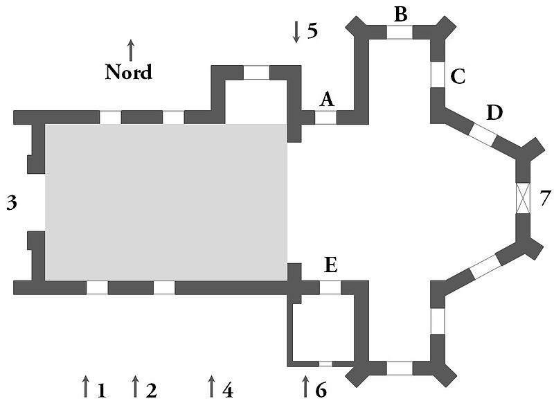 Diverses armoiries décorent l'église, notamment celles d'Averton (de gueules à trois jumelles d'argent) qui figurent au‑dessus de plusieurs vitraux, parfois associées à d'autres blasons; les seigneurs d'Averton du Grand Perray aux XVe et XVIe siècles ont participé financièrement à la reconstruction de l'édifice, selon une pièce manuscrite citée par Legeay. D'autres écus — d'argent à deux sautoirs de gueules et de gueules à un lion d'argent — sont également présents, mais les réparations successives ont peut‑être altéré les émaux et métaux primitifs.
