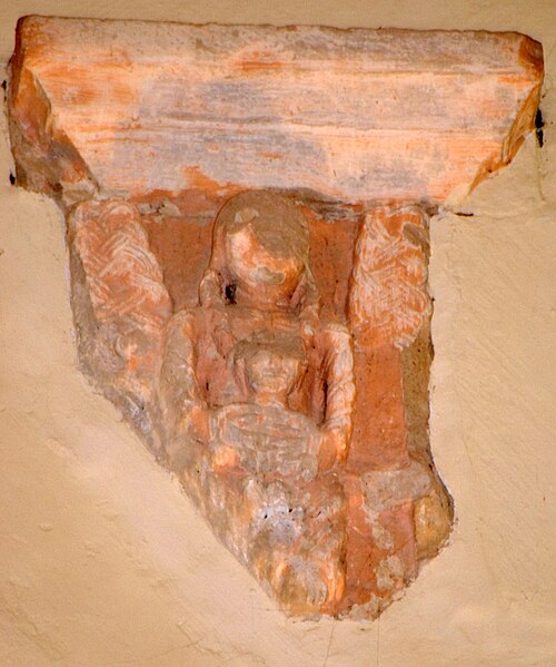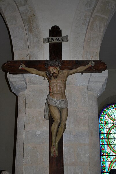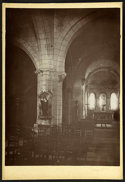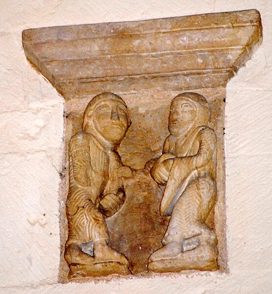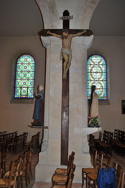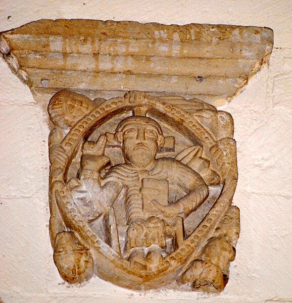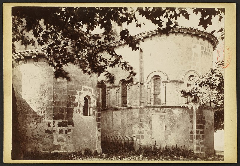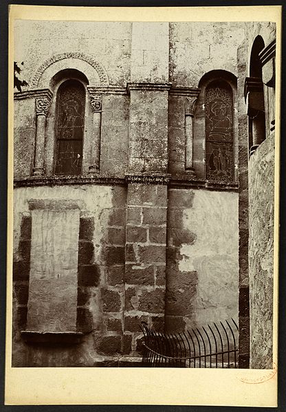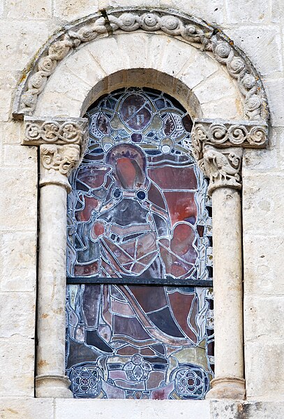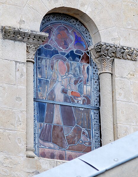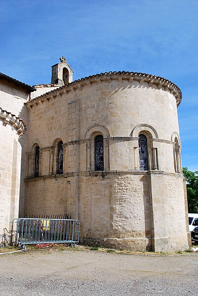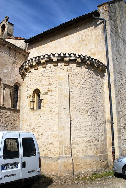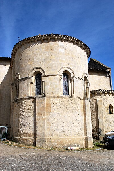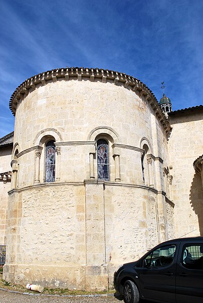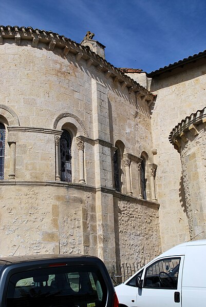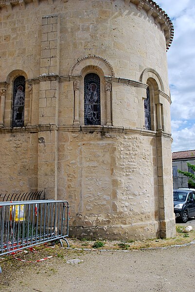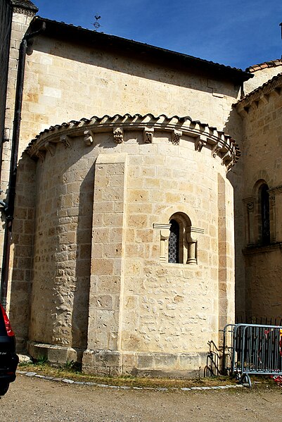 À l'extérieur, l'appareil roman comprend le portail à archivolte en plein cintre, l'abside et les absidioles ; l'abside actuelle, percée de neuf baies symétriques, résulte en grande partie d'aménagements de la seconde moitié du XIXe siècle. La corniche de l'absidiole sud repose sur quatorze modillons sculptés, datés de la fin du XIIe ou du début du XIIIe siècle, qui associent figures (dont un homme portant une barrique et deux oiseaux buvant au même calice) et décors d'entrelacs ou de rinceaux. La corniche de l'abside comporte trente‑huit modillons, dont dix sculptés, également attribuables à la même période. Les chapiteaux des baies de l'abside et du transept présentent un riche répertoire sculpté roman : lions, porteur de poisson, équidé, lièvre, rinceaux et motifs végétaux figurent sur les corbeilles. Sur la façade nord de l'abside et la façade sud existaient des ouvertures rectangulaires murées : diverses hypothèses ont été émises, mais un croquis de 1837 conservé aux Archives départementales montre qu'il s'agissait alors de la porte d'entrée d'une sacristie nord aujourd'hui démolie.