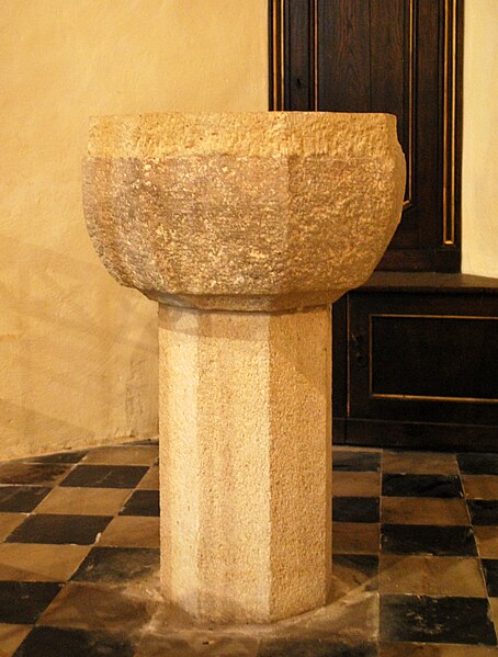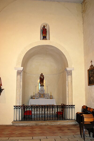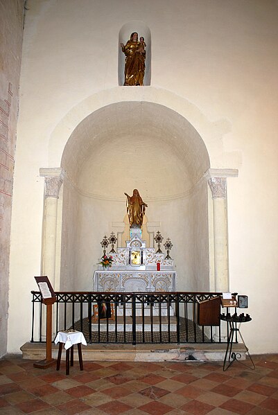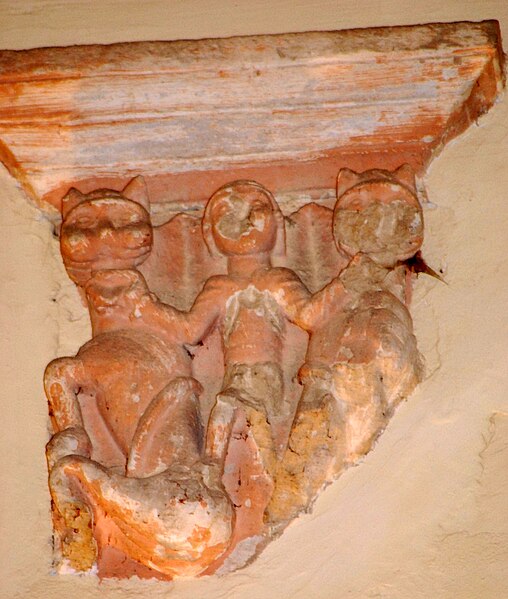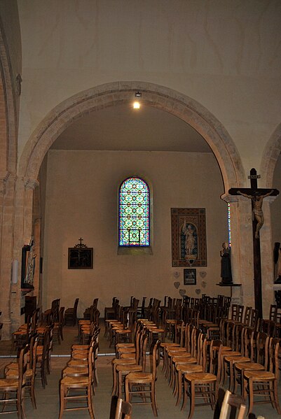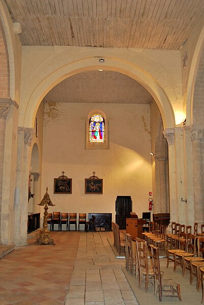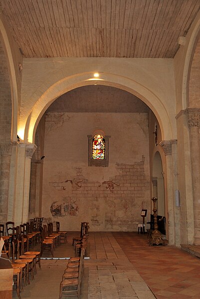 À l'intérieur, la sculpture romane est concentrée sur les chapiteaux du carré du transept, des entrées d'absidioles, de l'arc triomphal, de l'arc du chœur et de l'abside. Les deux chapiteaux de l'arc triomphal constituent un ensemble remarquable : au nord, Daniel dans la fosse aux lions, et au sud des animaux crachant des rinceaux. Le chapiteau nord de l'arc du chœur porte une scène figurée montrant une créature féminine diabolique, un homme lié par des cordes et un ange tenant un livre, interprétée comme une mise en garde destinée au clergé. Des hauts‑reliefs romains remployés du XIIIe siècle ornent l'arc occidental du transept ; quatre d'entre eux, représentant notamment une Rencontre attribuée à Joachim et Anne, le Christ en mandorle entouré de la Tétramorphe, le « faux Daniel » et la Vierge à l'Enfant, sont classés objets historiques depuis 1984. Des traces de peintures murales subsistent dans le bras nord du transept et d'autres décors peints ont été repérés lors des restaurations.
