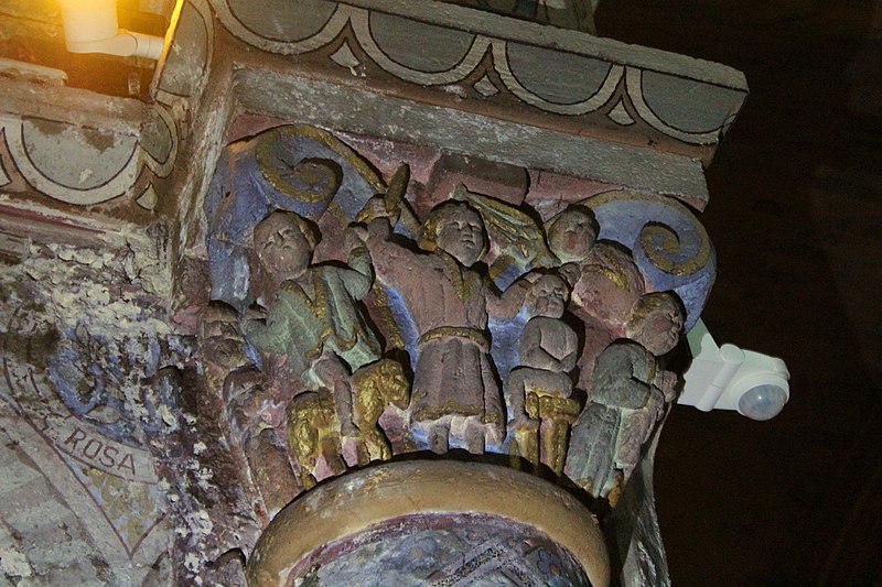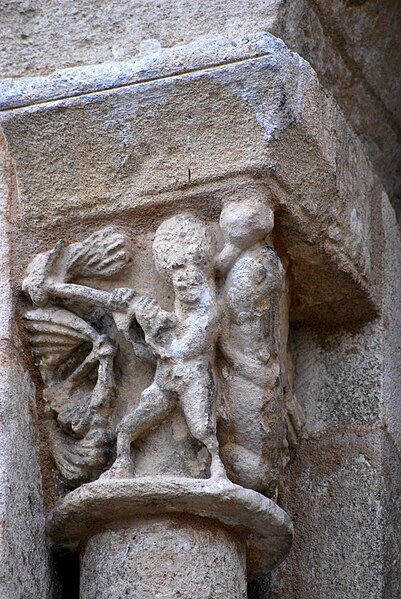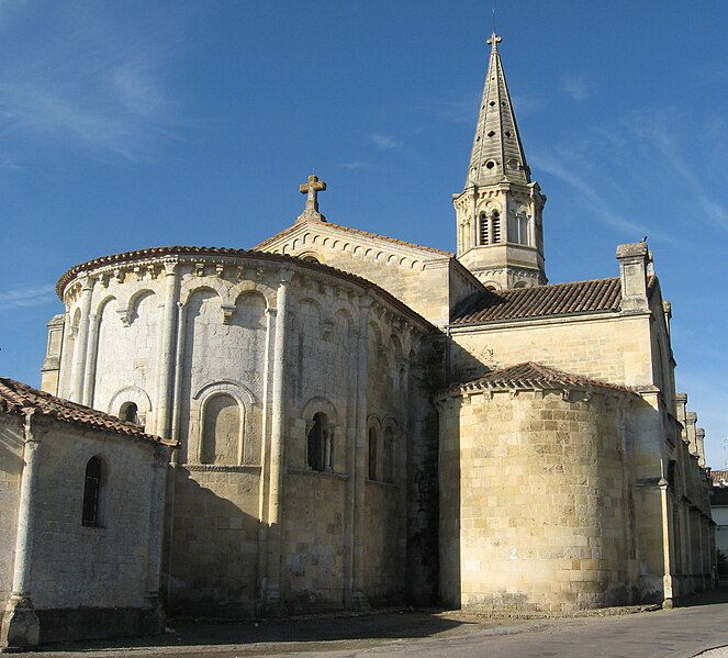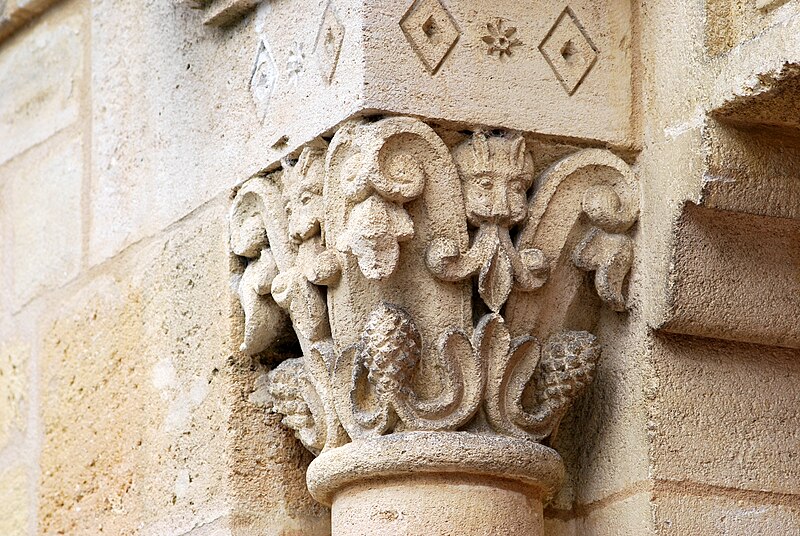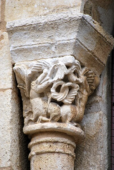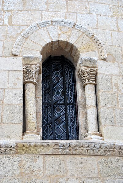 Les fenêtres du chevet sont encadrées de chapiteaux historiés : l'un représente une femme nue entourée de serpents qui tètent ses seins, symbole ancien du serpent et de la tentation ; un autre montre un homme armé d'une hache, sur le point de frapper la tête d'un personnage debout, scène probablement liée au martyre de saint Eutrope ; d'autres chapiteaux offrent des feuillages et deux dragons dos à dos aux queues recourbées, happant deux oiseaux. D'autres sculptures, proches du thème du "Homme vert" ou cracheurs de rinceaux, figurent des personnages aux oreilles pointues et des hommes accompagnés de griffons, figures interprétées comme malfaisantes et symbolisant le flot de paroles mensongères.