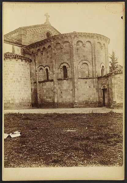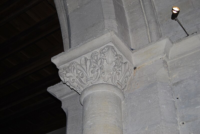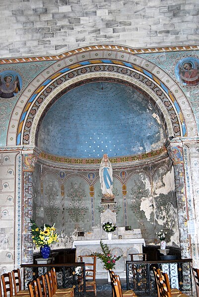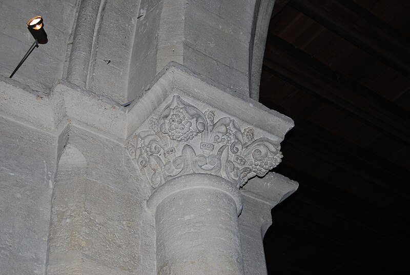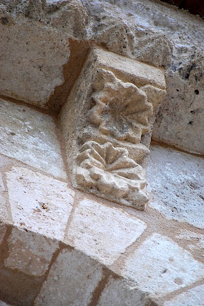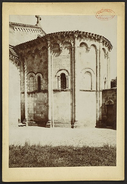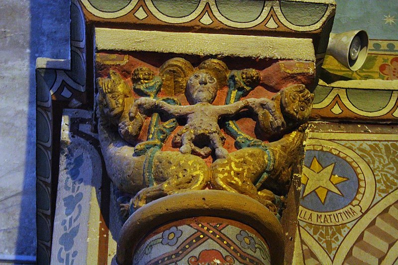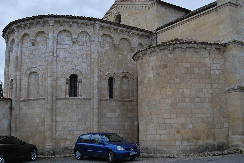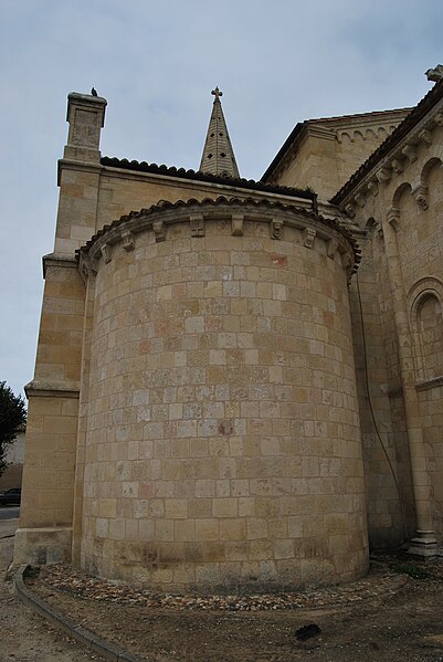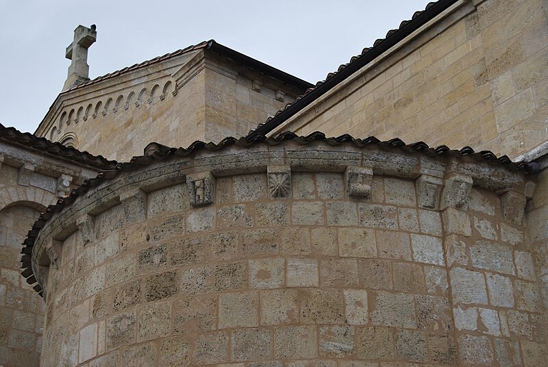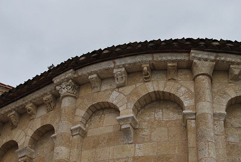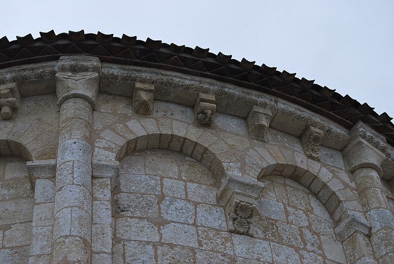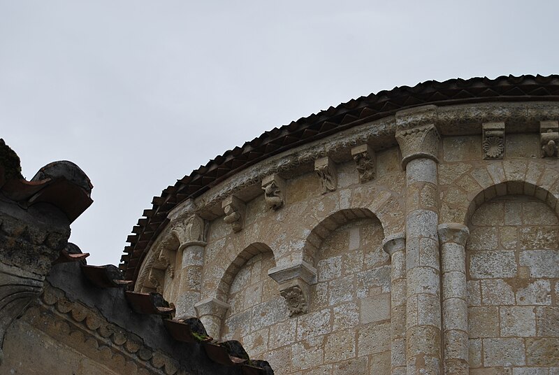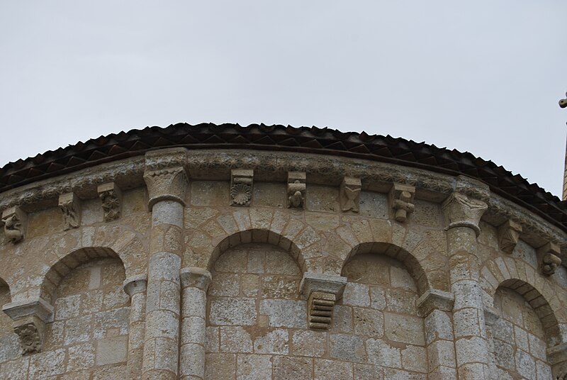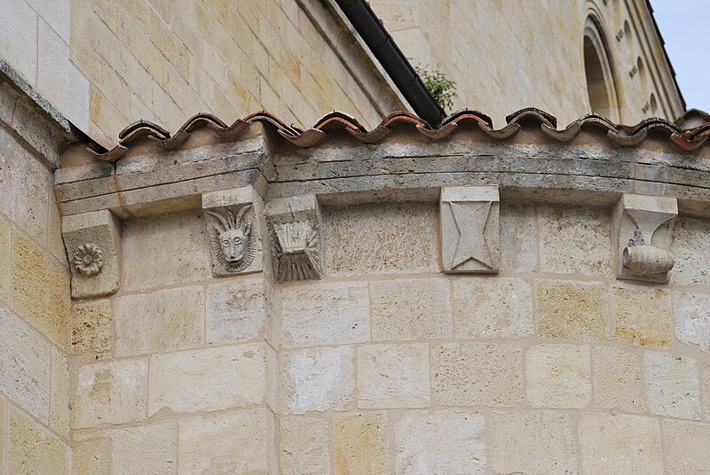 La corniche du chevet est garnie de modillons variés — symboles phalliques, tonnelets, coquillages, figures qualifiées "égyptiennes", un caladrius, un homme portant un tonnelet, monstres, serpents, une sirène bi-caudale, entrelacs et lièvres — qui mettent en scène les péchés et les vices : le péché de chair est suggéré par le symbole phallique et la sirène aux deux queues, l'ivresse par le tonnelet, l'avarice par un homme portant une bourse avec un démon plaçant un tonnelet sur son dos, et le lièvre renvoie à la débauche. Le caladrius, oiseau qui détourne la tête, conserve la réputation médiévale de prophétiser le sort d'un malade et, dans ce répertoire, signale la maladie morale qu'on imputait aux paroissiens et aux pèlerins.