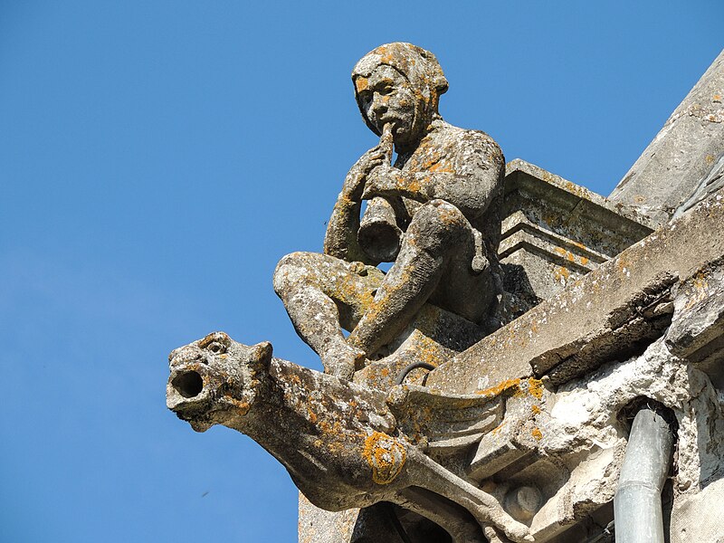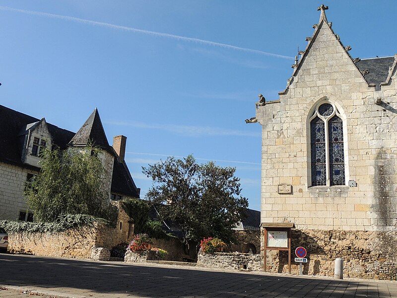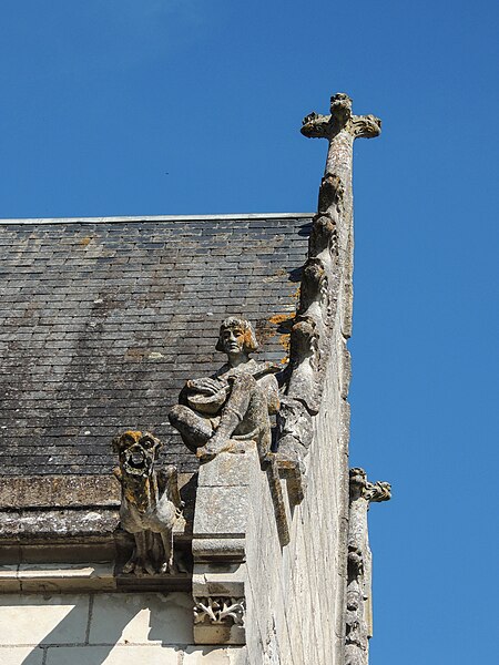 Le transept, achevé au XVIe siècle grâce à des mécènes, porte sur sa clé de voûte les armoiries de Geoffroy II de Chemens et Marthe de Baïf ; le clocher, reconstruit en tuffeau sur des bases plus anciennes, est de forme carrée et se signale par une corniche moulurée et un décor en trois registres d'oves, de feuilles d'acanthe et d'une fausse balustrade. Le portail, remonté pierre par pierre sur la nouvelle façade après l'incendie, illustre la transition gothique-Renaissance par un groupe mutilé représentant la Charité de saint Martin, tandis que les murs extérieurs sont ponctués de gargouilles et de figures grotesques.