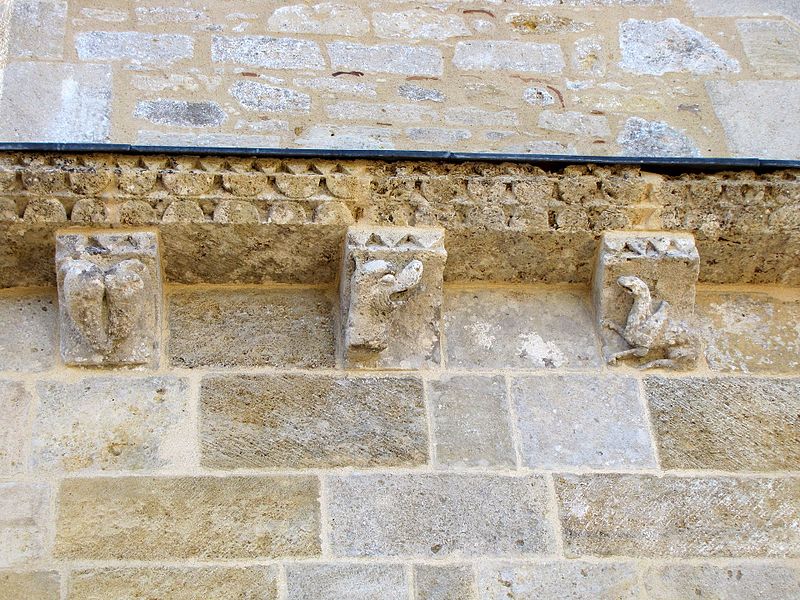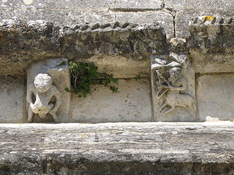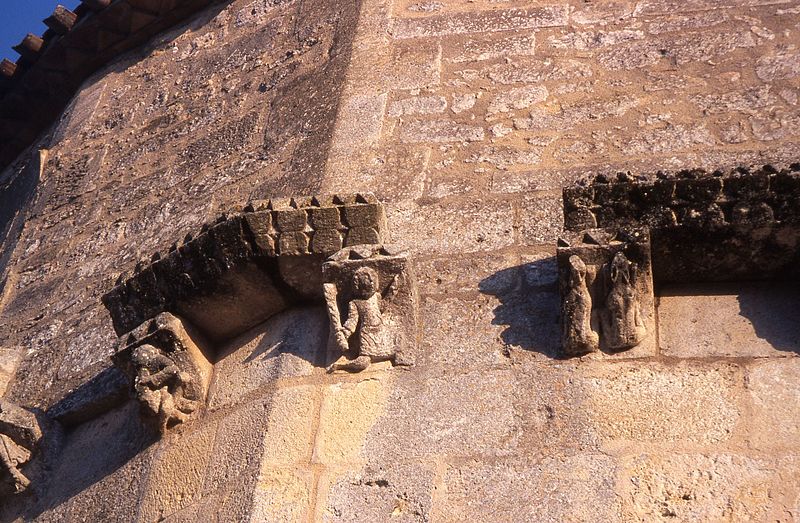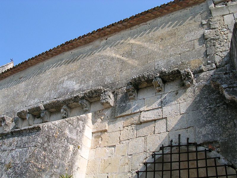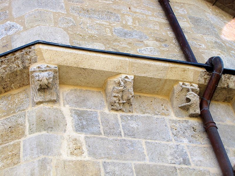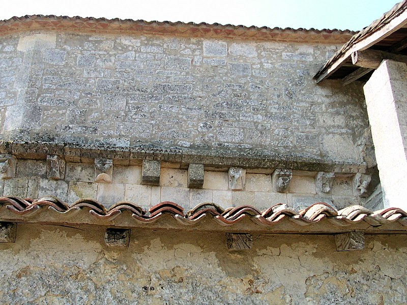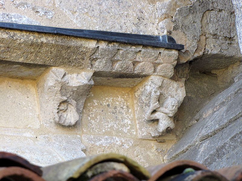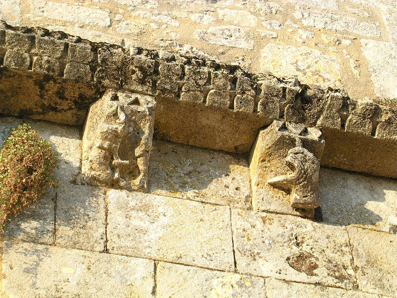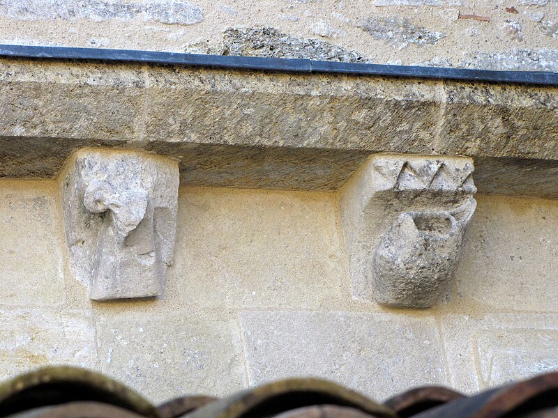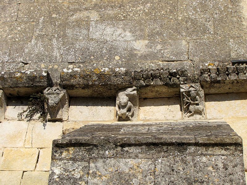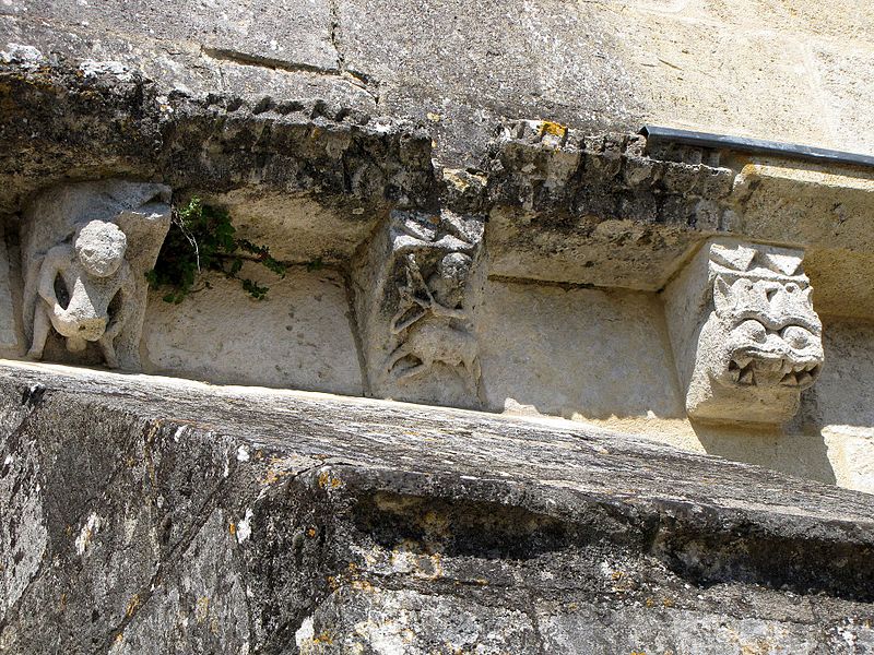 Les modillons sont des supports placés en saillie sous la corniche pour en soutenir l'extrémité; leur ornementation peut être géométrique ou figurative. Ils peuvent représenter des animaux, des créatures mythologiques, des monstres ou des personnages humains et illustrer des activités variées comme la musique, le travail ou des scènes à caractère sexuel, ce qui peut surprendre sur le chevet d'une église. De tels modillons « obscènes » ou impudiques sont fréquents sur les églises romanes de France, d'Angleterre, d'Irlande et d'Espagne. Le clergé exerçait un contrôle sur l'iconographie dans les églises depuis le deuxième concile de Nicée en 787, ce qui laisse penser que ces images répondaient à une intention. La représentation des animaux dans l'art médiéval occidental étant codifiée dans les bestiaires, on retrouve des thèmes similaires dans la décoration romane à travers l'Europe. Les modillons servaient aussi à illustrer et à dénoncer les péchés charnels par des images facilement compréhensibles pour des populations peu instruites, formant ainsi un « sermon en pierre ». Les modillons de l'église Saint-Martin couvrent presque tous ces thèmes. On y reconnaît, entre autres, un exhibitionniste anal, un centaure, une tête démoniaque, deux chiens, une scène de masturbation, un joueur de psaltérion, un homme armé d'une massue, un diablotin, des motifs végétaux et géométriques, un tonneau de vin, une tête d'homme, un satyre avec une femme, une tête de basilic, un félin, une cruche et un joueur de cor. L'exhibitionniste est représenté nu, accroupi, montrant son anus d'une main et indiquant celui-ci de l'autre. Le centaure, souvent associé dans l'art roman à des figures sataniques ou libidineuses, y est figuré dans une attitude de menace ou de rétribution vis‑à‑vis de l'exhibitionniste. Le satyre et la femme ont souffert de l'iconoclasme : on devine une femme nue debout devant un homme agenouillé, ce dernier portant un phallus pointu et deux petites cornes au‑dessus des oreilles, signe de la caractérisation diabolique de la chair.