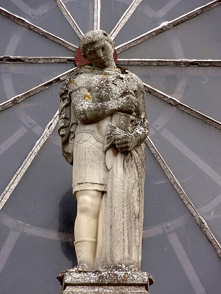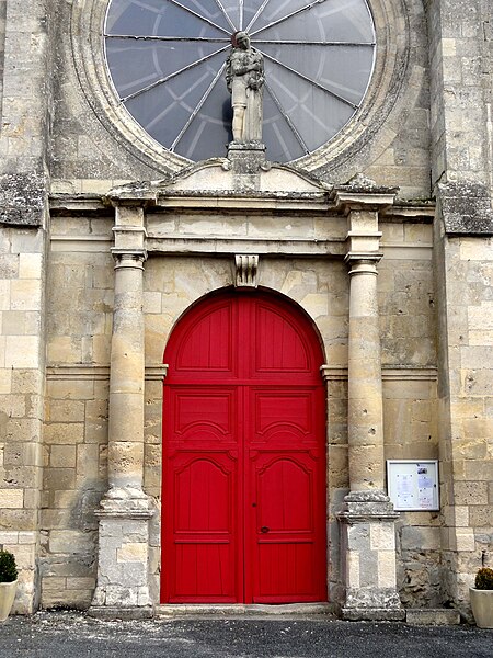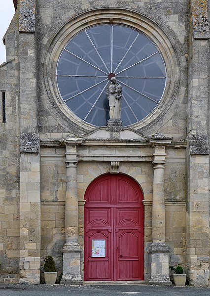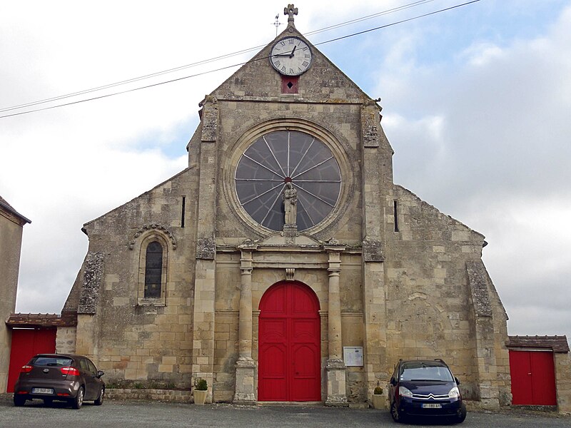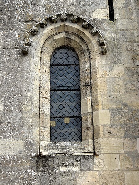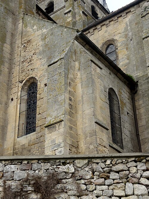 À l'extérieur, la façade occidentale porte le portail néo-classique refait en 1773, sur lequel a été ouverte une grande rosace dépourvue de remplage, tandis que les contreforts gothiques conservent des larmiers et des modénatures anciennes, parfois décorés d'un animal sculpté en haut-relief. Les murs gouttereaux et les croisillons montrent une corniche de corbeaux et des contreforts caractéristiques de la première période gothique, et le clocher central, peu élevé, s'ouvre par de petites baies en plein cintre au niveau du beffroi.