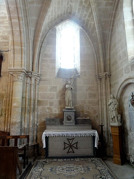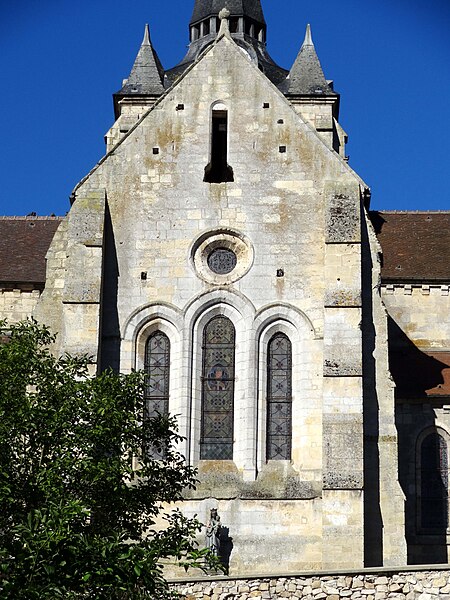 La croisée du transept, de plan carré, est renforcée par des pilastres intérieurs destinés à soutenir le clocher ; les élévations des croisillons comportent de hautes lancettes fortement ébrasées vers l'extérieur et des ouvertures en plein cintre sur les faces occidentales. Le chœur reprend le même appareil de supports que la croisée et s'ouvre sur un triplet de lancettes en arc brisé surmonté d'un oculus ; le parti constructif se caractérise par l'absence de hiérarchie marquée entre les diamètres des fûts, ce qui est ici une particularité notable. La chapelle nord est dédiée à saint Joseph et la chapelle sud à la Vierge ; la clé de voûte de la chapelle nord représente un évêque identifié comme saint Martin par une lettre gravée sur le livre qu'il tient.