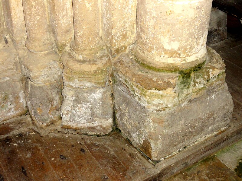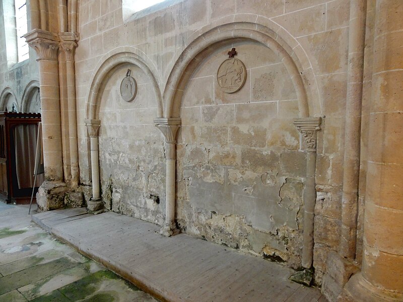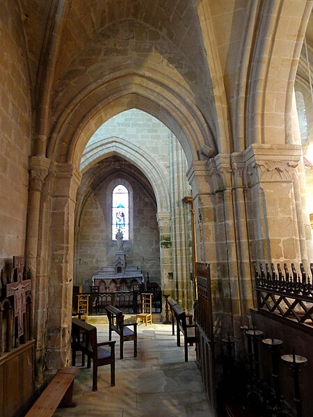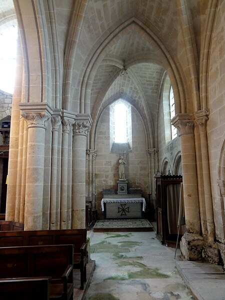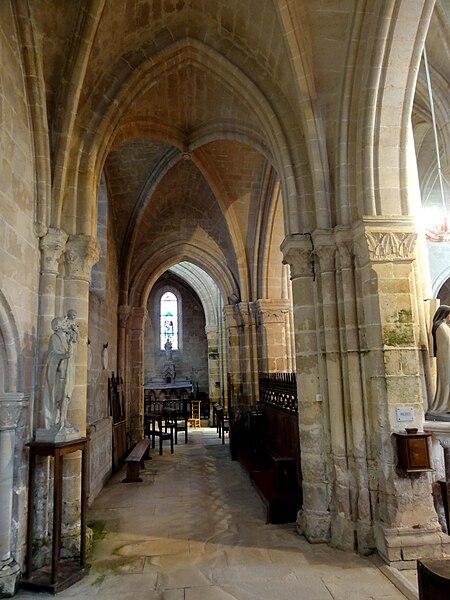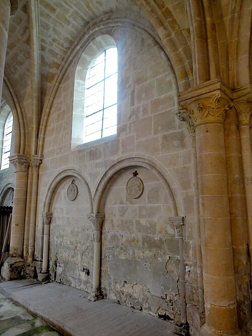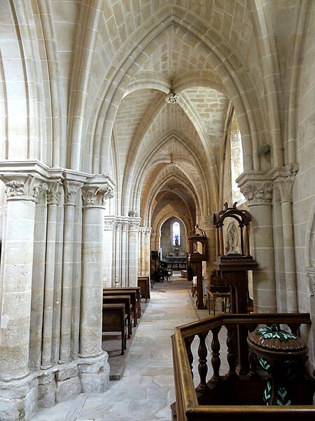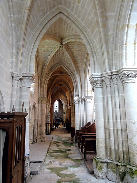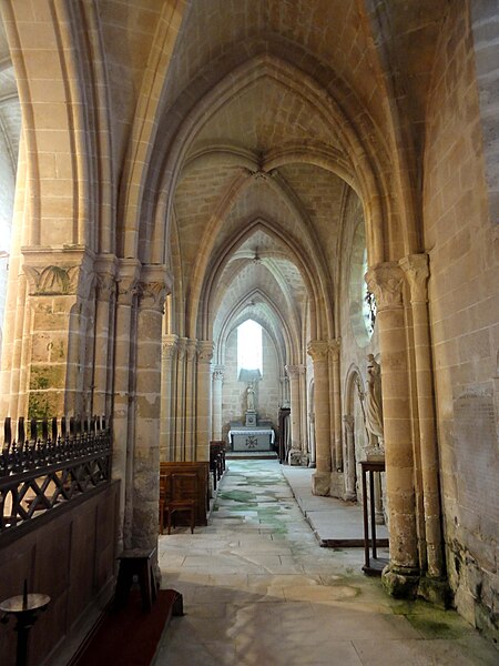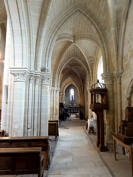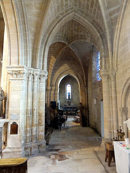 À l'intérieur, les supports associent piliers cantonnés de colonnettes et faisceaux de fines colonnettes logées dans les angles ; les chapiteaux portent des feuilles polylobées ou des crochets gothiques et les clés de voûte sont ornées de couronnes de feuillages parfois flanquées de têtes humaines ou monstrueuses. Les grandes arcades présentent des profils variés — simple rouleau vers la nef, double rouleau vers les bas-côtés — et la dernière travée à l'est est plus ancienne que les autres, ce qui se traduit par des différences de sculpture et de modénature. Dans les bas-côtés, des arcatures plaquées en plein cintre apparaissent dans les trois premières travées et retombent sur colonnettes aux chapiteaux finement sculptés ; les voûtes y adoptent des profils adaptés à leur moindre superficie et les clés de voûte affichent des motifs de rosaces ou d'écussons.