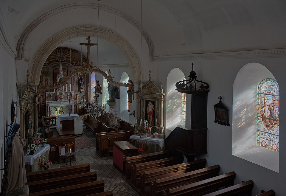 L'église Saint-Martin-et-Sainte-Trinité de Néville-sur-Mer est un édifice catholique situé dans le bourg de l'ancienne commune de Néville-sur-Mer, aujourd'hui intégrée à la commune nouvelle de Vicq-sur-Mer, dans le département de la Manche en Normandie. L'édifice est inscrit au titre des monuments historiques par arrêté du 7 mars 1975. Peu après sa fondation, les seigneurs de Néville ont donné le patronage de l'église à l'abbaye de Montebourg ; selon le Livre Noir (1251-1274), l'abbé percevait la moitié des poissons et les deux tiers de la dîme évalués à 40 livres avec 66 quartiers de froment, le reste, estimé à 30 livres, revenant au curé. Lors d'une visite en 1681, l'archidiacre jugea le chœur « assez propre » mais demanda le retrait de certaines représentations de saints jugées indécentes. À partir de 1682, on rebâtit la tour-clocher en granit pour remplacer le clocher ruiné ; elle est surmontée d'une terrasse à quatre tourelles reliées par un garde-fou formé de balustres de granit, d'un modèle inspiré du clocher de Saint-Pierre-Église. L'église fut recouverte en 1686, travaux qui endettèrent la fabrique de 147 livres et 15 sous, somme que le curé régla sur ses propres deniers. En 1763 on abat le vieux chœur roman et les parties de l'église du XIe siècle qui ne pouvaient être conservées ; la nef fut rallongée, le chœur agrandi et une sacristie ajoutée. Le presbytère fut reconstruit vers 1880 sous le ministère de Benjamin Lefeuvre. Pendant la Seconde Guerre mondiale, la tour fut occupée par les Allemands, qui y installèrent un poste de surveillance et de direction de tir dans une guérite en bois. Sous le vocable de Saint-Martin et de la Sainte-Trinité, l'église a conservé des éléments romans : une partie de la nef avec, côté nord, trois fenêtres-meurtrières surmontées d'un larmier orné de dix modillons, et côté sud quatorze modillons du larmier, ainsi que le portail méridional et deux fenêtres-meurtrières. L'intérieur conserve l'arc roman du chœur de l'édifice d'origine et, au-dessus du portail méridional, le tympan sculpté d'un saint Martin en 1928. Le mobilier comprend une perque, des lambris dans le chœur et diverses statues ; les bancs placés en 1772 furent vendus le 22 juin 1794 pour 178 livres et 5 sous et remplacés au début du XIXe siècle par les bancs actuels. Lors de leur installation en 1772, le banc n°1 côté de l'épître était réservé au chevalier de Beaumont, seigneur de la paroisse, le n°2 à Louis-François Lehérisier, écuyer, tandis que côté de l'évangile le n°1 était réservé à Pierre de Beaudrap, écuyer à Herclat, qui se faisait représenter par son fermier Bon Pontus. L'église abrite également un ex-voto représentant le trois-mâts La Sainte-Laurie, un bénitier du XVIIe siècle, un lutrin et une chaire à prêcher du XVIIIe siècle, une statue du bienheureux J.-B. Michel Pontus du XXe siècle, un retable et un tabernacle, un maître-autel du XVIIIe siècle, un haut-relief « charité saint Martin » du XVIIe siècle et une verrière de L. Mazuet du XIXe siècle ; la console est mentionnée comme objet classé. Parmi les verrières figure notamment un vitrail représentant Ignace de Loyola.