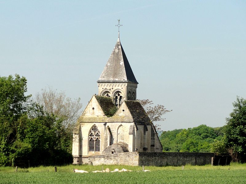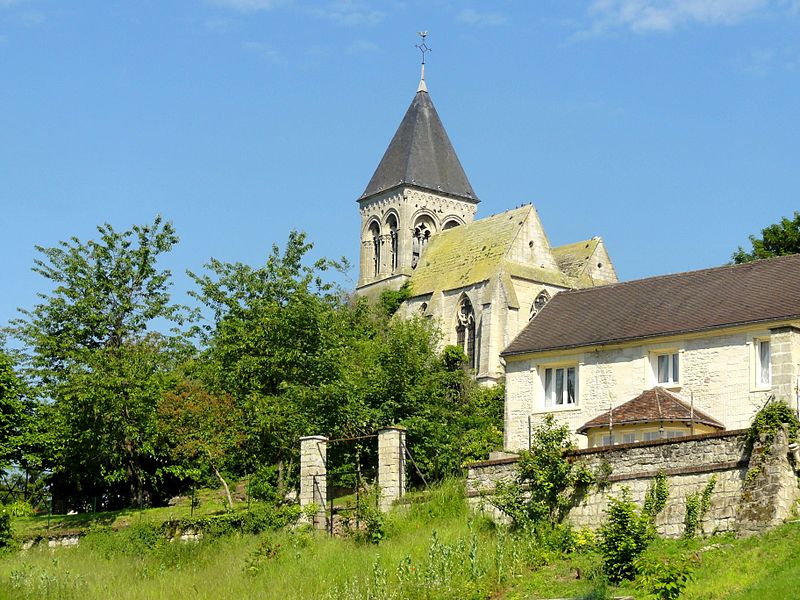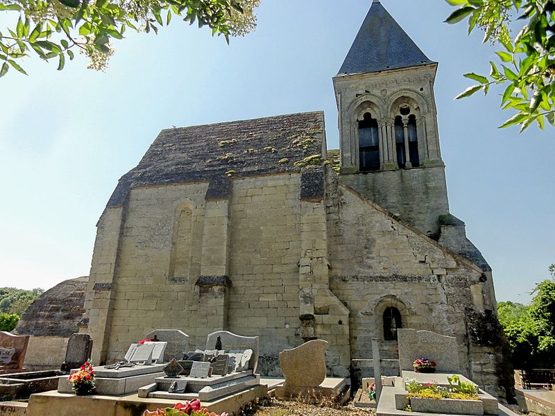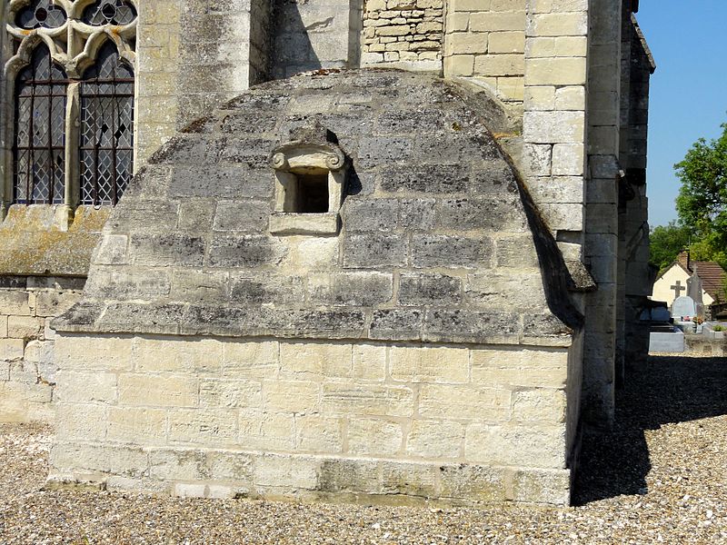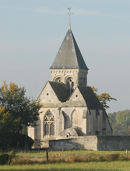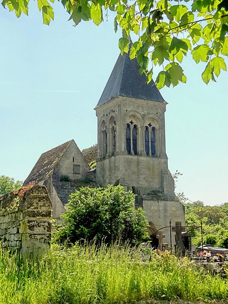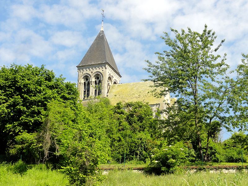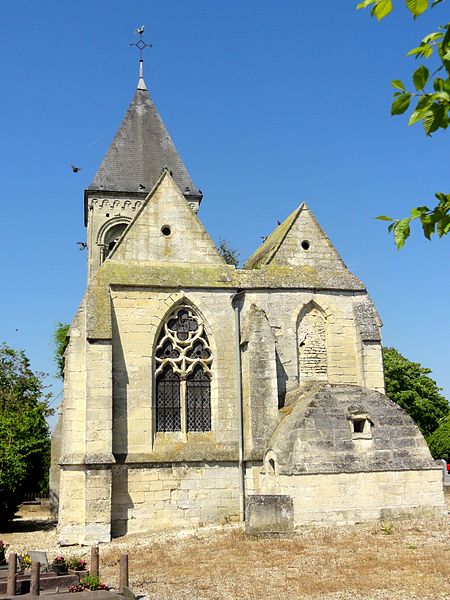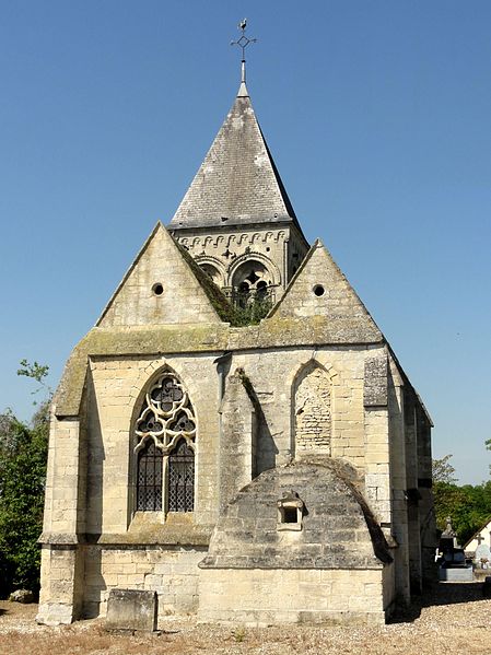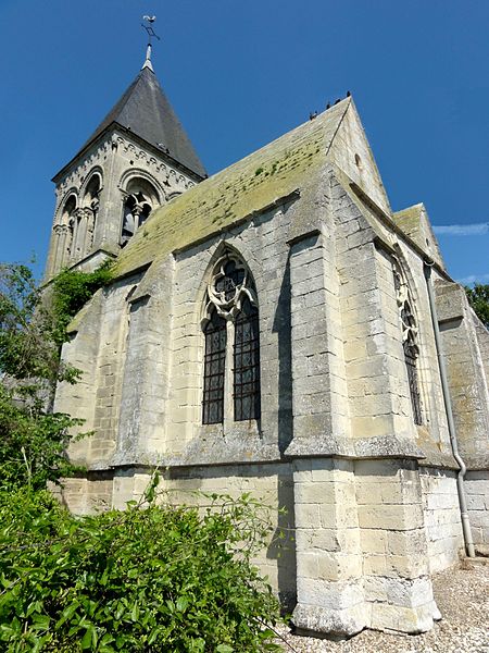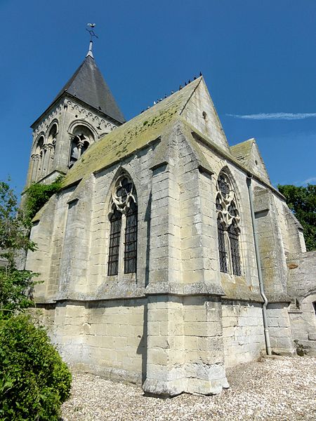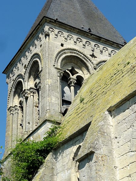 À l'extérieur, la façade occidentale est formée d'un massif plaqué contre la base du clocher, vestige de la suppression de la nef, tandis que l'étage de beffroi présente un appareillage roman soigné avec baies abat-son gémelées, colonnettes fines et tympans ajourés, surmontés d'une archivolte torique et d'une corniche beauvaisine à petites arcades. Les murs extérieurs du chœur-halle sont épaulés par des contreforts et percés de fenêtres dont le remplage est l'unique ornementation notable ; les toits en pierre, assez aigus, recouvrent les vaisseaux et la chapelle. Le clocher et certains détails architecturaux inscrivent l'église dans un type local fréquent dans la région, rapproché d'autres clochers voisins.