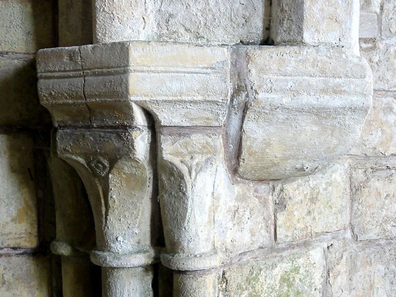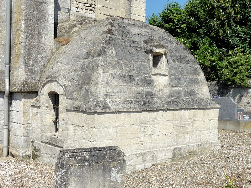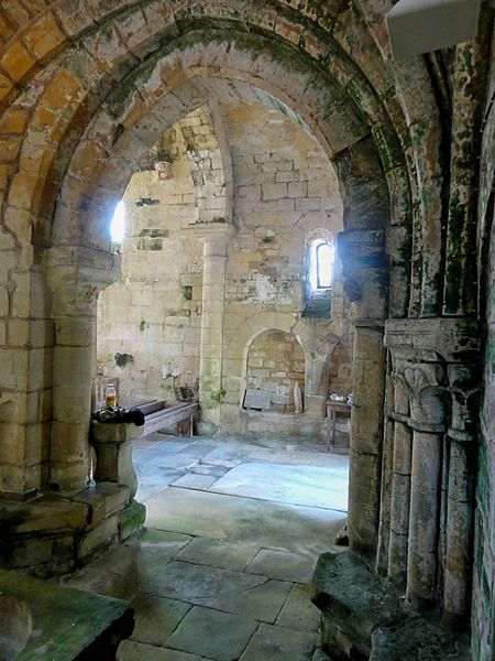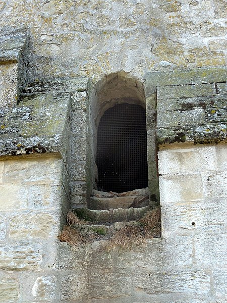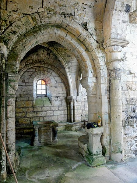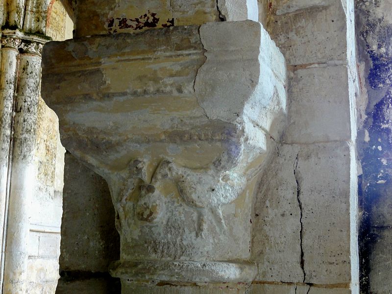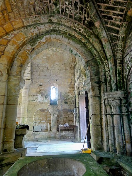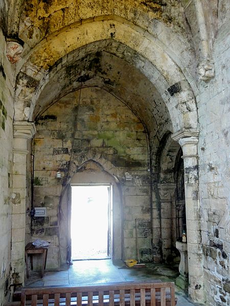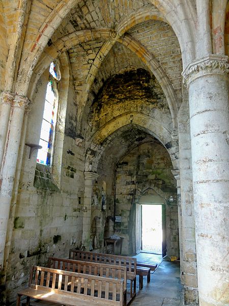 À l'intérieur, la base du clocher est voûtée en berceau brisé et communique avec le chœur par une arcade en tiers-point non moulurée ; les arcades et chapiteaux romans montrent des motifs d'oiseaux, de chiens et de colombes buvant au même vase. La chapelle présente une voûte d'ogives très basse dont les ogives et formerets retombent sur des faisceaux de trois colonnettes ; les chapiteaux arborent des rinceaux, des rameaux et des feuilles sculptées, tandis que les bases des colonnes ont été coupées pour permettre l'installation de bancs en pierre. Les fonts baptismaux, classés au titre des monuments historiques, sont en pierre calcaire de la première moitié du XIIIe siècle : une cuve octogonale à cavité hémisphérique reposant sur un socle et un sommet presque carrés, avec colonnettes d'angle ornées de chapiteaux à crochets et une frise sur la partie supérieure de la cuve.
