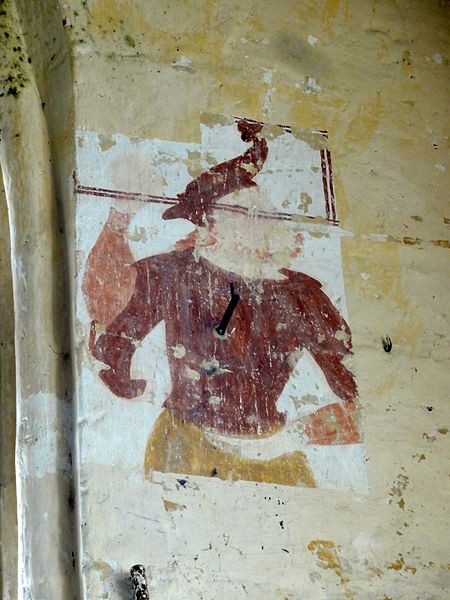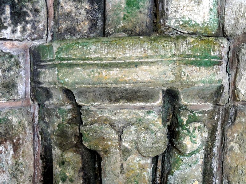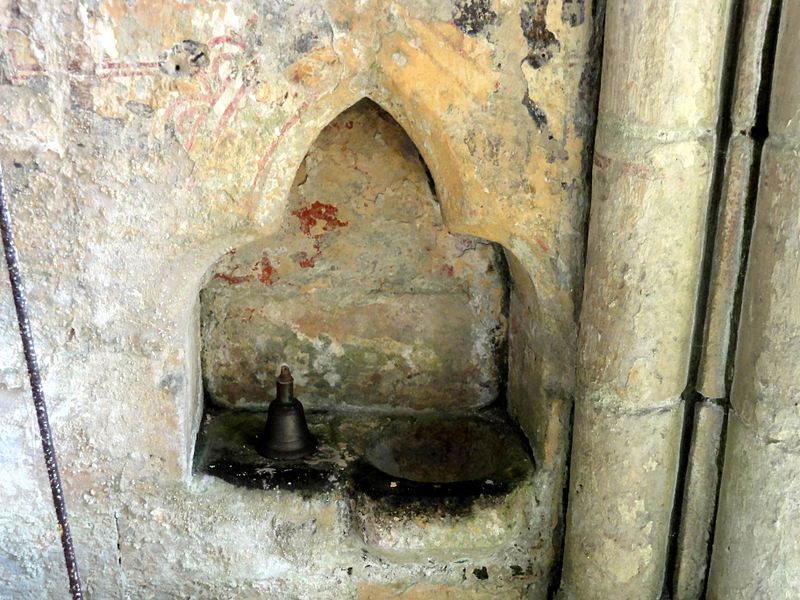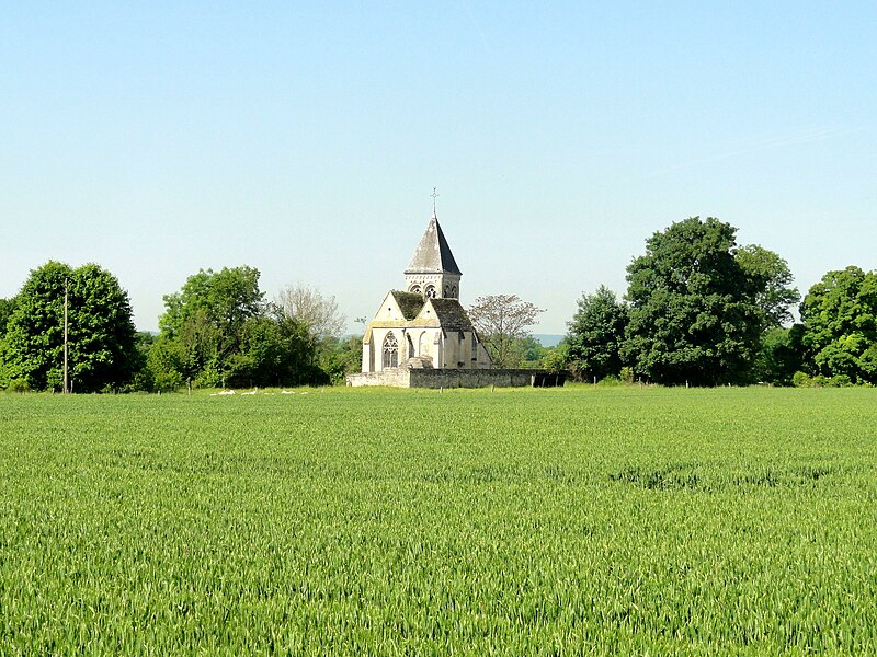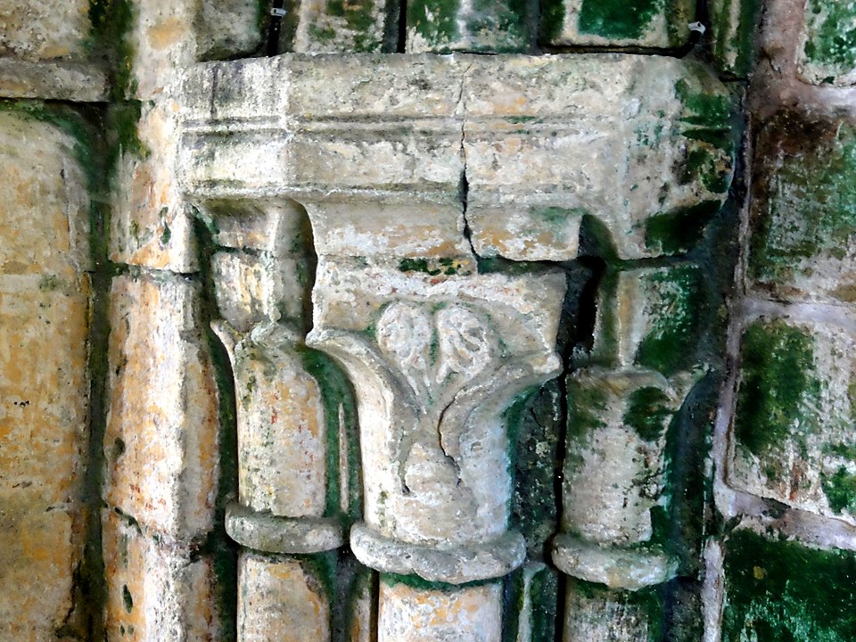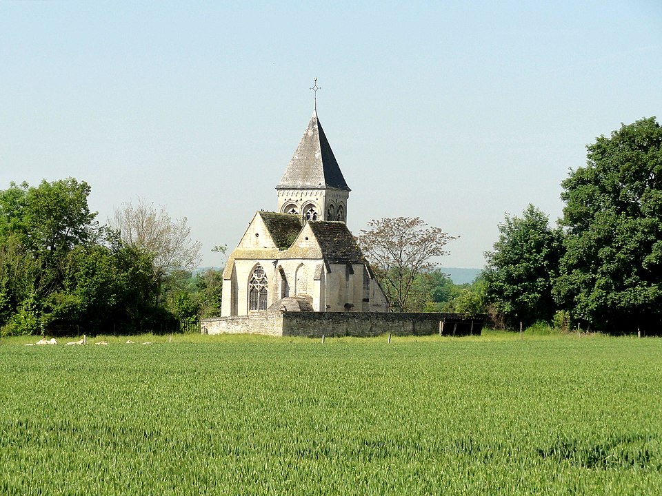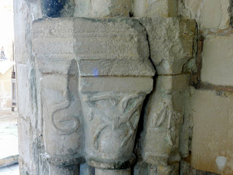 À l'intérieur, la base du clocher est voûtée en berceau brisé et communique avec le chœur par une arcade en tiers-point non moulurée ; les arcades et chapiteaux romans montrent des motifs d'oiseaux, de chiens et de colombes buvant au même vase. La chapelle présente une voûte d'ogives très basse dont les ogives et formerets retombent sur des faisceaux de trois colonnettes ; les chapiteaux arborent des rinceaux, des rameaux et des feuilles sculptées, tandis que les bases des colonnes ont été coupées pour permettre l'installation de bancs en pierre. Les fonts baptismaux, classés au titre des monuments historiques, sont en pierre calcaire de la première moitié du XIIIe siècle : une cuve octogonale à cavité hémisphérique reposant sur un socle et un sommet presque carrés, avec colonnettes d'angle ornées de chapiteaux à crochets et une frise sur la partie supérieure de la cuve.