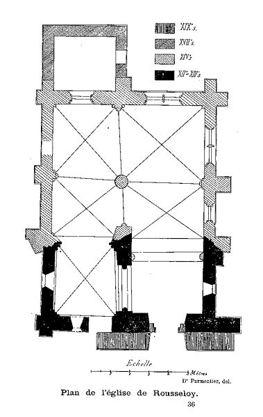 L'église Saint-Martin de Rousseloy, dans l'Oise, est une église catholique paroissiale affiliée à la paroisse Sainte-Claire de Mouy. Édifiée sur le plateau de Cambronne au-dessus du village, elle domine le paysage et n'est accessible que par un chemin escarpé depuis la route de Clermont ; le cimetière l'entoure et le versant sud descend abruptement vers l'emplacement d'une ancienne carrière. L'édifice conserve un clocher roman à la base transformée en porche, coiffé d'un toit à la hache recouvert d'ardoise, ainsi qu'une chapelle romane au nord présentant des chapiteaux décorés. Le chœur-halle gothique, daté du XIVe siècle, comprend deux vaisseaux de deux travées et constitue la majeure partie de l'église depuis la démolition de la nef en 1826 ; ces deux vaisseaux forment un ensemble approximativement carré et sont couverts par des toits indépendants en pierre. La base du clocher et la chapelle des fonts baptismaux datent du XIIe siècle, tandis que sacristie et certains aménagements remontent aux XVIIe et XIXe siècles. L'arcade entre la base du clocher et le chœur, supportée par deux colonnes toscanes, semble avoir été en partie refaite ; un massif de maçonnerie plaqué devant la façade occidentale date de la démolition de la nef. L'histoire écrite de l'édifice reste lacunaire et repose largement sur l'analyse architecturale pour la datation des différentes campagnes de construction. Au XVIIIe siècle la flèche du clocher fut abattue par la foudre, ce qui explique la configuration actuelle du toit, et au début du XIXe siècle l'église était en grand délabrement. Des constats et devis dressés en 1801 et en 1824 aboutirent à la décision municipale de démolir la nef et de vendre ses matériaux pour financer la réparation du chœur ; les travaux liés à cette décision furent réalisés entre 1825 et 1826. Le clocher fut de nouveau atteint par la foudre en 1863 et réparé en 1870. L'édifice est classé au titre des monuments historiques par arrêté du 3 mai 1927.