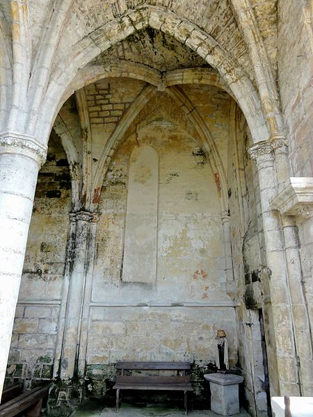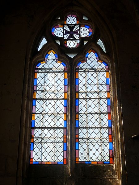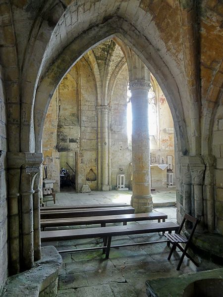 Le chœur et le collatéral forment un ensemble homogène issu d'une même campagne de construction, mais les travées sont irrégulières et le pilier central n'est pas exactement centré ; les voûtes d'ogives sont simples et les nervures retombent sur des chapiteaux de crochets s'appuyant sur des groupes de colonnettes. Quelques culs-de-lampe historiés et une niche au mur sud ainsi qu'une piscine liturgique dans le chevet du collatéral témoignent du décor sculpté. Trois fenêtres subsistantes, de largeurs différentes, se concentrent dans le vaisseau central et présentent des remplages variés avec lancettes à têtes tréflées et éléments géométriques ; des traces d'enduit et de polychromie, superposées à de plus anciennes peintures, sont encore visibles sur les voûtes et le chevet.