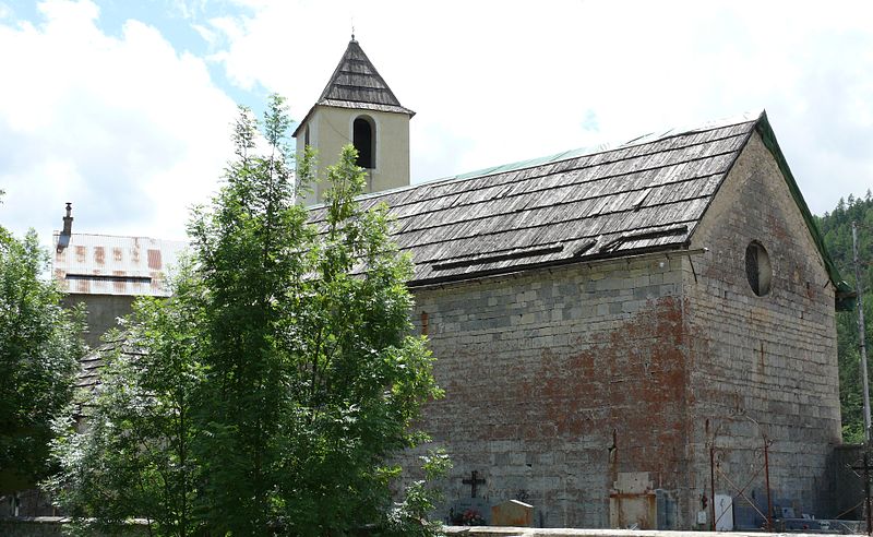 L'église Saint-Martin, à Saint-Martin-d'Entraunes dans les Alpes-Maritimes, est un édifice d'inspiration romane situé à la sortie du village, en direction du col des Champs et du col de la Cayolle. Elle se distingue par son clocher détaché, ancienne tour de garde. Jacques Thirion la décrit comme un « excellent exemple d'église alpestre élevée dans le style roman d'arrière-saison, nuancé d'éléments gothiques », ce qui permet de la dater possiblement de la seconde moitié du XIIIe siècle. Deux portes ouvrent sur la façade sud ; le portail principal, qui ne semble pas ajouté à une construction antérieure, est encadré de colonnettes et présente une voussure légèrement brisée appareillée en rouleaux avec un triple ressaut. Les consoles et chapiteaux du portail, sculptés de figures, crochets et boutons, appartiennent à un style qui n'est pas antérieur à la fin du XIVe siècle, et les claveaux supérieurs de l'archivolte portent des motifs (croissant, soleil, glaive cruciforme) qui ont conduit à une attribution templière souvent jugée abusive. Des portails comparables existent en Ubaye et en Briançonnais, ce qui conduit à envisager soit une origine à la fin du XIIIe siècle avec des embellissements au début du XVe siècle, soit une datation complète au début du XVe. Certaines petites fenêtres romanes ont été élargies en percements rectangulaires. L'église est composée d'une nef unique de quatre travées, couverte en berceau, avec une abside semi-circulaire voûtée en cul-de-four. Le toit, en bardeaux de mélèze, a été restauré en 1958. Des peintures murales réalisées vers 1600 ont été mises au jour en 1921 ; elles représentent saint Jean-Baptiste, saint Blaise et saint Roch, et l'intrados de l'arc porte la représentation du Père éternel bénissant de la main gauche, iconographie rare. L'édifice est inscrit au titre des monuments historiques le 15 mai 1926. Le mobilier comprend une croix de procession, un retable avec une Vierge de Miséricorde et un bénitier ; le polyptyque de la Vierge du Rosaire, signé François Bréa et daté de 1555, est divisé en dix compartiments.